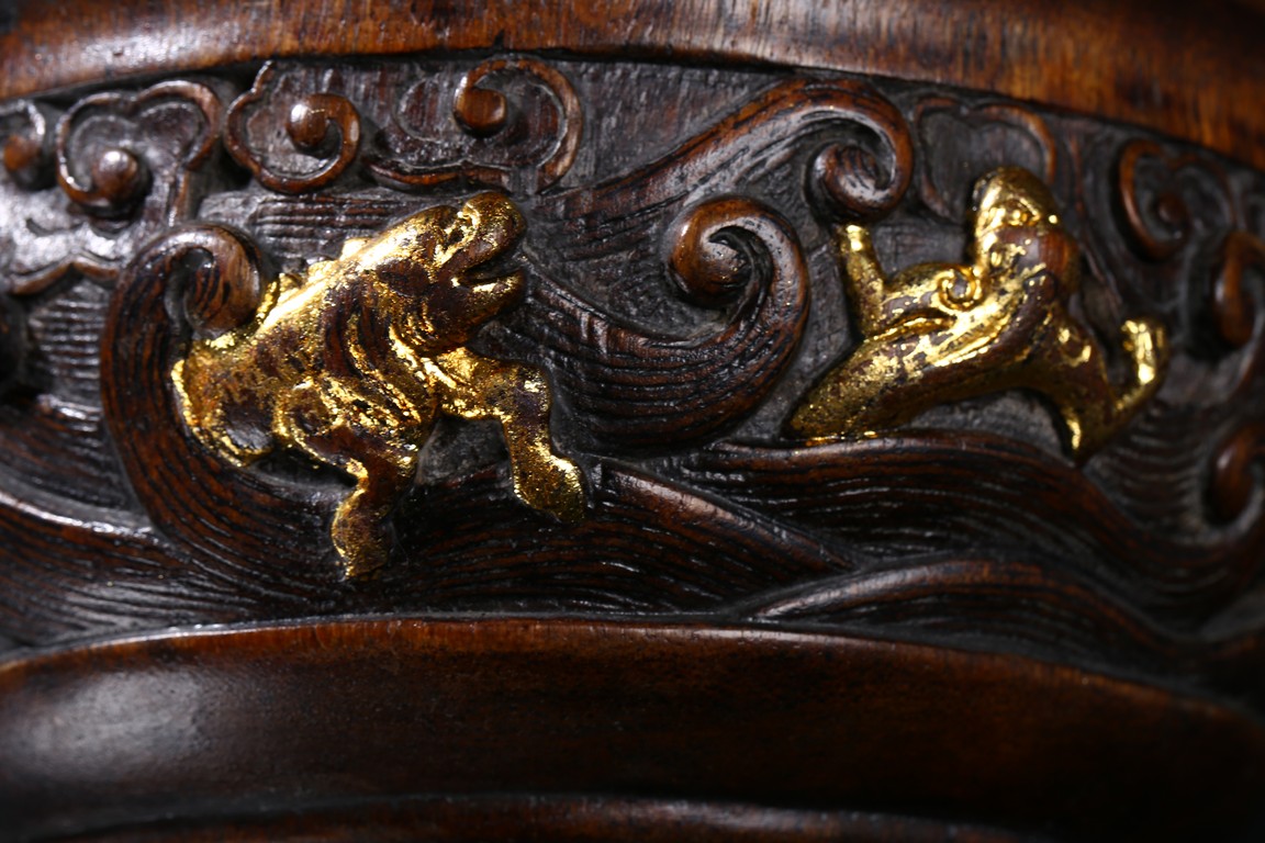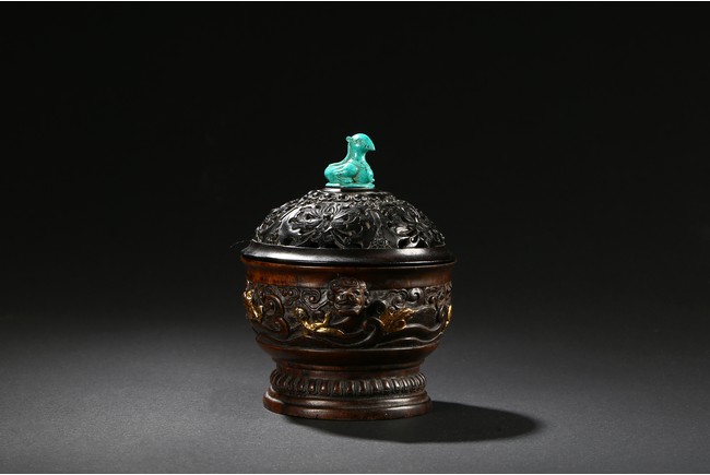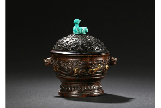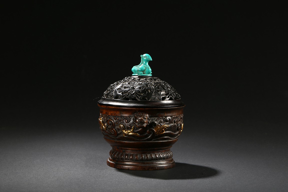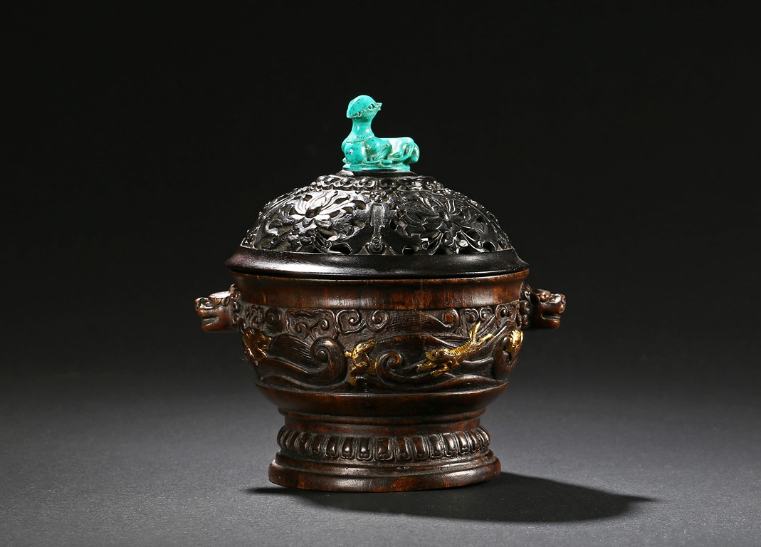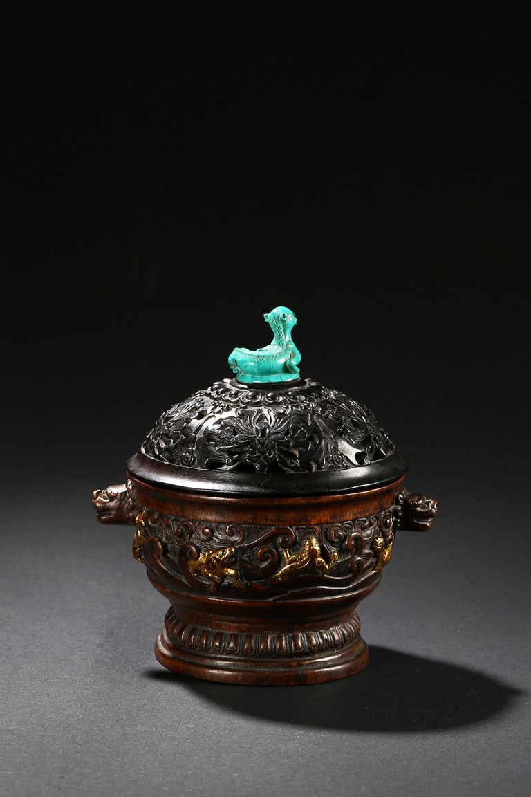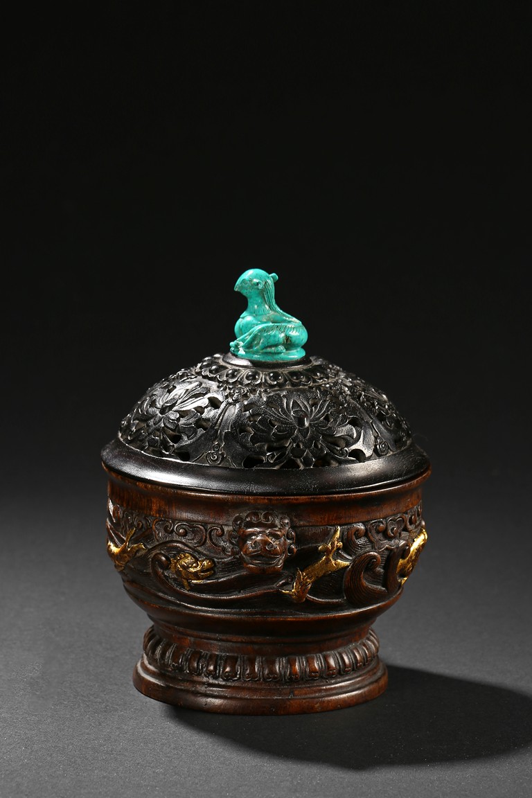 The aloeswood censer well-carved to the exterior with eight ocean mythical beasts in turbulent waves painted in gilt, the sea waves finely detailed with incised lines, with two lion-mask handles carved to both sides, supported on lotus petal feet, fitted with a later carved zitan cover surmounted with a turquoise carved finial. Qing Dynasty period.