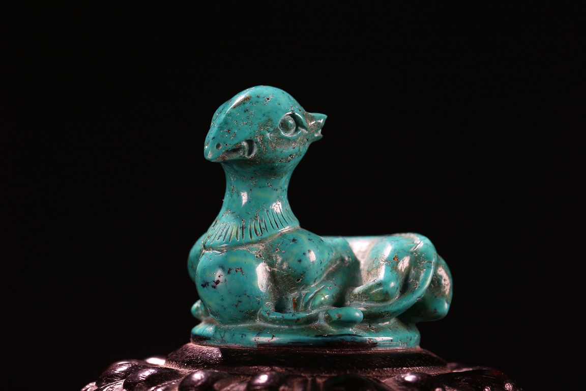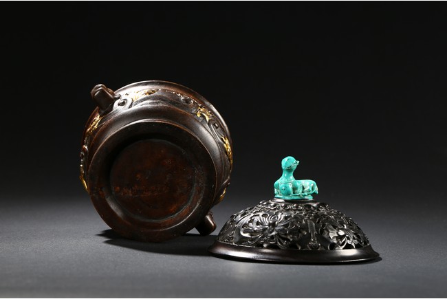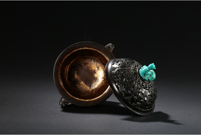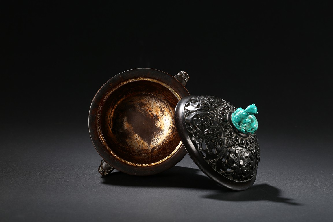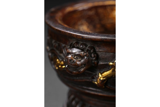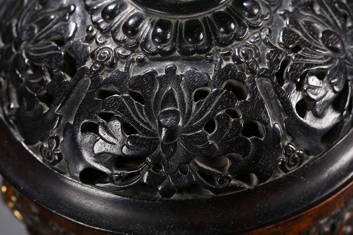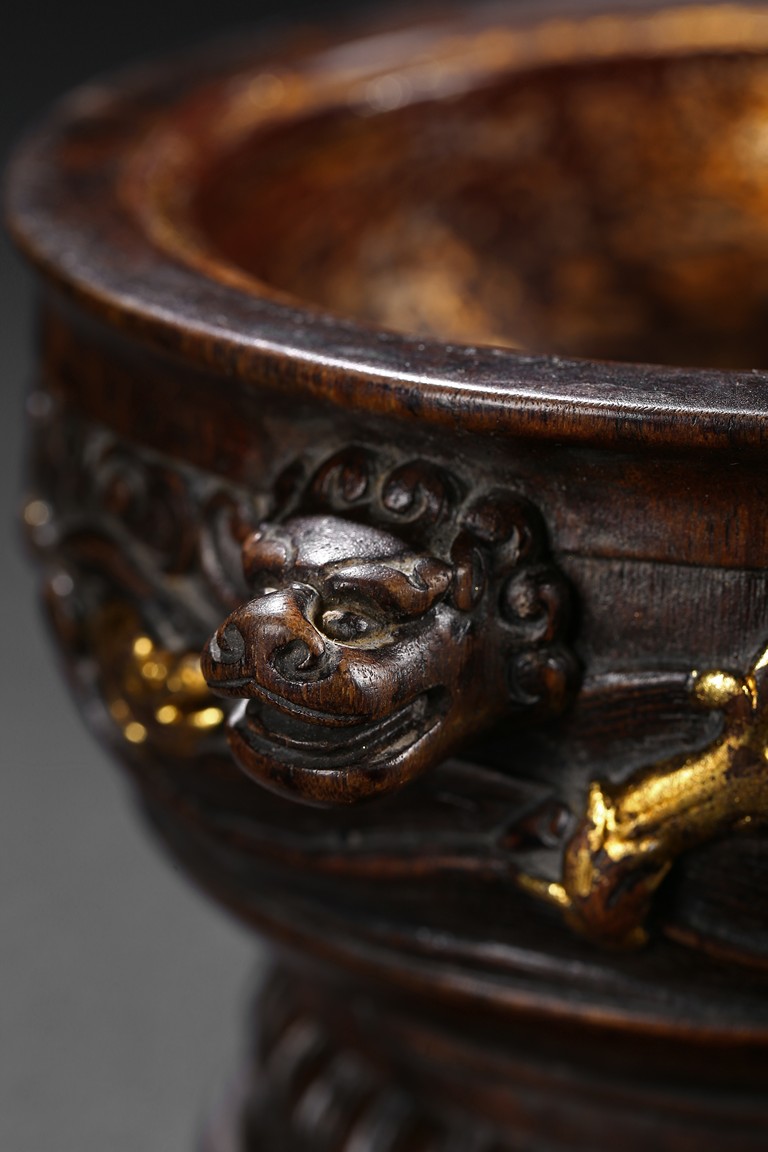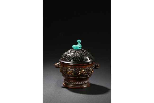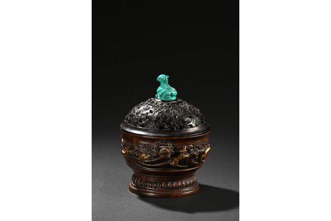 The aloeswood censer well-carved to the exterior with eight ocean mythical beasts in turbulent waves painted in gilt, the sea waves finely detailed with incised lines, with two lion-mask handles carved to both sides, supported on lotus petal feet, fitted with a later carved zitan cover surmounted with a turquoise carved finial. Qing Dynasty period.