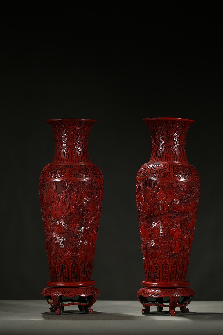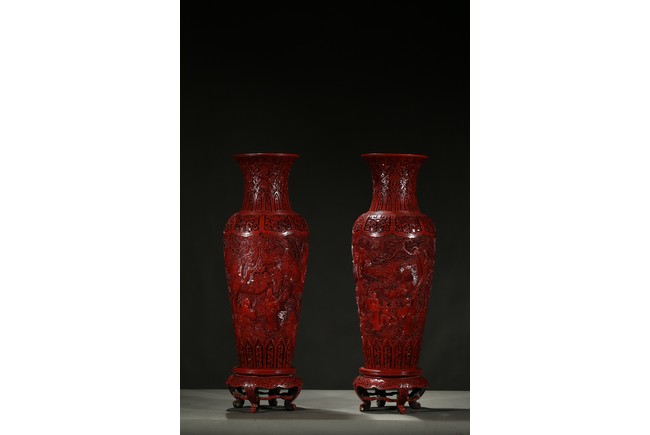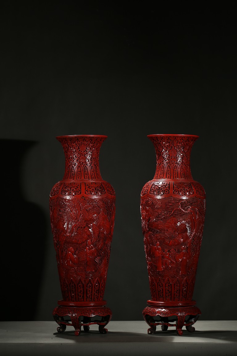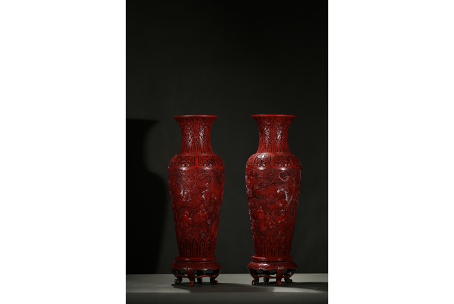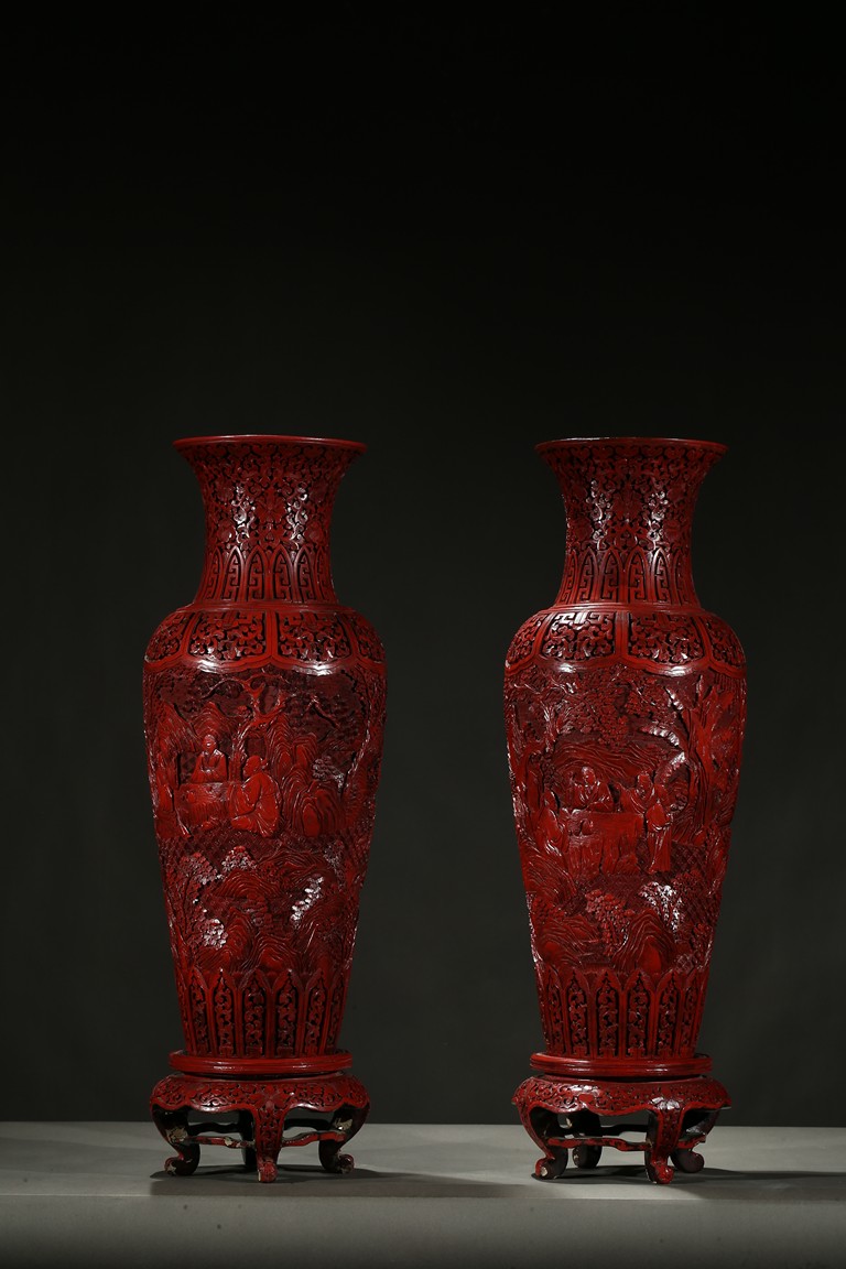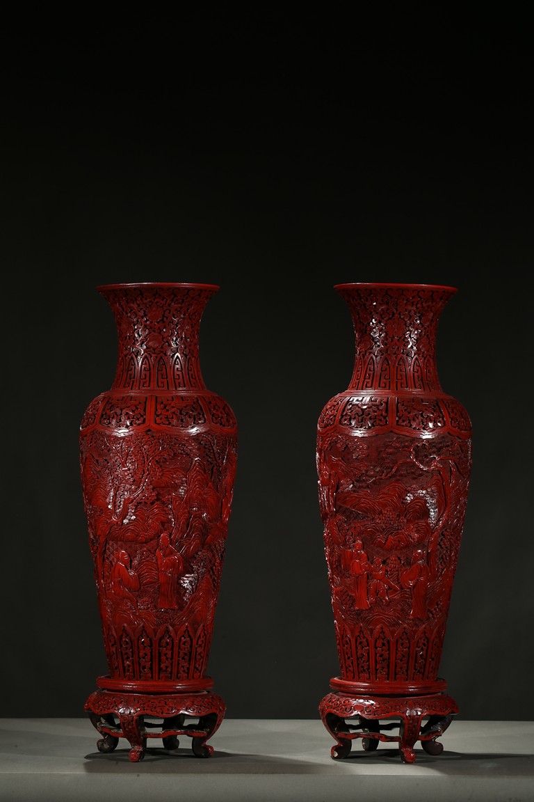 可參考一極類似乾隆款剔紅雕人物對瓶, 2015年3月上拍于三藩市邦瀚斯拍賣行,拍品號7115 Please refer to a very similar cinnabar lacquer vases, auctioned in Bonham's San Francisco on June 23, 2015, Lot 7115