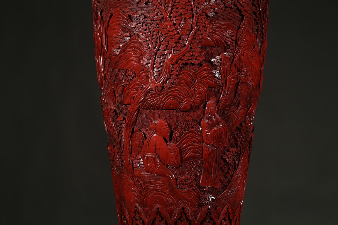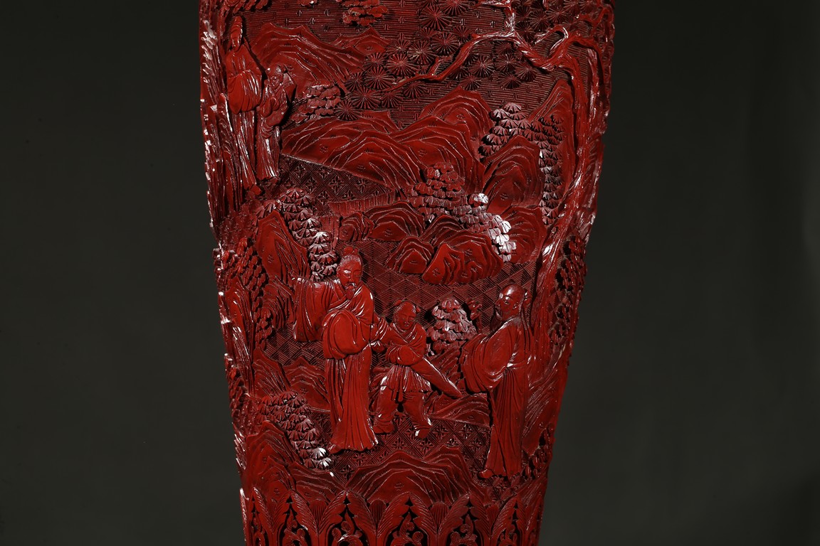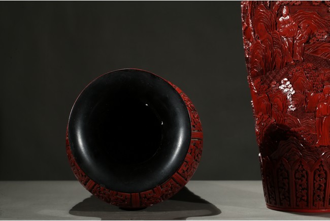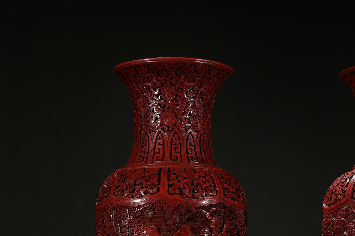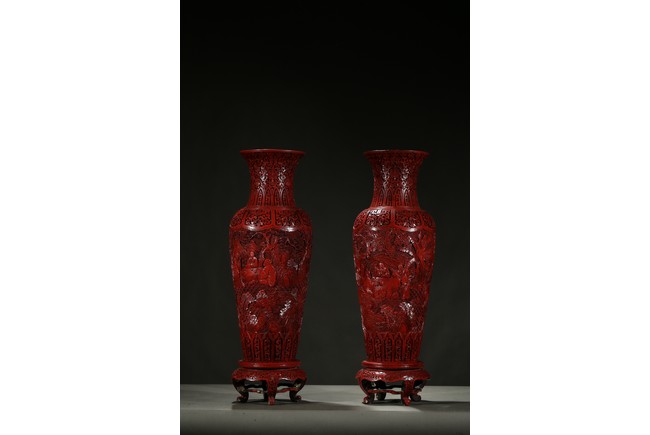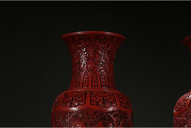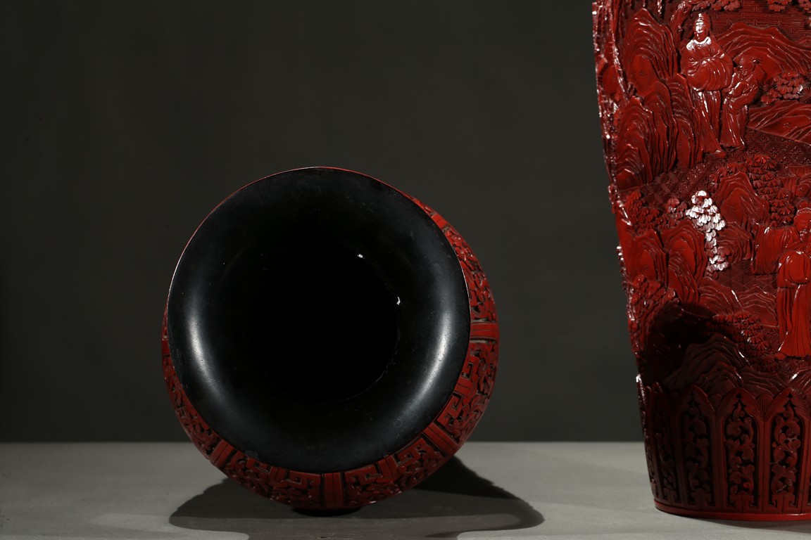 可參考一極類似乾隆款剔紅雕人物對瓶, 2015年3月上拍于三藩市邦瀚斯拍賣行,拍品號7115 Please refer to a very similar cinnabar lacquer vases, auctioned in Bonham's San Francisco on June 23, 2015, Lot 7115