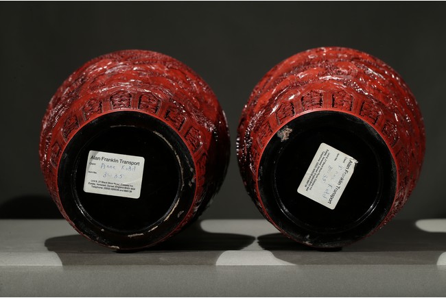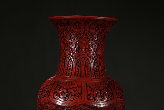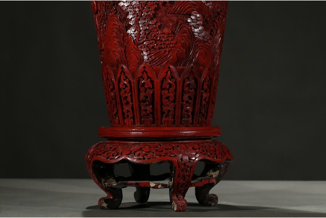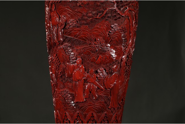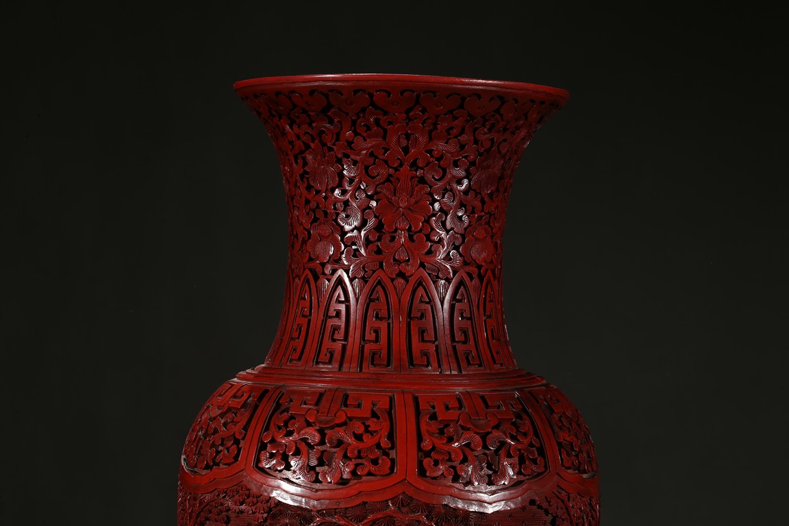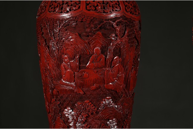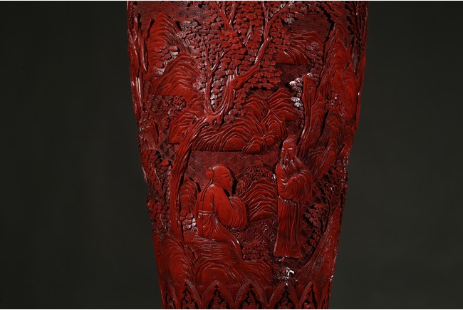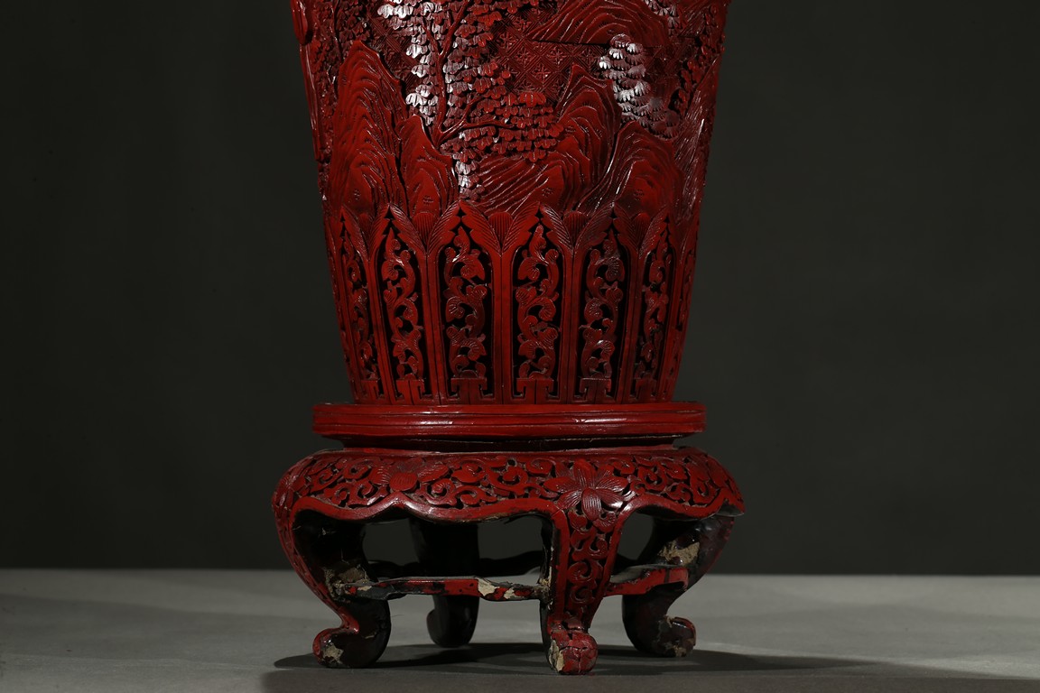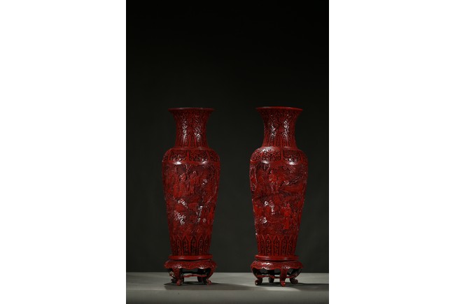 可參考一極類似乾隆款剔紅雕人物對瓶, 2015年3月上拍于三藩市邦瀚斯拍賣行,拍品號7115 Please refer to a very similar cinnabar lacquer vases, auctioned in Bonham's San Francisco on June 23, 2015, Lot 7115