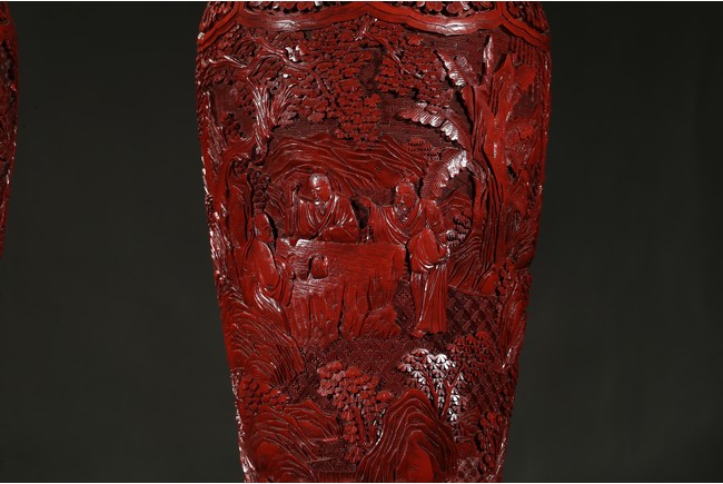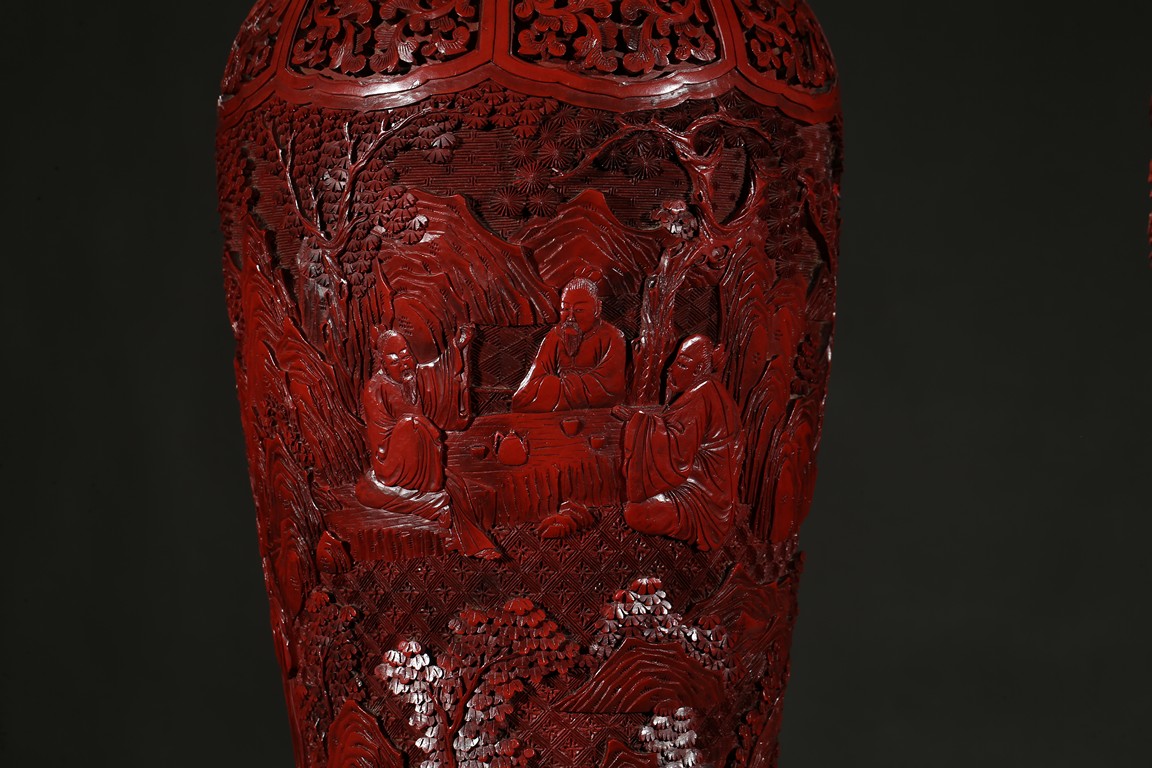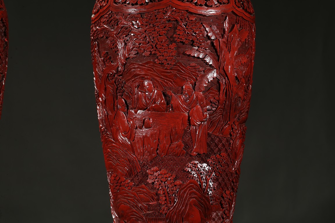 Each carved in high relief with bands of squared C-scrolls combined with lotus and peony flowers on curling leaves around the neck and chrysanthemums in the lappet reserves on the shoulder, their elongated bodies delicately carved with related scenes of scholars and attendants walking through the retreats, some playing the qin or weiqi while attendant carry musical instruments or a bag of scrolls; the lower body of each carved with a tall band of strapwork and flowered lappets, a layer of black lacquer finishing the interior. Qing Dynasty period.