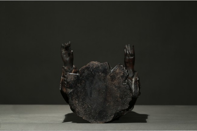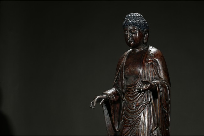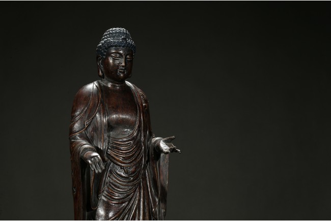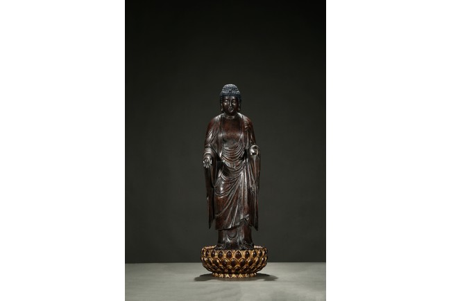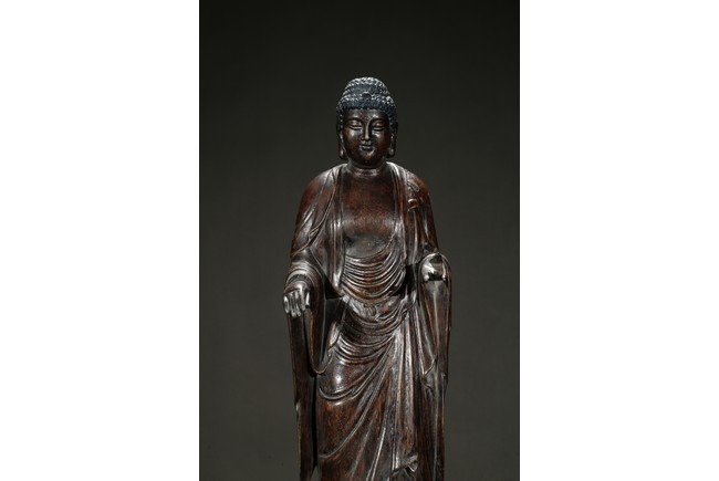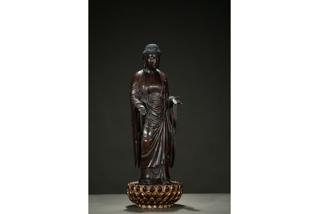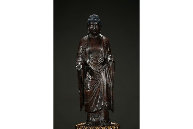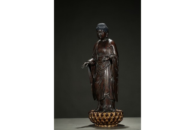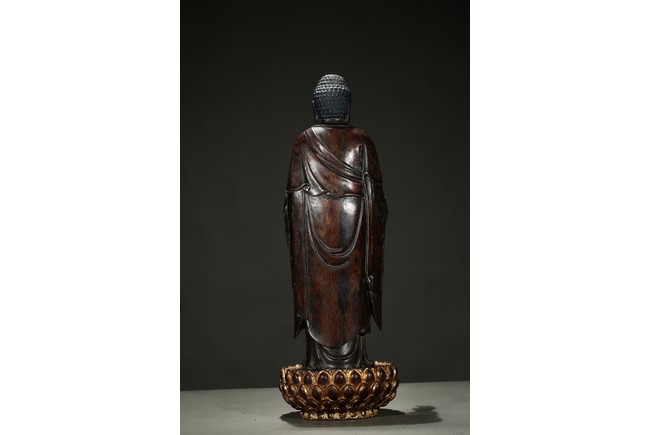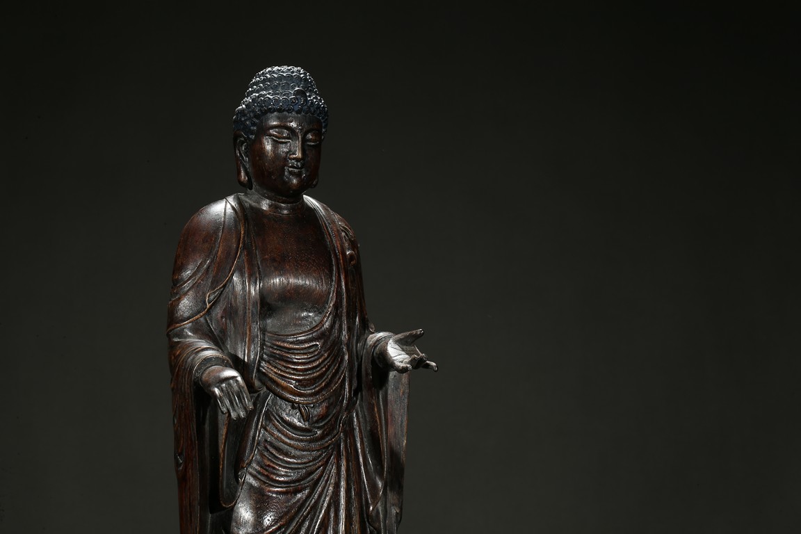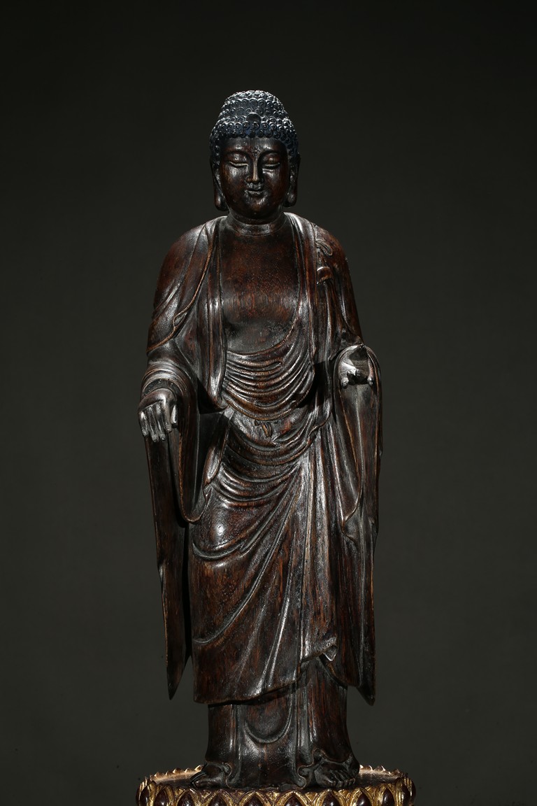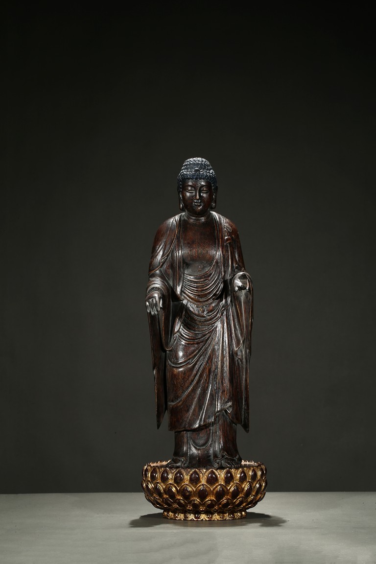 The large aromatic aloeswood carved in the form of a standing bodhisattva on a separately carved gilt lotus-base in samabhanga, his hands vitarka mudra, wearing a pleated monk's robe, his face with serene expression. Republic period.
