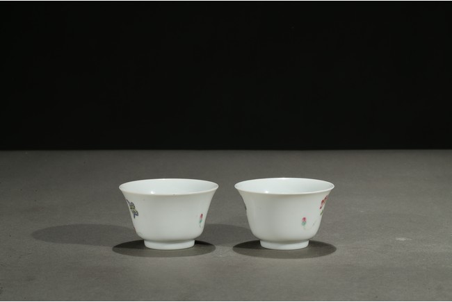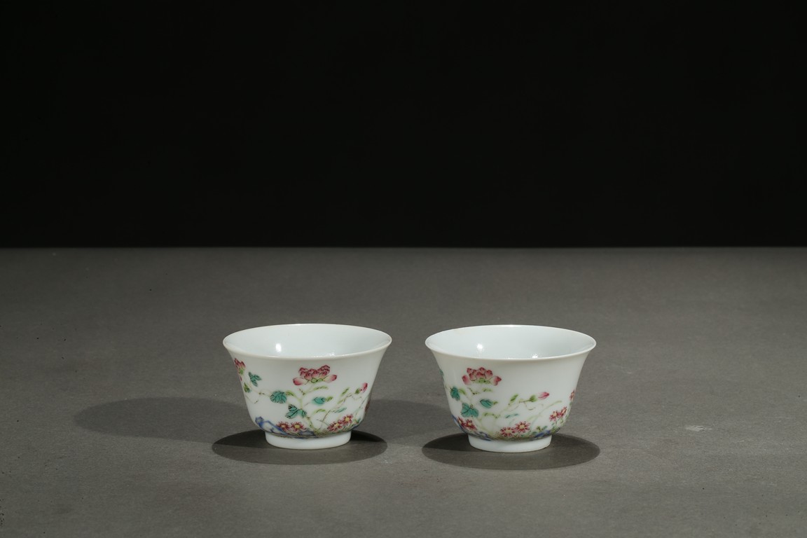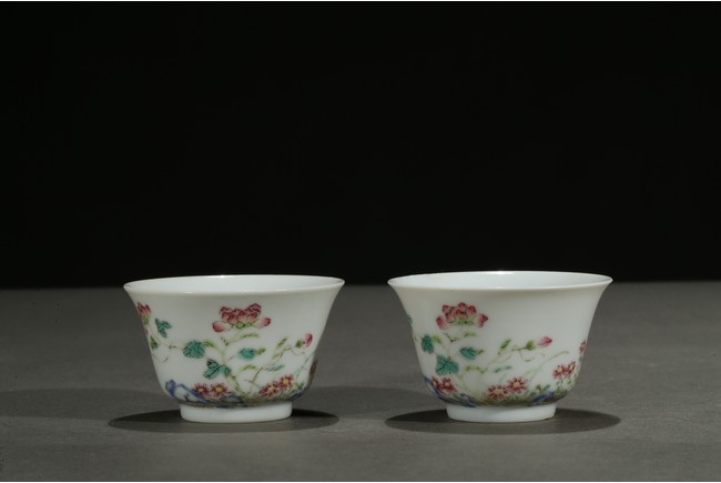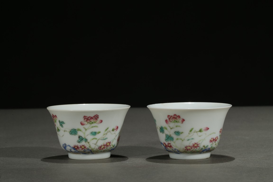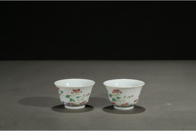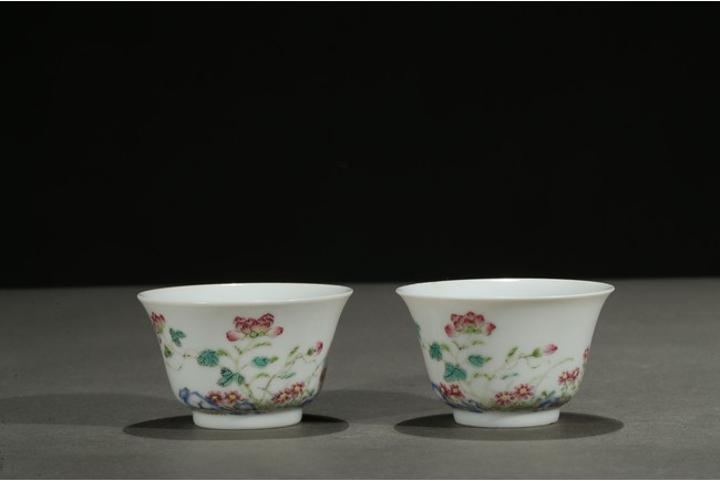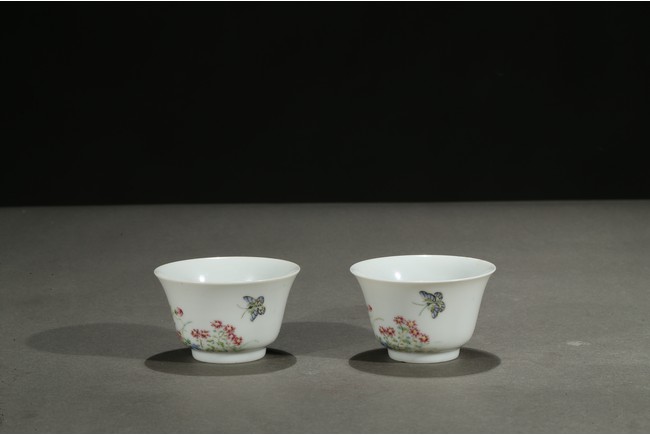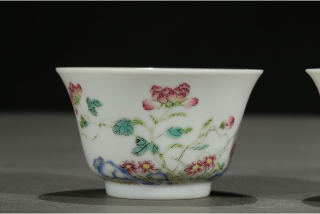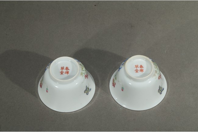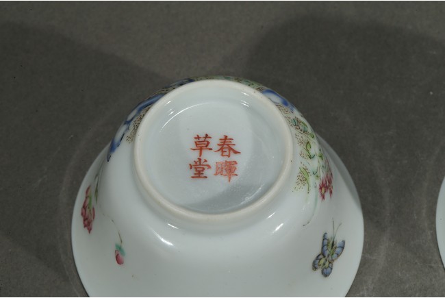 Each cup rising to a flared rim, the body enamelled with a continuous scene of leafy peonies issuing from rocky outcrops with flying butterfly. The base with a four character mark 'Chun Hui Cao Tang'. Qing Dynasty period.