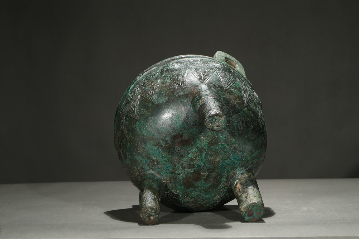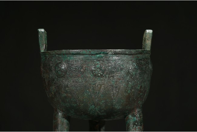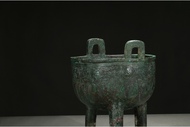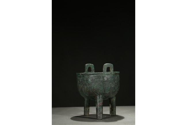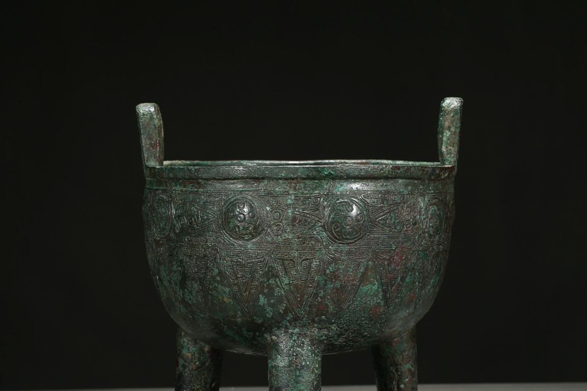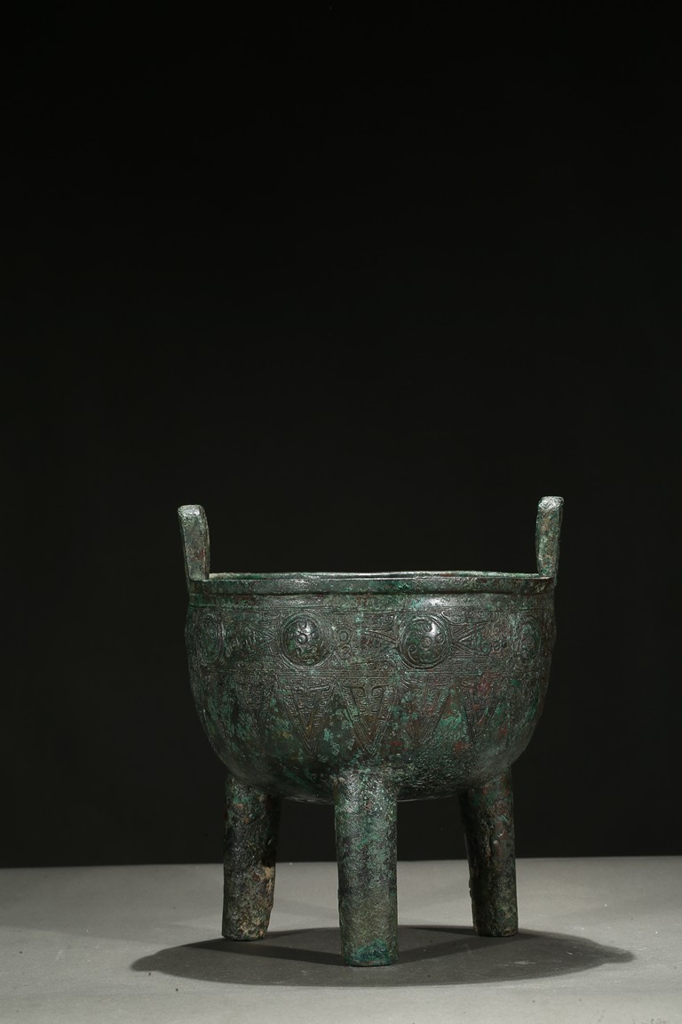 Of rounded body, the exterior cast with a frieze of alternating whorls and cicada against leiwen above band of triangular cicada blades ,supported on three straight columnar legs. Late Shang Dynasty period.