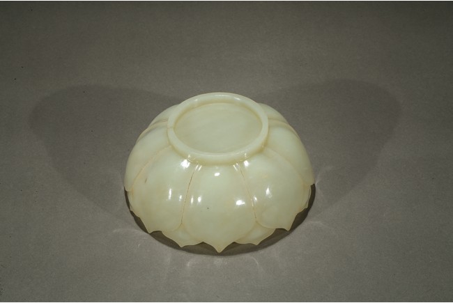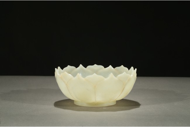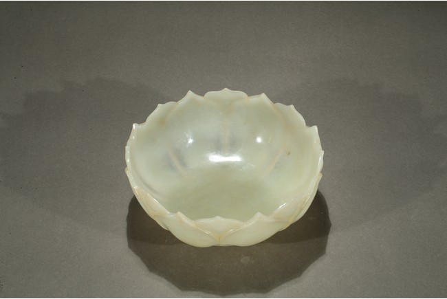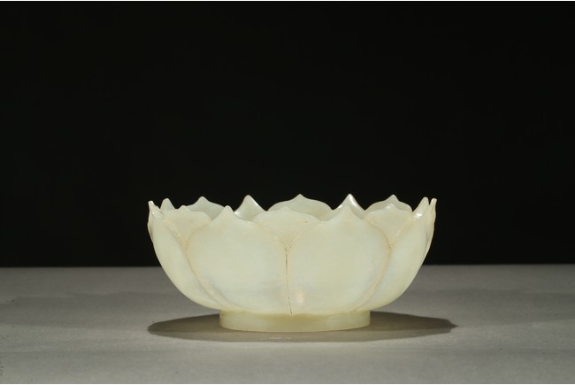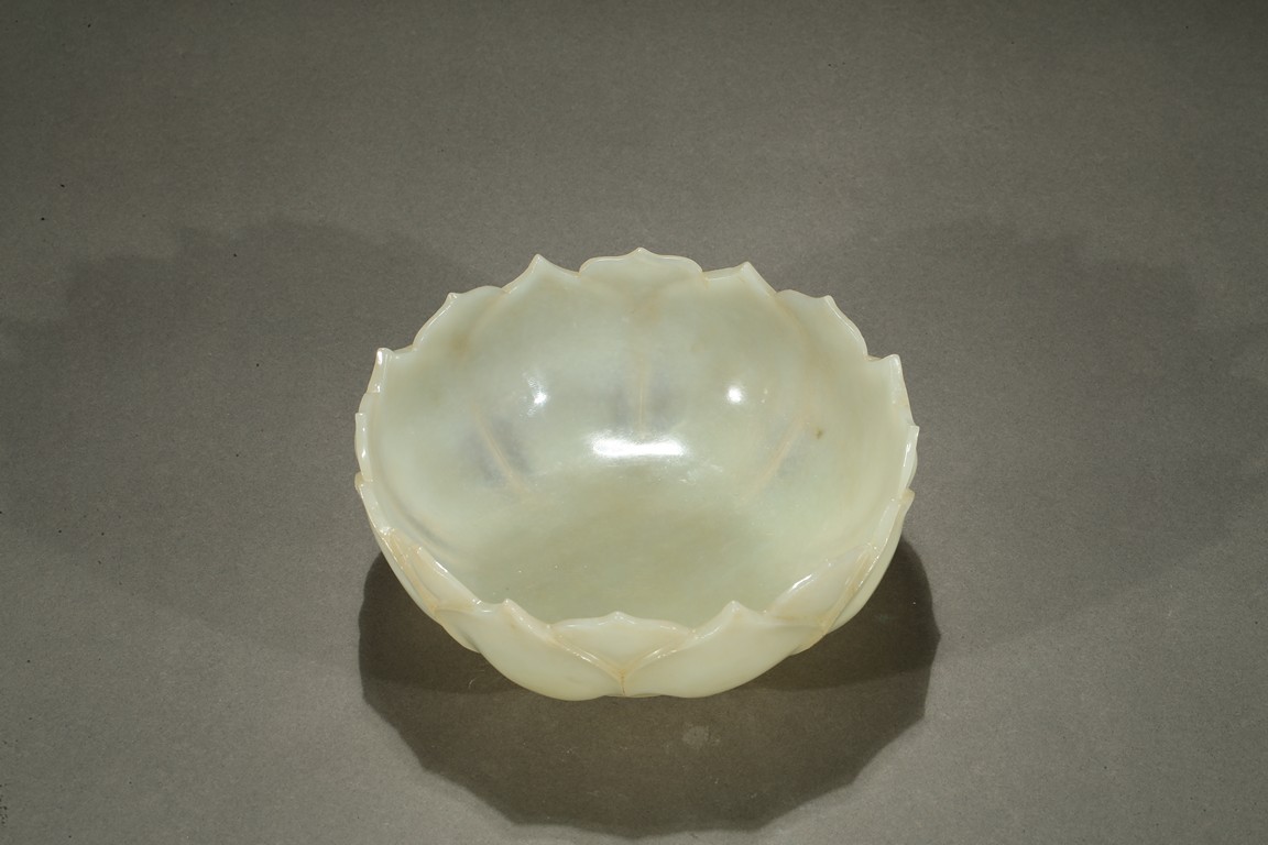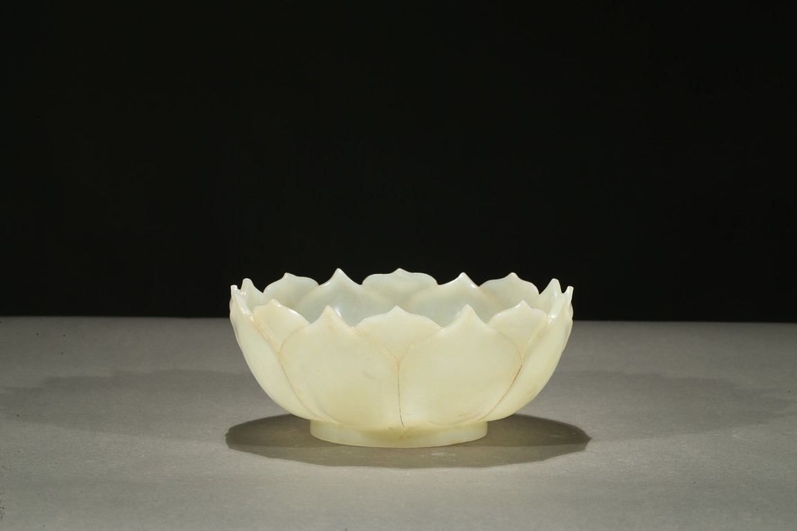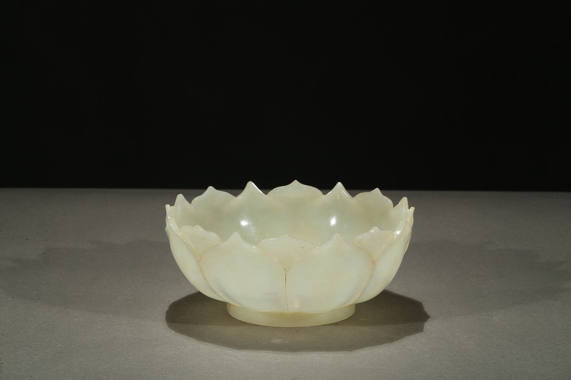 Carved in the form of a lotus blossom, the everted sides rising from base, formed from two overlapping rows of pointy petals radiating around center, the smoothly polished stone of a pale celadon white color with russet veins. Qing Dynasty period.