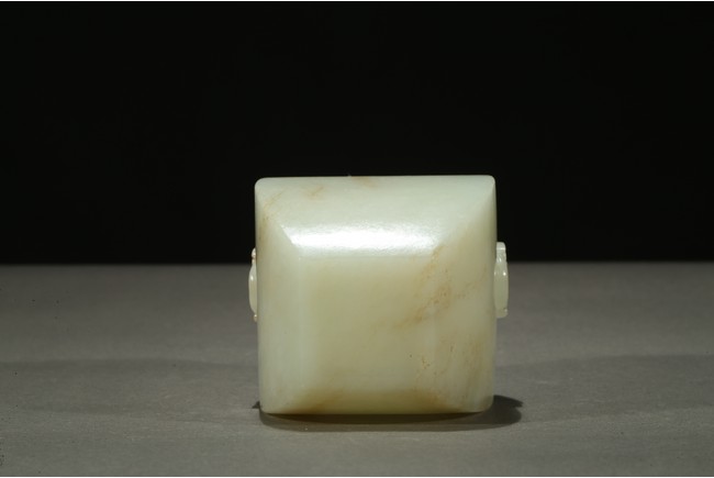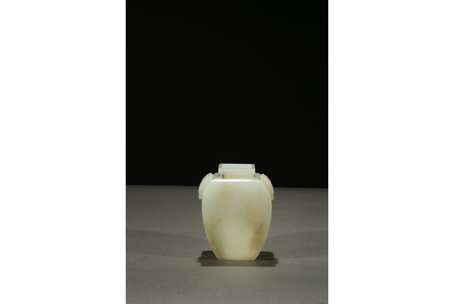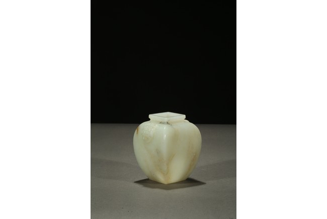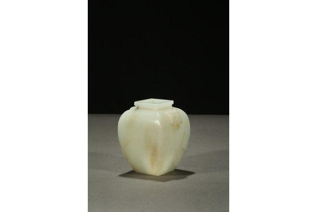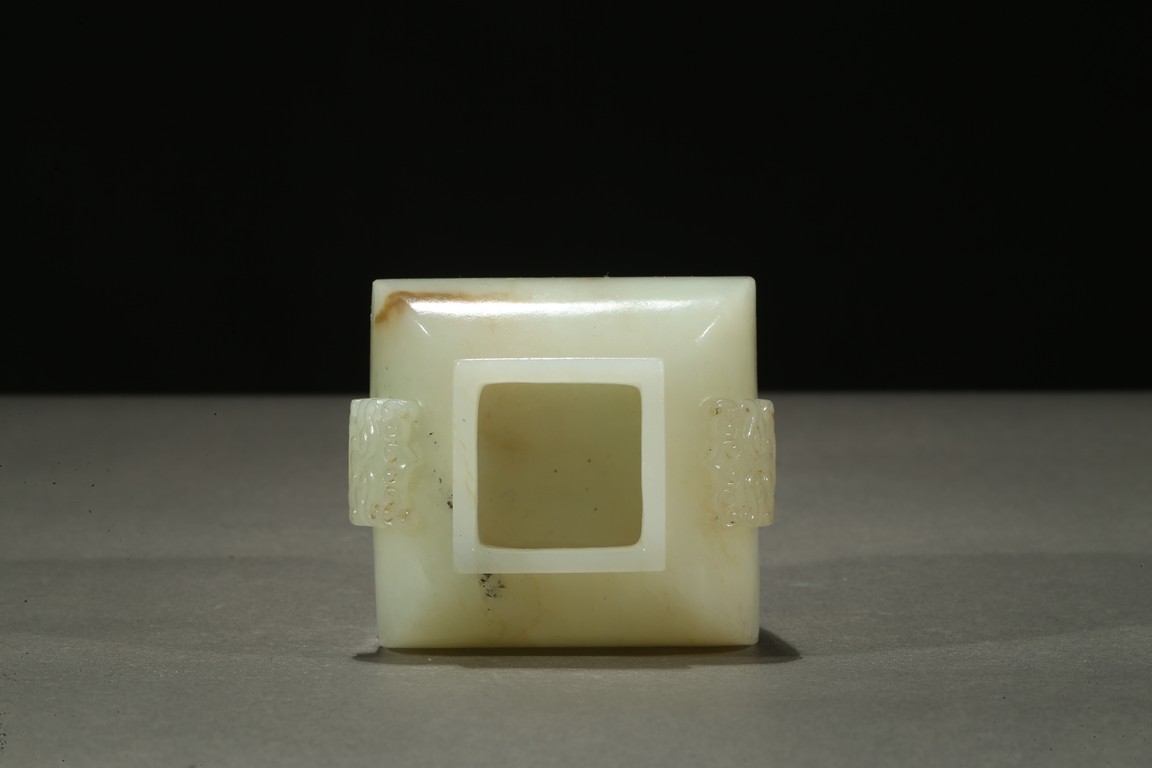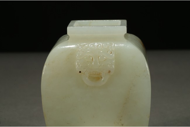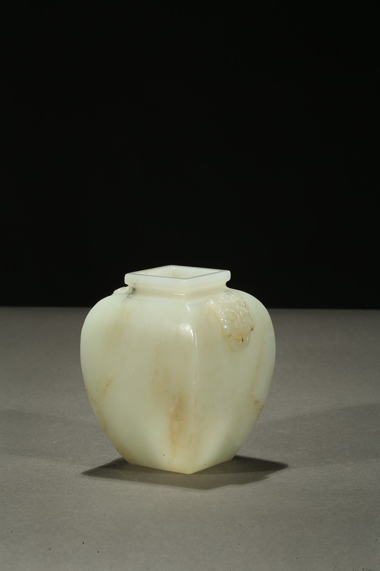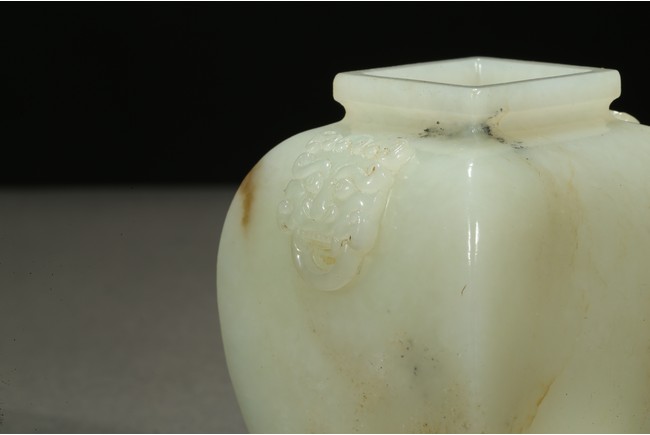 The jade jar is carved with a square mouth, the high shoulder with two mythical beast masks to each side. Qing Dynasty period.