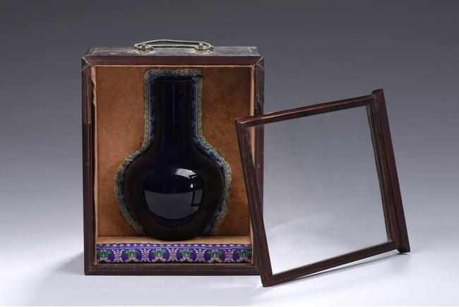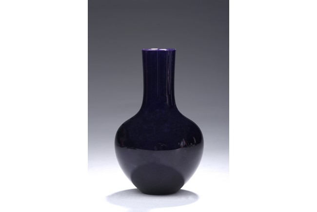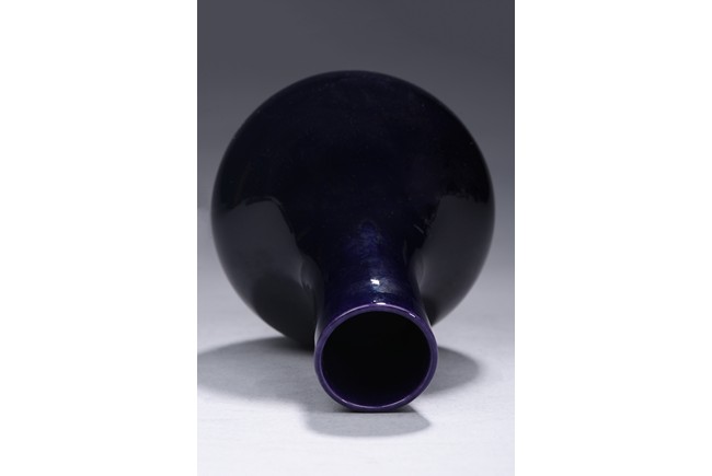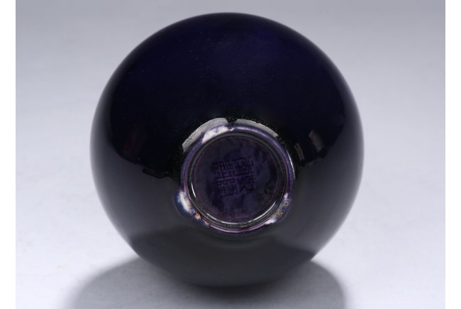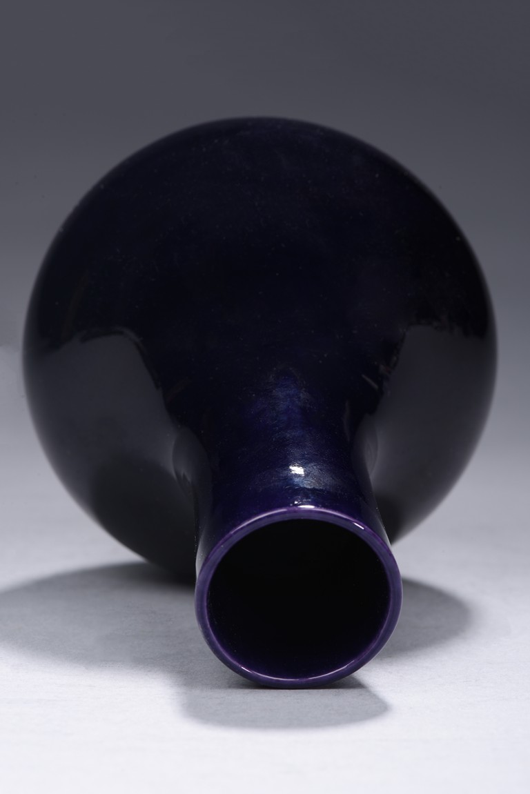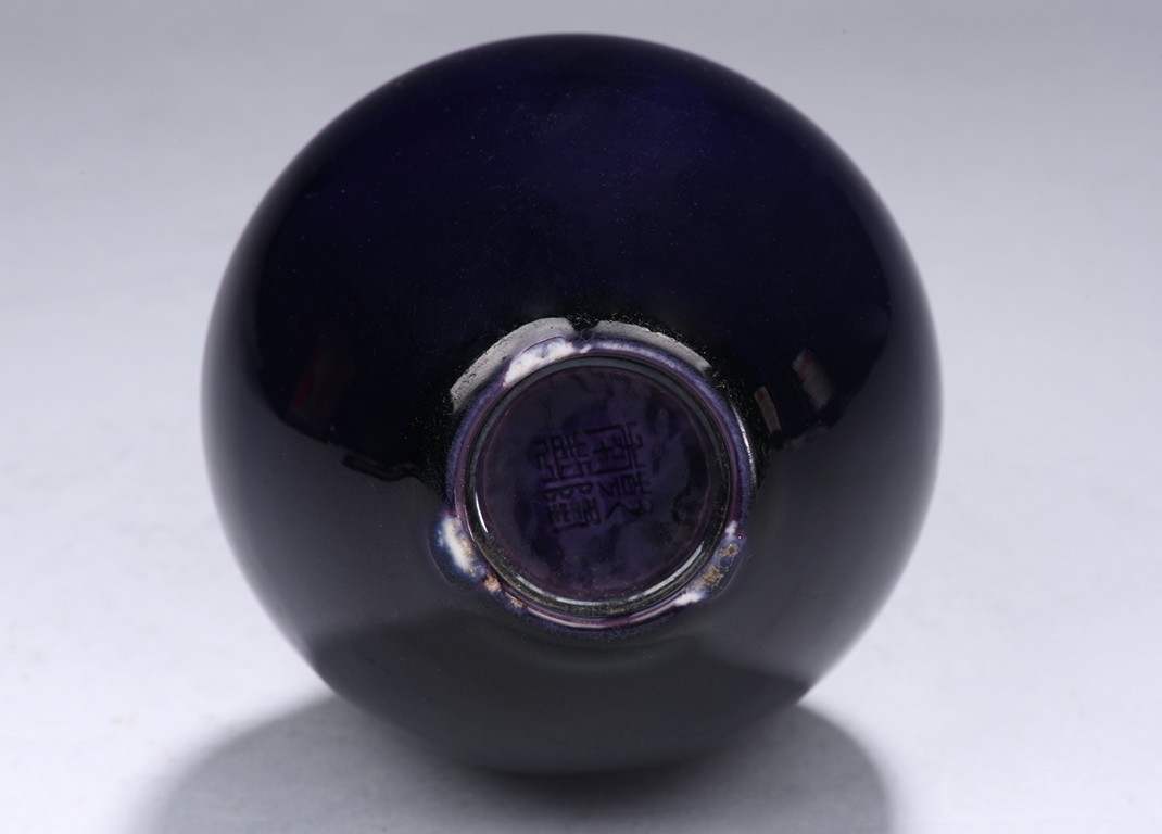 The globular body rising from a recessed base to a tall cylindrical neck, covered overall with a polished dark blue glaze, the base inscribed with the four character mark. Qing Dynasty Qianlong period.