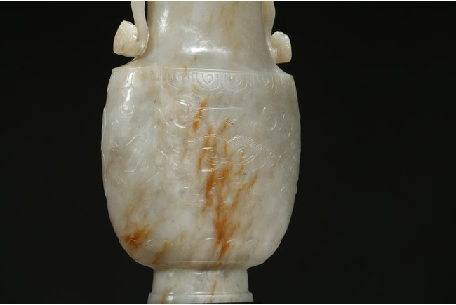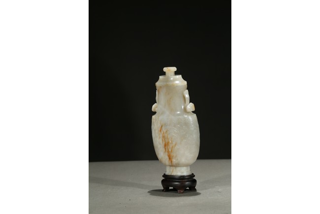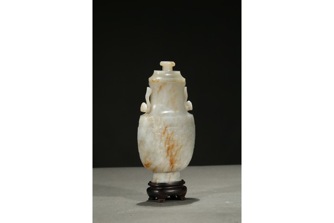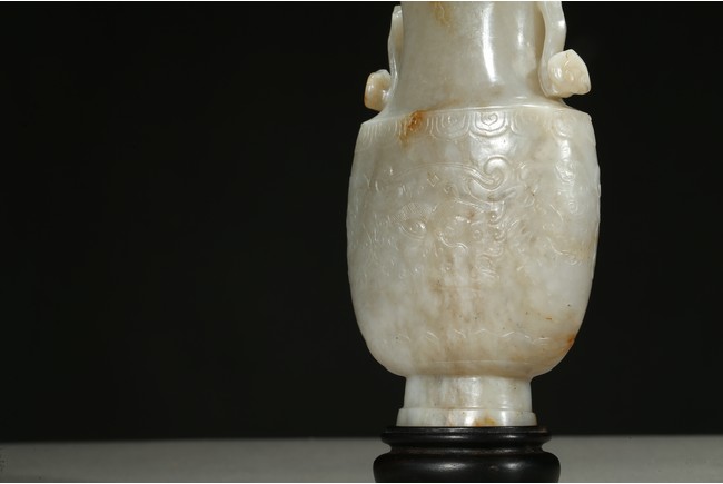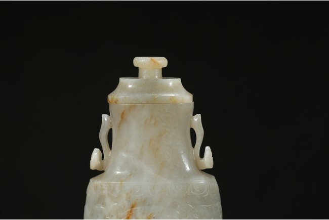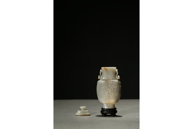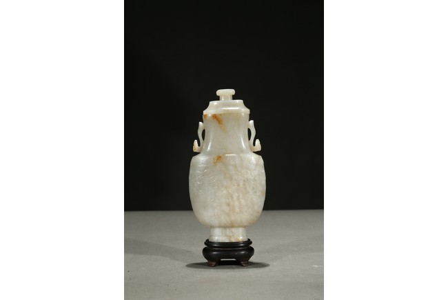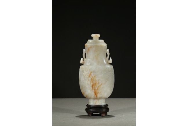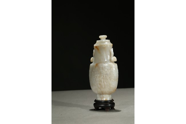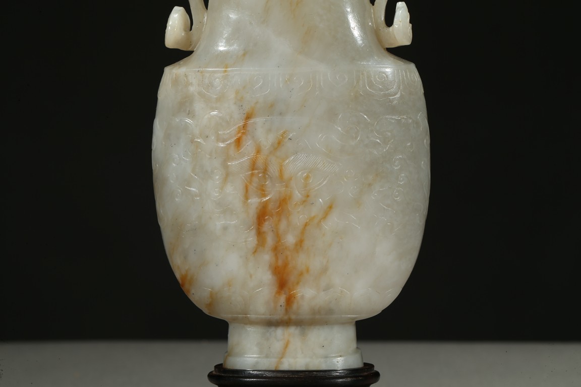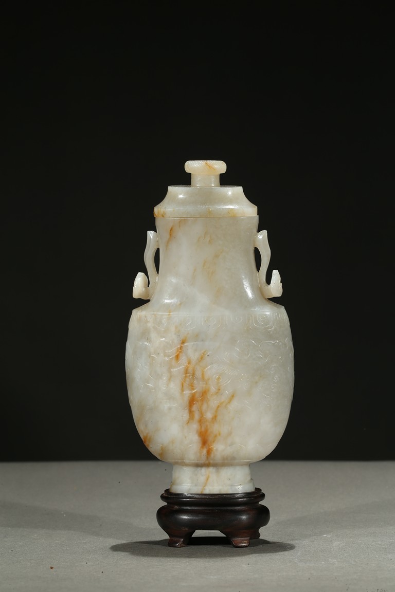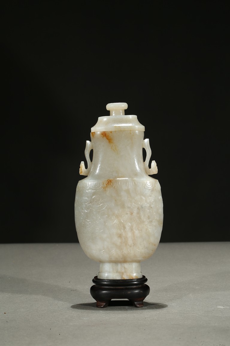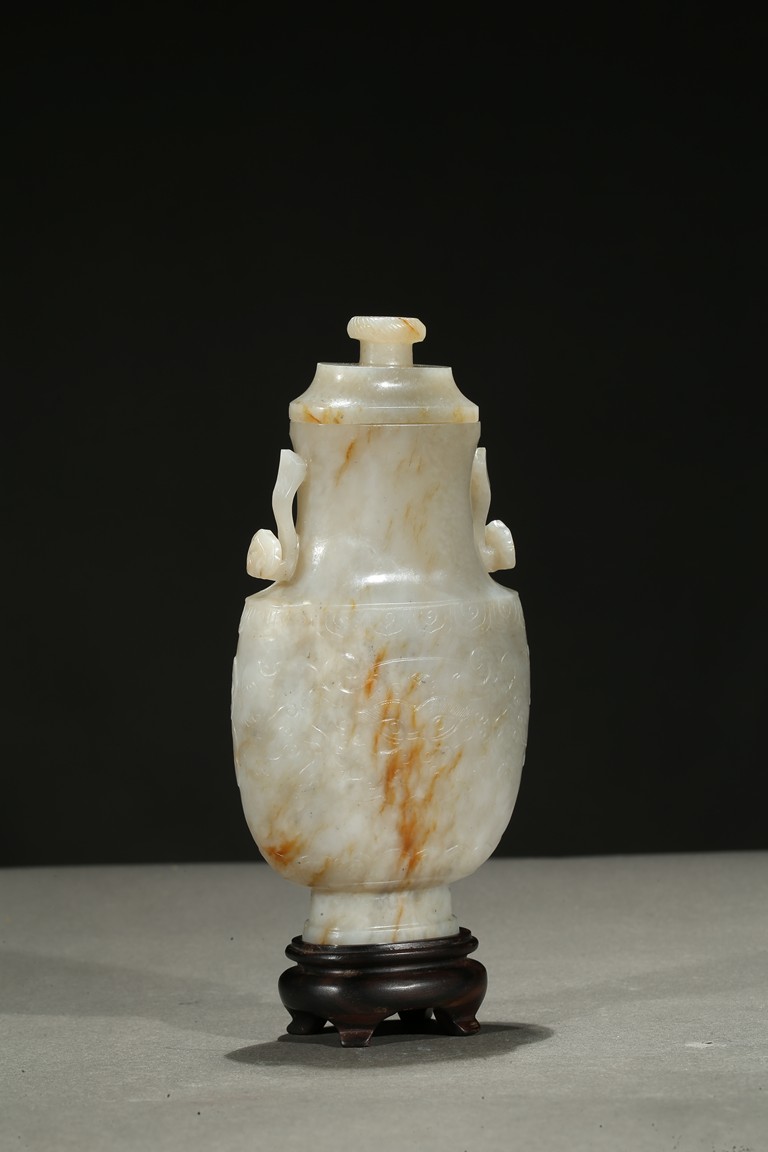 Of flattened form, the baluster body rising from a stepped foot, the waisted neck s flanked by a pair of mythical ruyi-scepter handles, finely carved in low relief to both sides with a stylized taotie mask, all between bands of ruyi heads above the foot and below the rim, the domed cover surmounted by a carved finial, the softly polished stone of an even color with some russet inclusions. Qing Dynasty period.
