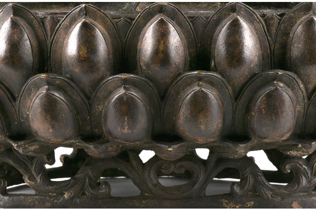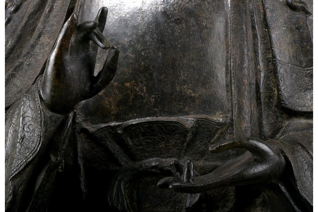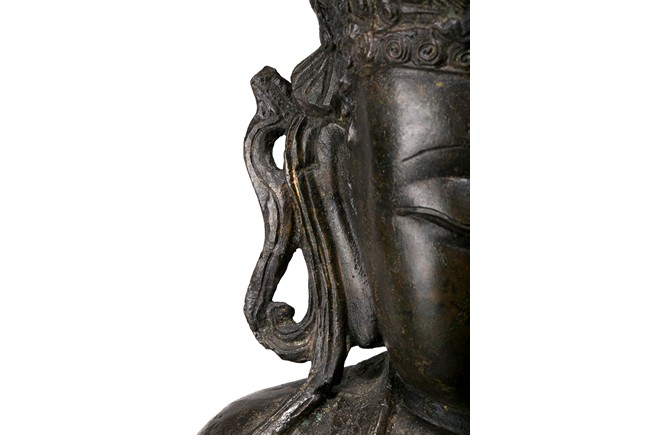 來源:纽约私人藏家提供. 此大型銅鑄大勢至菩薩坐像製作精美、法相莊嚴. 菩薩頭戴寶冠,五官秀美、妙相端莊。身佩耳璫、項圈、瓔珞及手鐲等精美飾品莊嚴全身。右手施無畏印,左手結禪定印,金剛跏趺坐安住於蓮座之上。整尊造像鑄造巨大,在明代大勢至菩薩造像中甚為罕見,十分難得。 Provenance: Private collection, New York