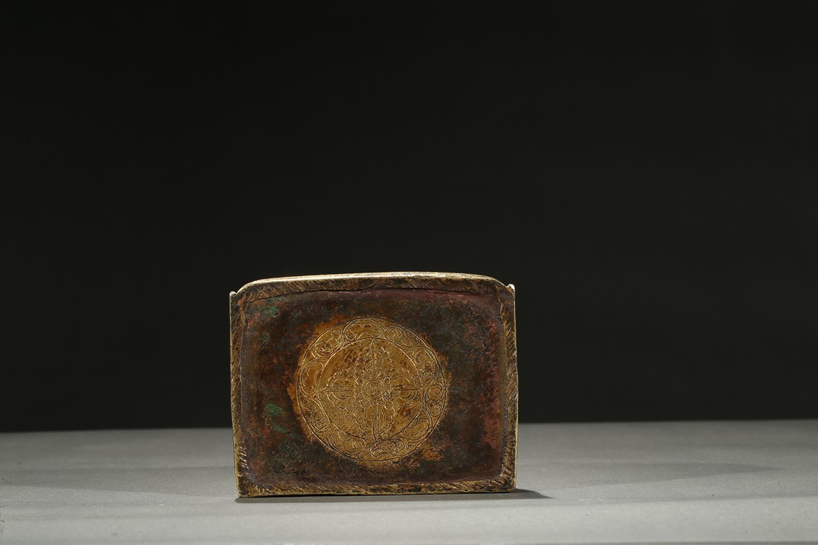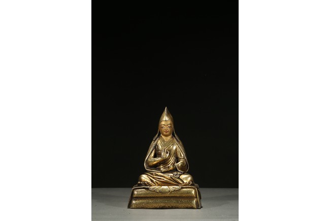 The figure is seated on a stepped base wearing long flowing robes and tall peaked hood, his right hand is raised in vitarka mudra, and his left lowered to rest on his lap, overall incised with delicate scrolled design. Qing Dynasty period.