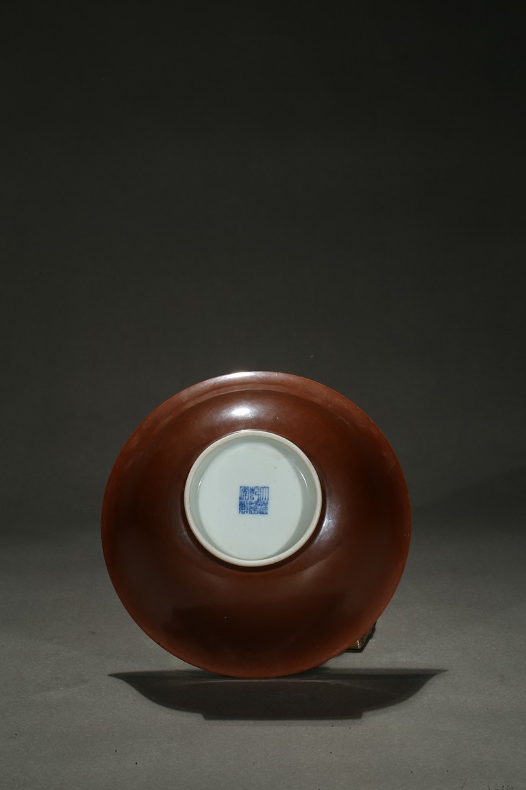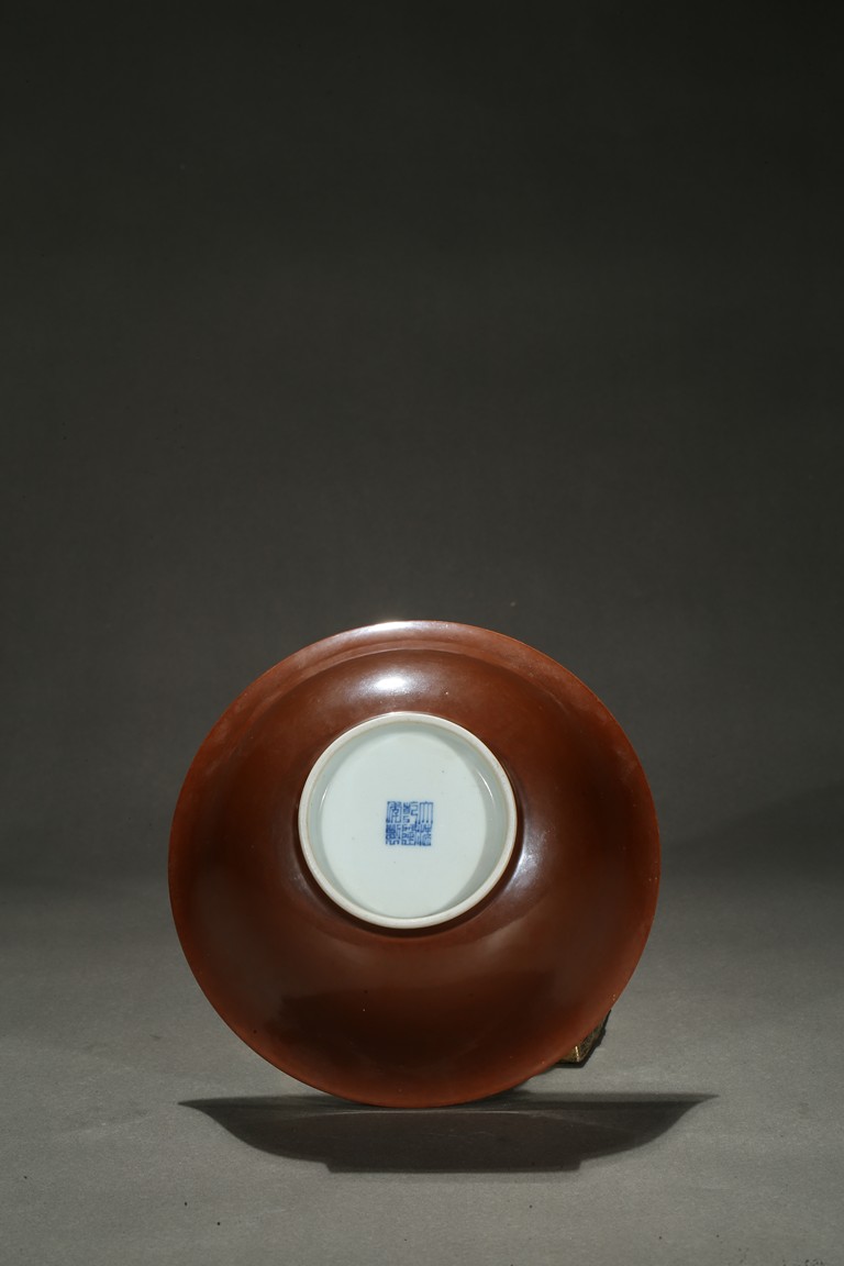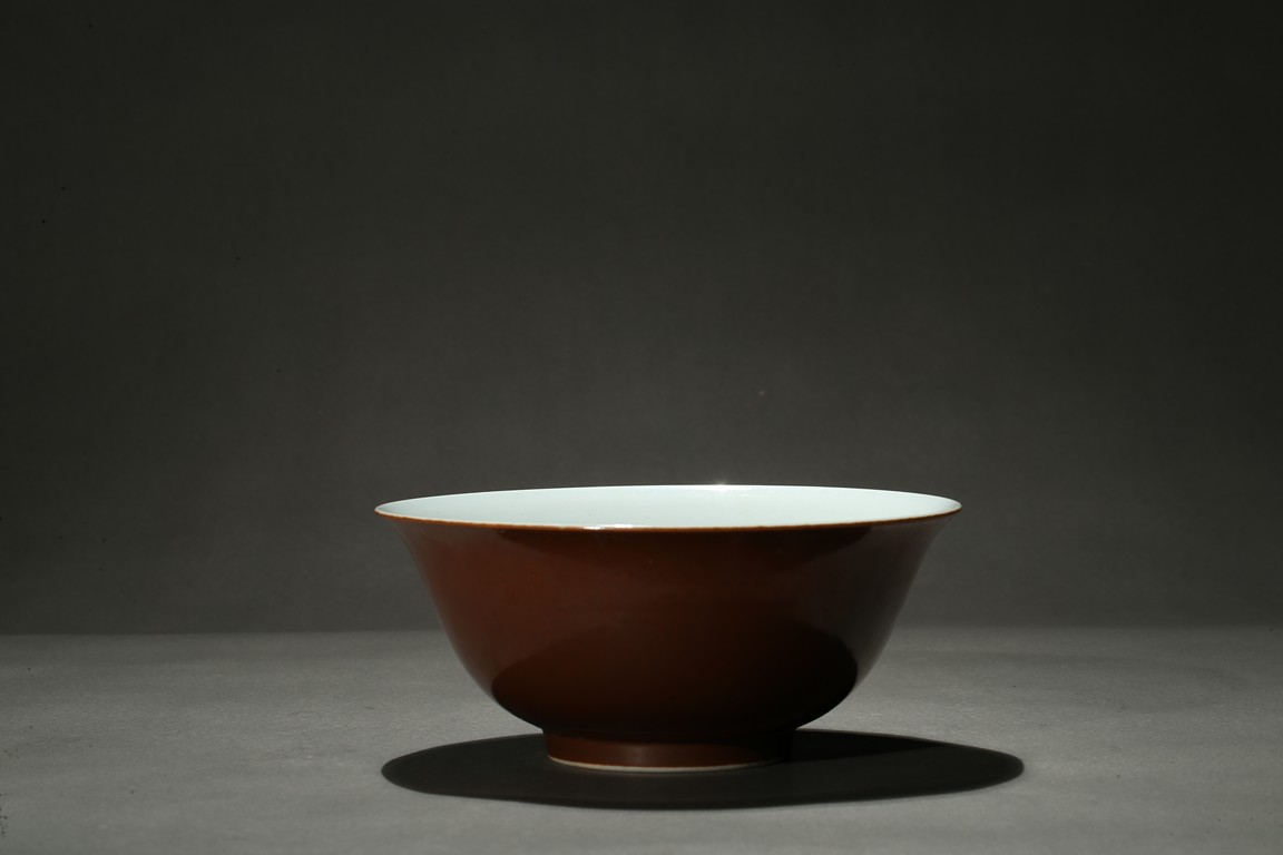 With rounded sides and raised to everted rim, covered to the exterior with glaze of russet-brown color, inside white, base with apocryphal six character QIANLONG mark. Qing Dynasty period.