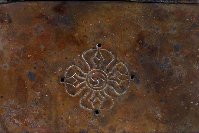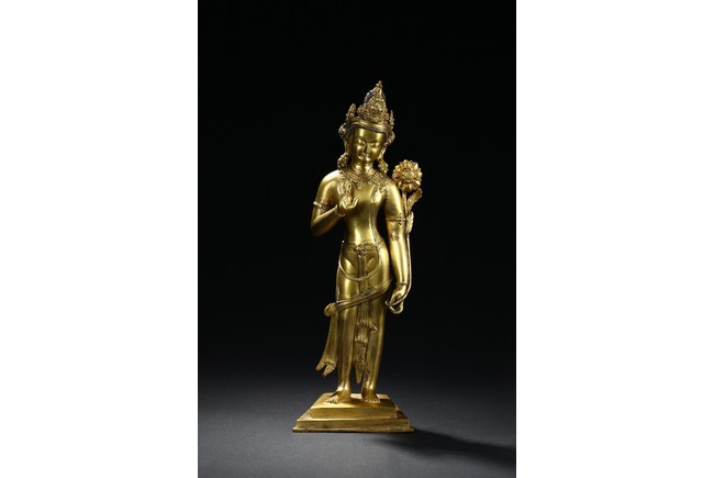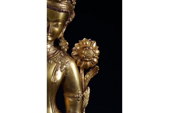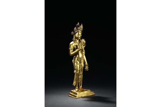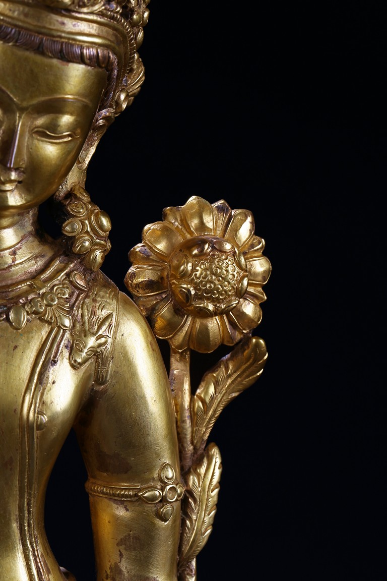 The divinity modelled standing on a raised plinth, her right hand in abhaya mudra and the left hand in varada mudra holding a spray of lotus, dressed in a loose dhoti and bejewelled with Bodhisattva jewelery, overall richly gilt.