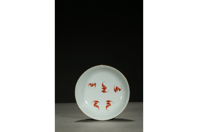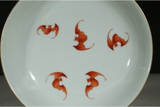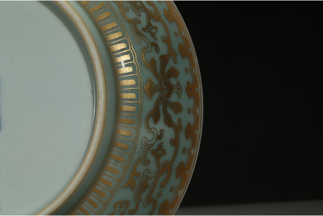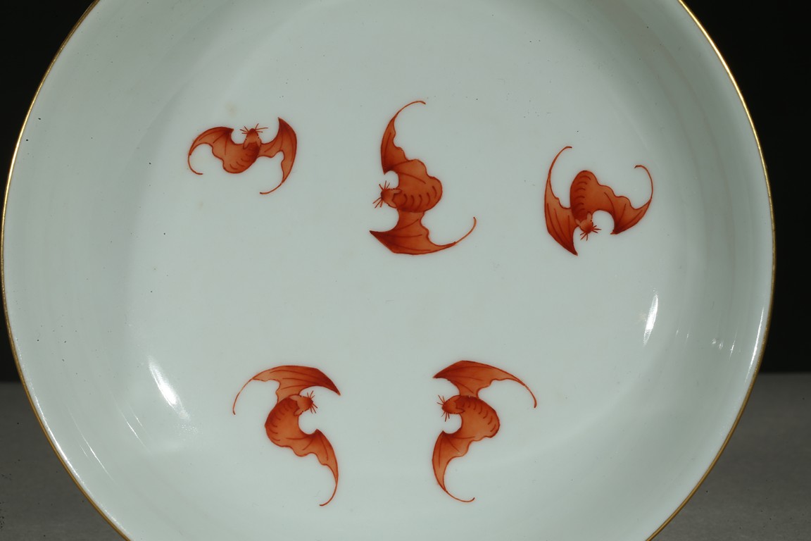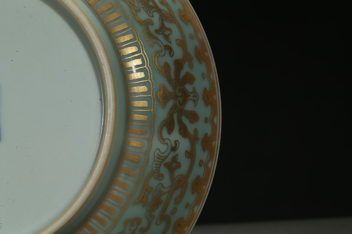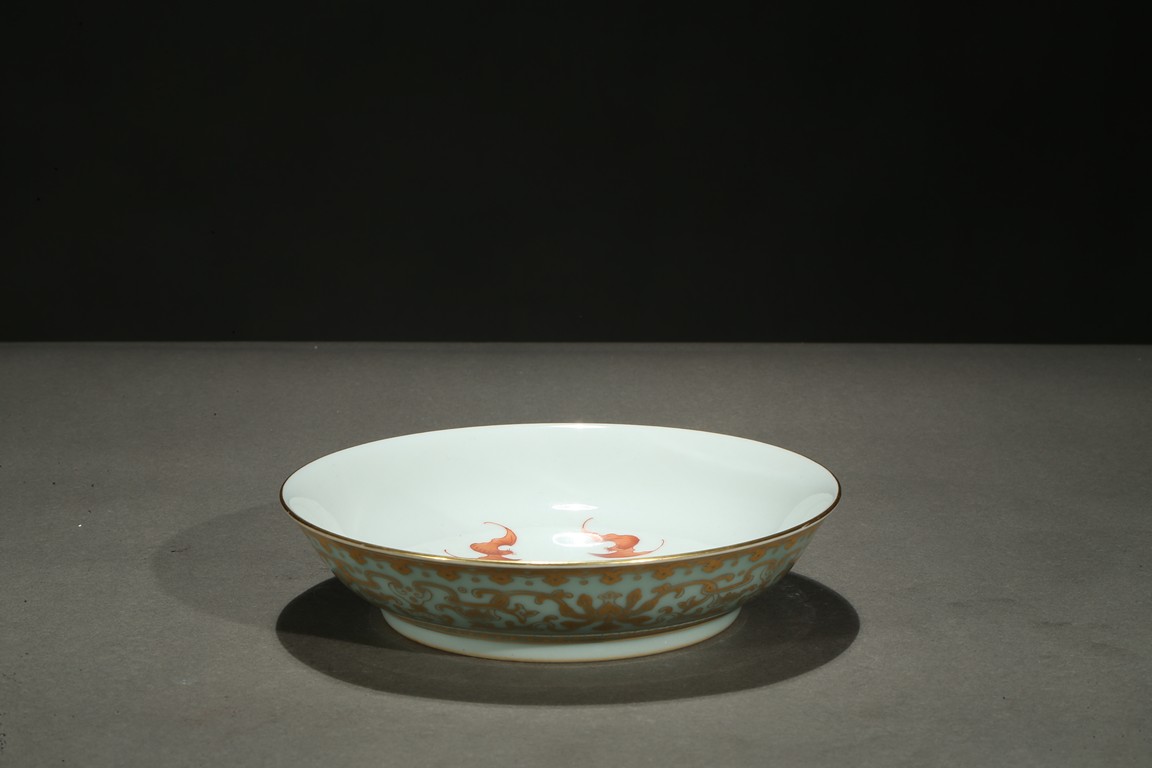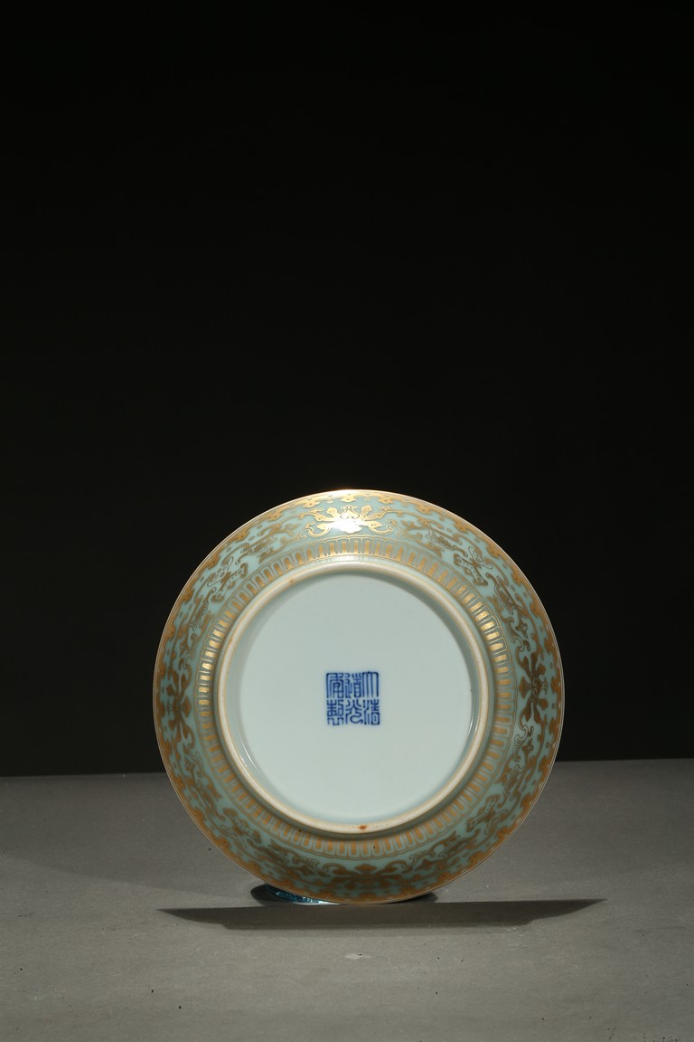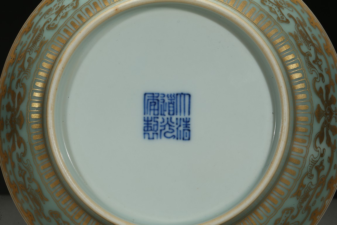 Rising from a short foot, the well potted sides finely painted in gilt with a continuous band of stylized floral scrolls, all against celadon ground, the interior finely painted with five red-glazed bats. The base inscribed with a six character reign mark.