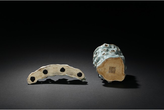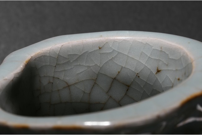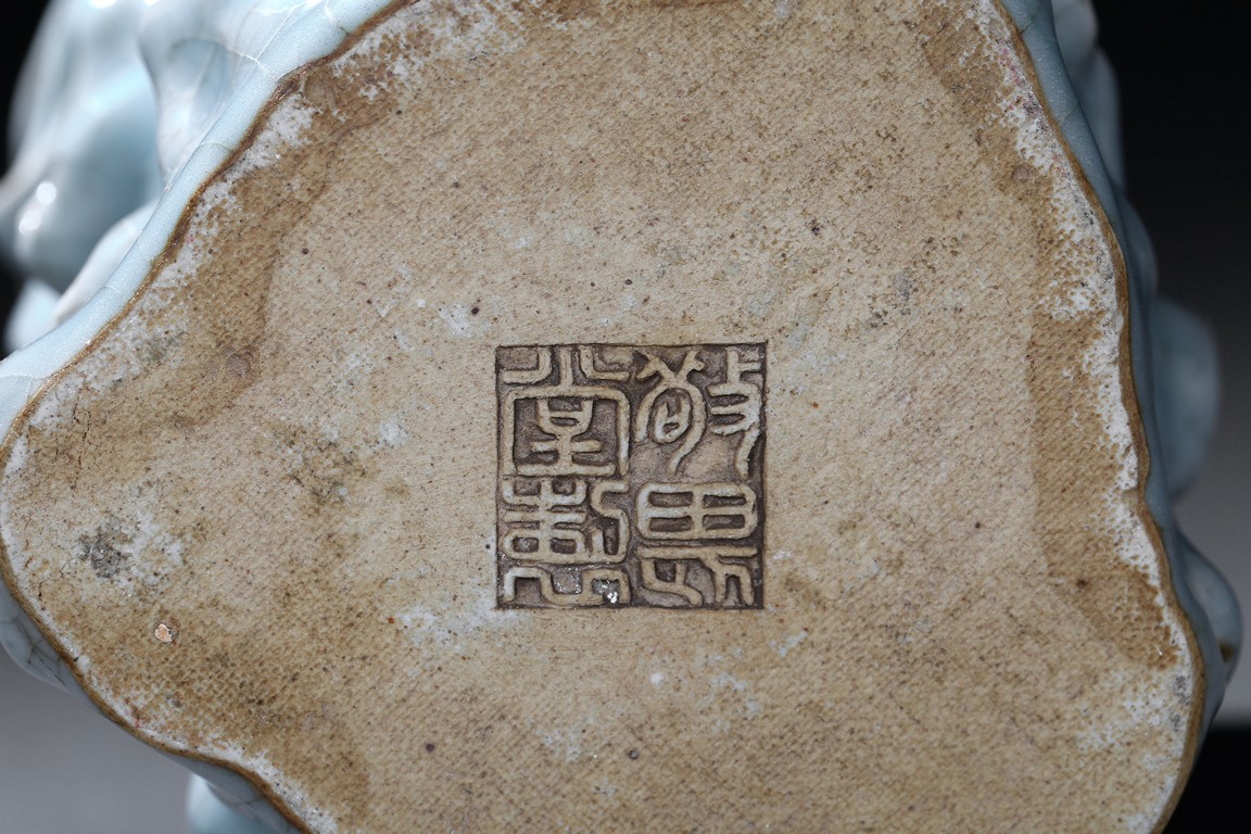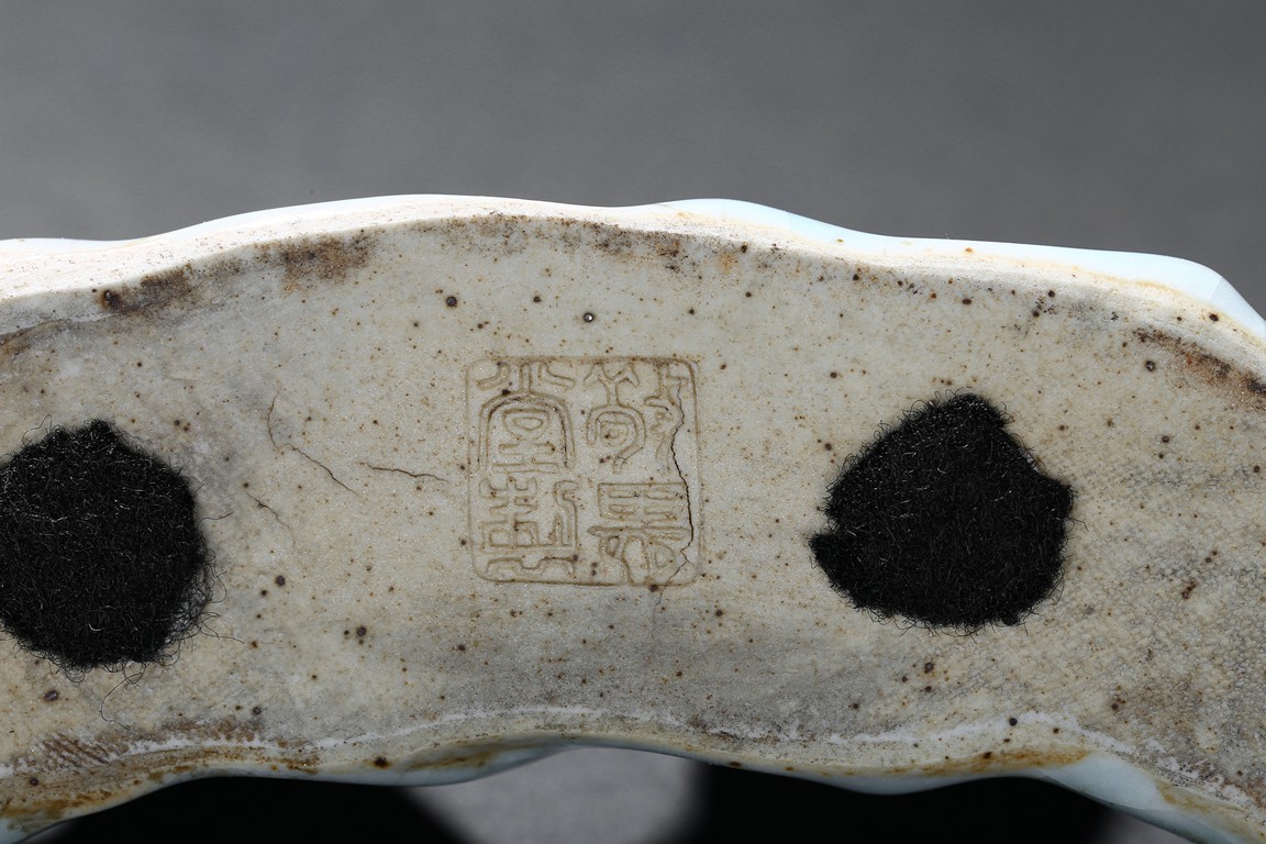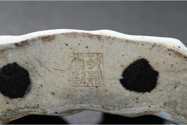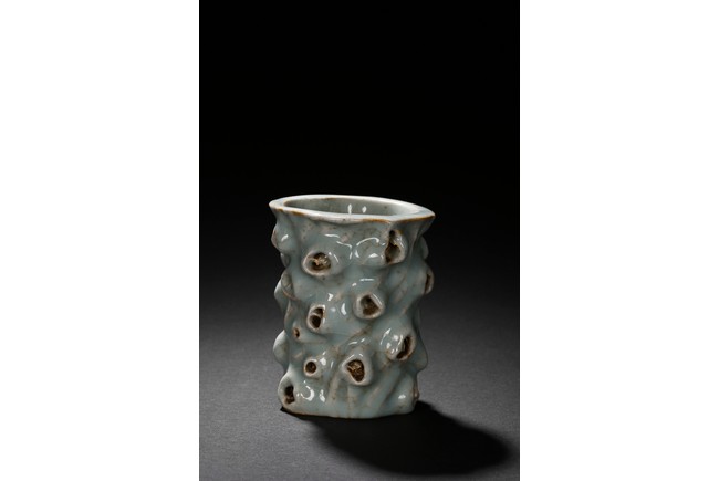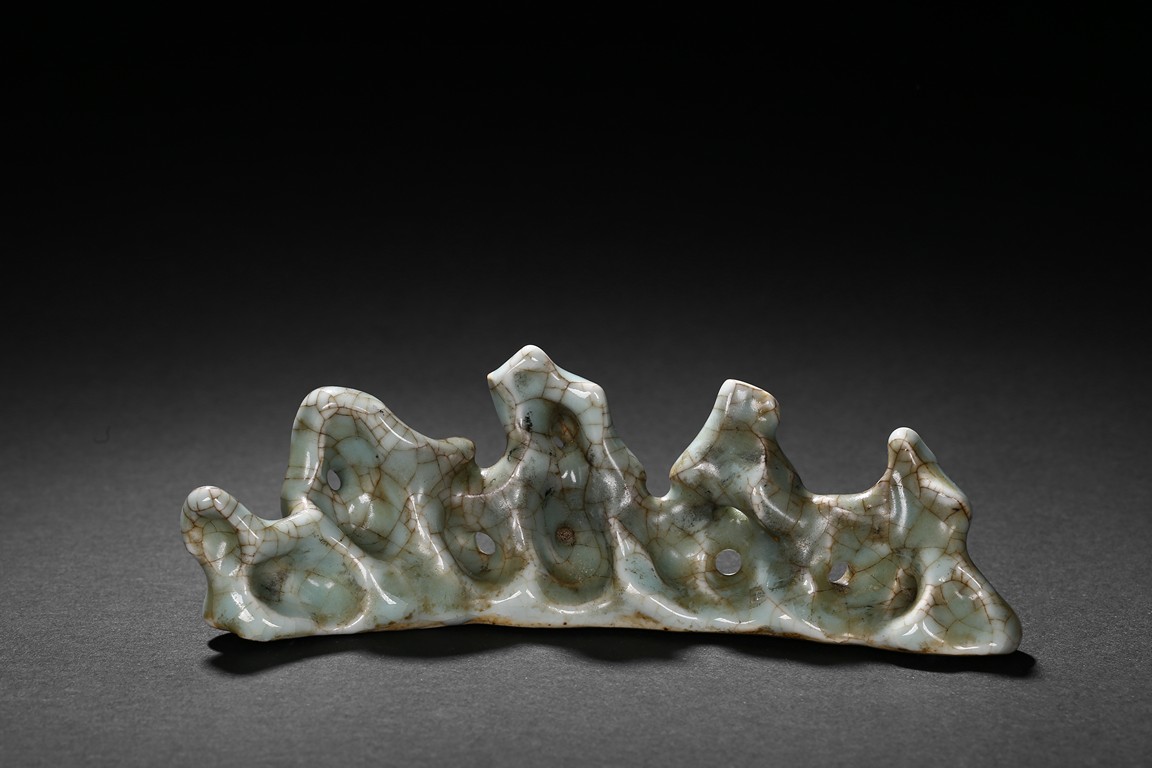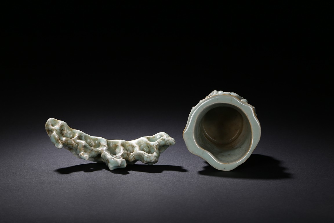 Including a celadon glazed brushpot modelled in imitation of a burlwood brushpot, with textured exterior detailed with varying sizes of burls and knots; and a five peaked brush rest modelled in imitation of a scholar's rock with irregular forms, all suffused in celadon glaze with fine crackle pattern, all impressed with a Jing Wei Tang Zhi four character mark at the base. Qing Dynasty period.