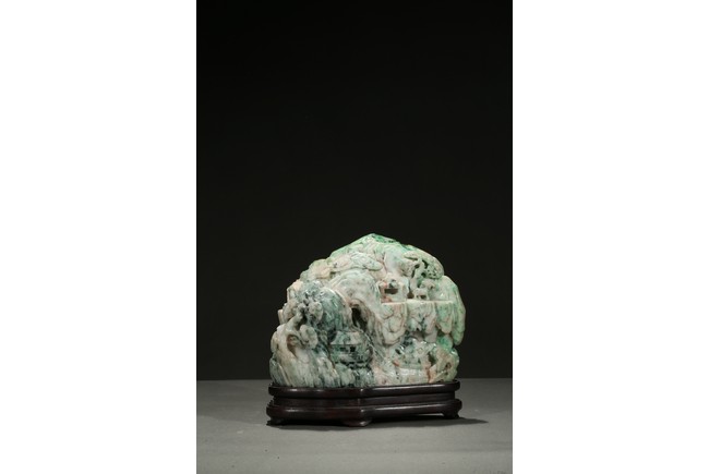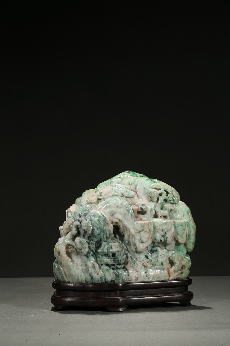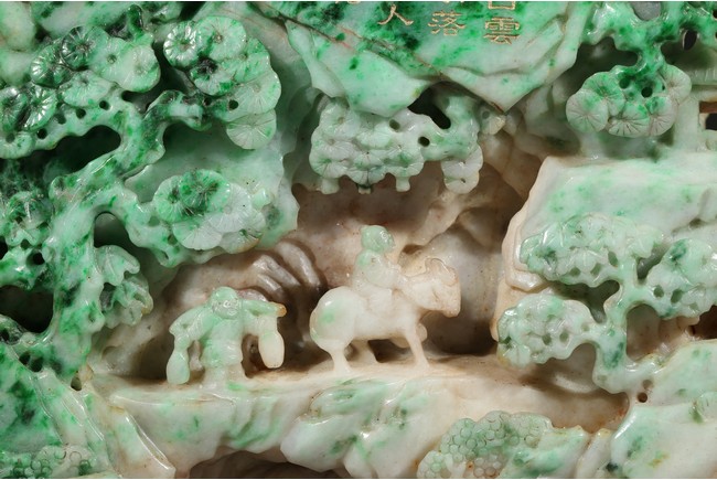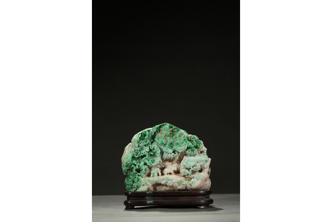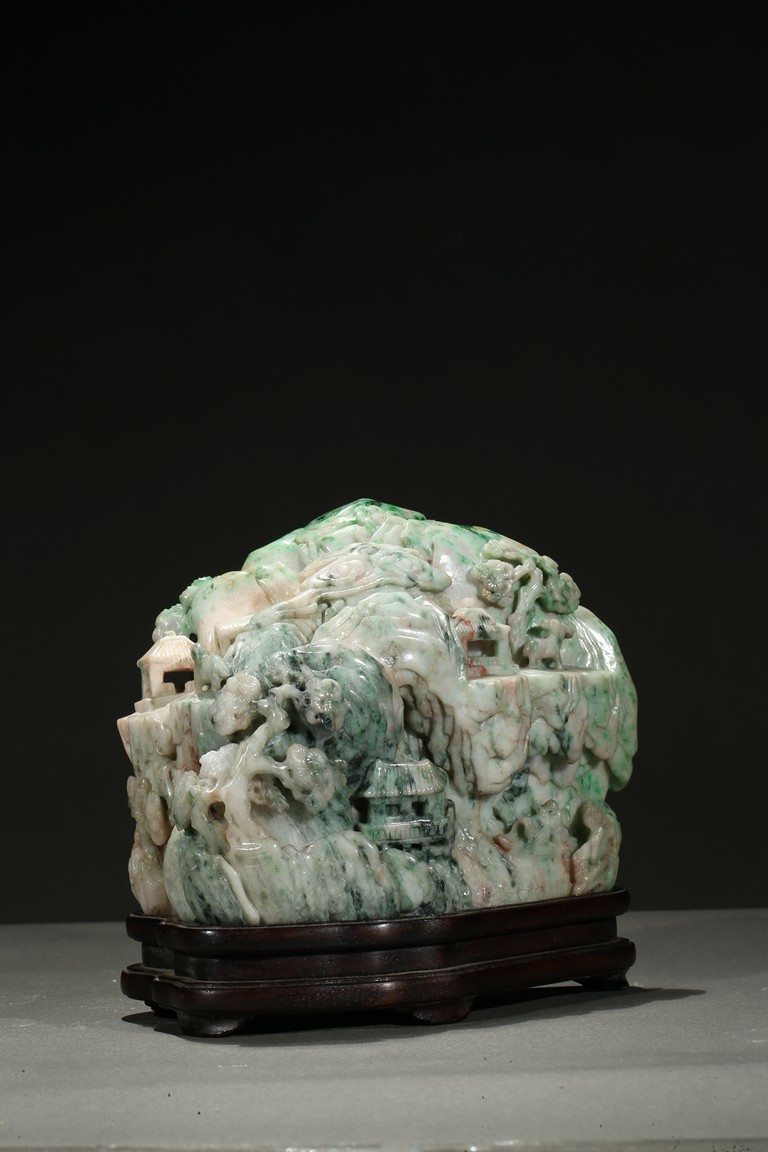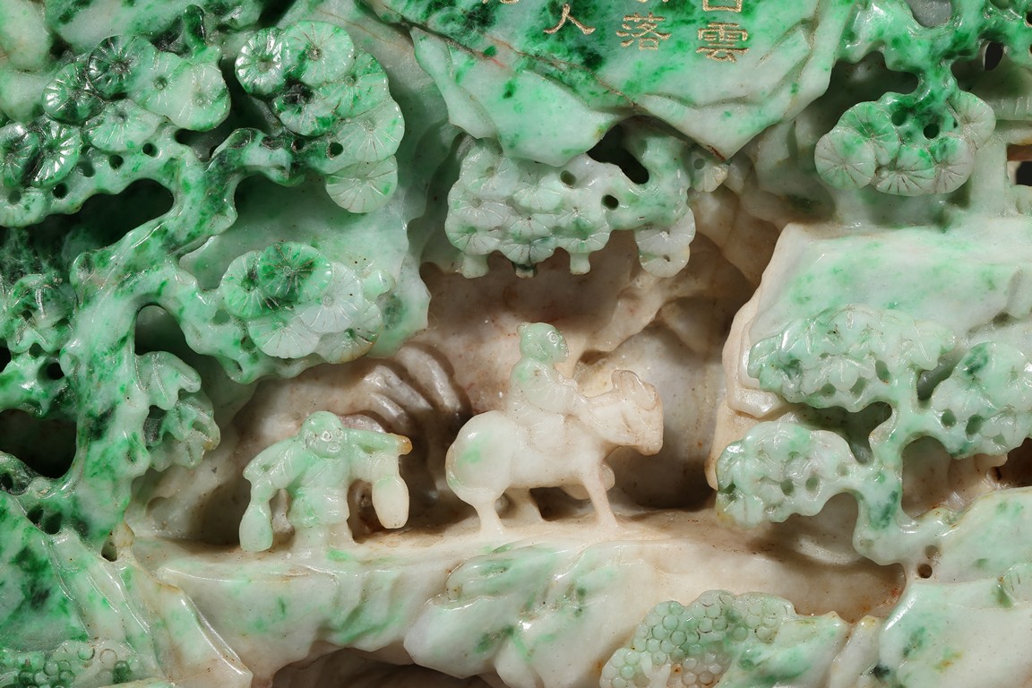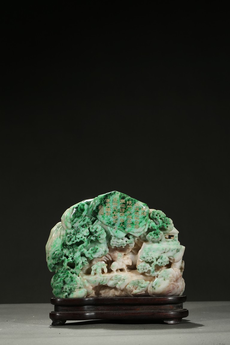 The jadeite boulder finely carved to one side with a scholar on horse accompanied with an attendant on a cliff outcrop path in a mountainous landscape, with pines and wutong issuing from the rocks, above them with gilt inscription; the reverse with the scene of boat upon water stream coming out of the cave below a pavilion on a cliff. Republic period, accompanied with a rosewood stand.