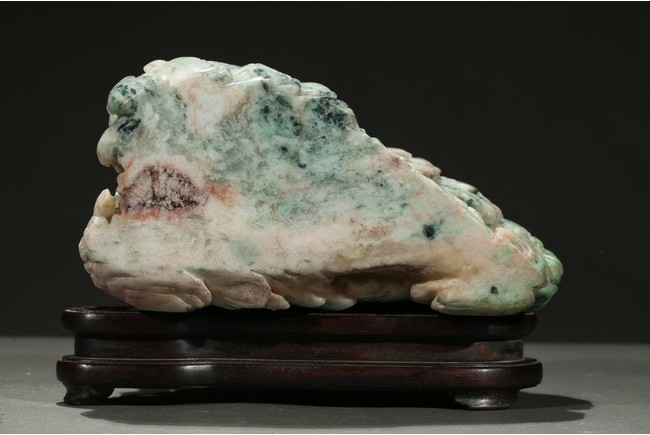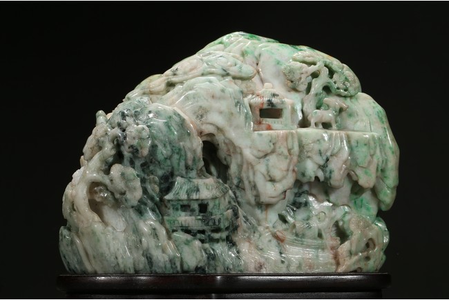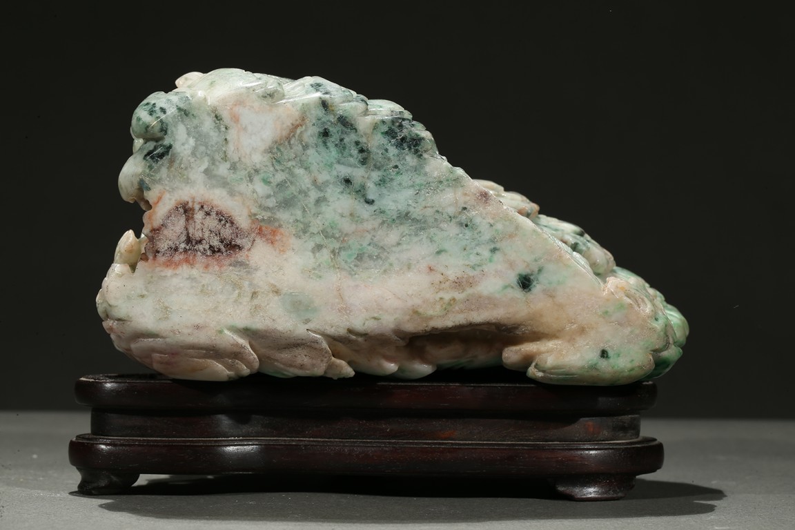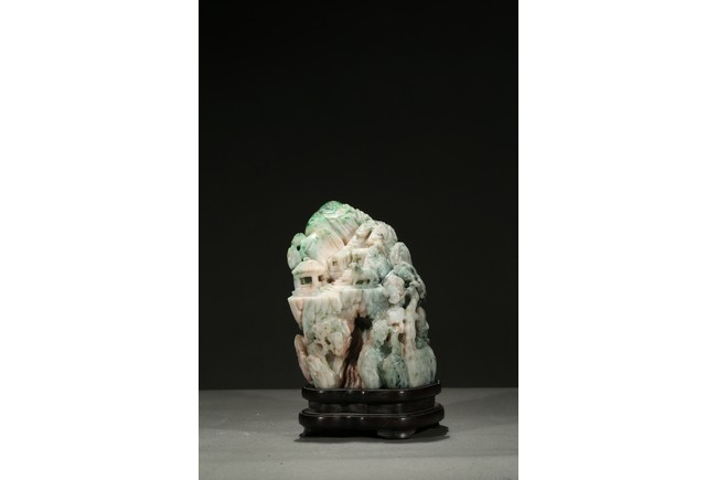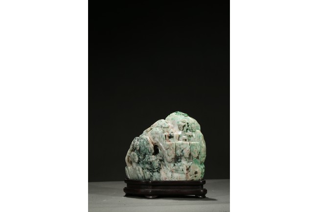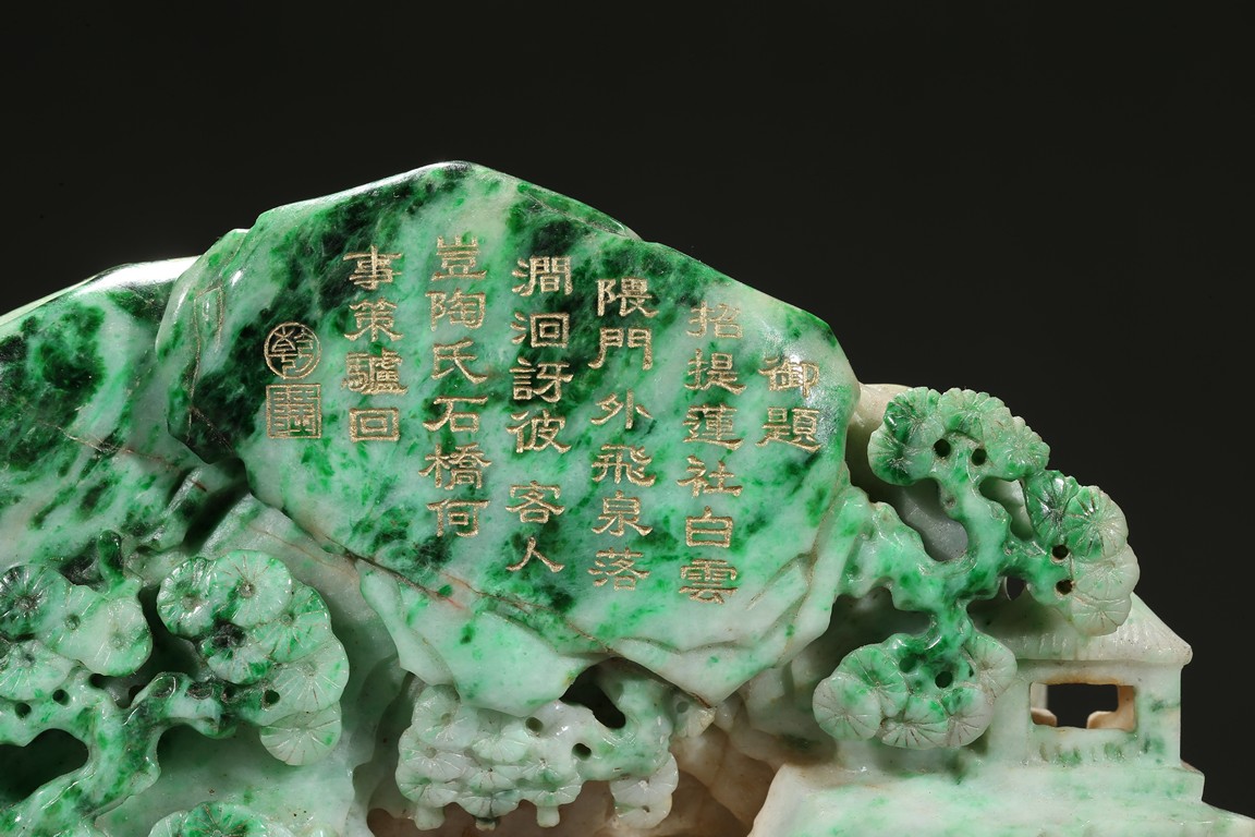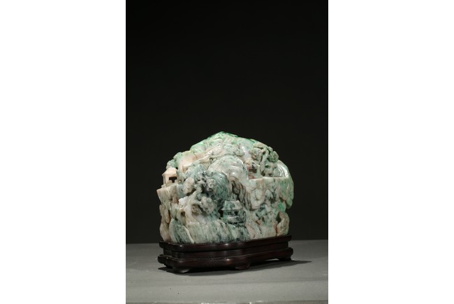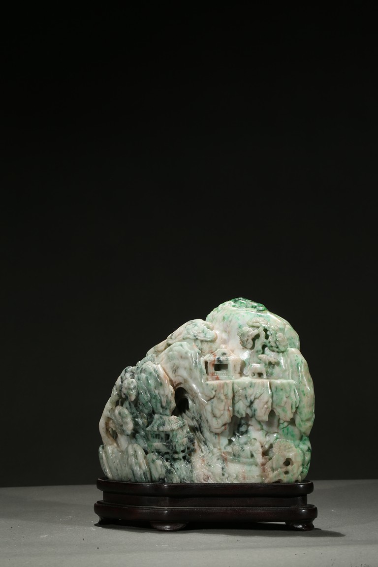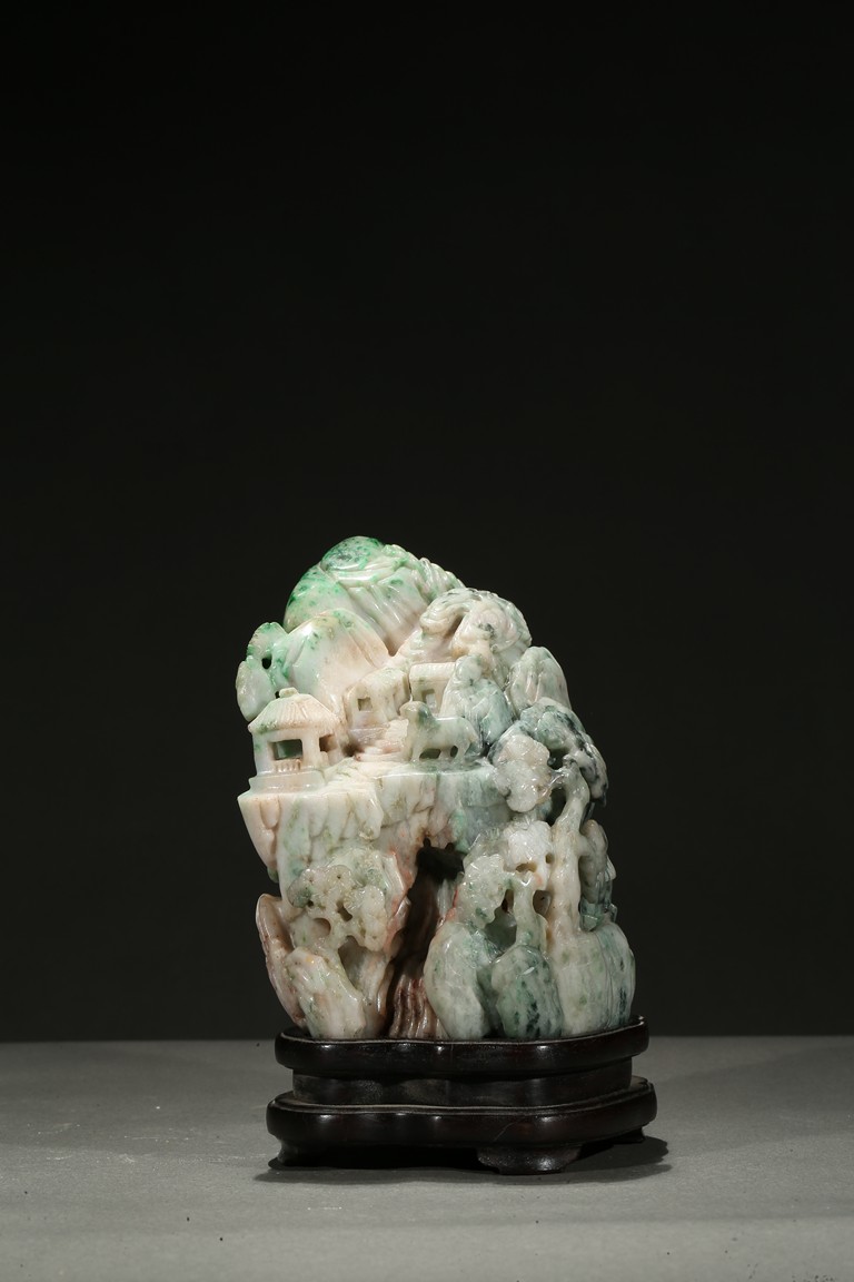The jadeite boulder finely carved to one side with a scholar on horse accompanied with an attendant on a cliff outcrop path in a mountainous landscape, with pines and wutong issuing from the rocks, above them with gilt inscription; the reverse with the scene of boat upon water stream coming out of the cave below a pavilion on a cliff. Republic period, accompanied with a rosewood stand.