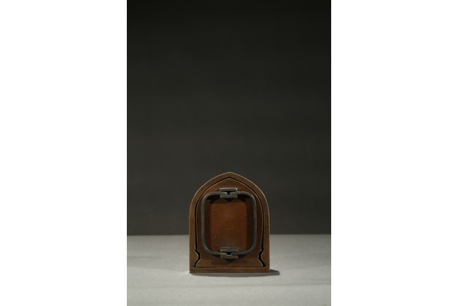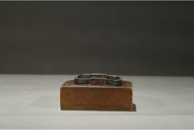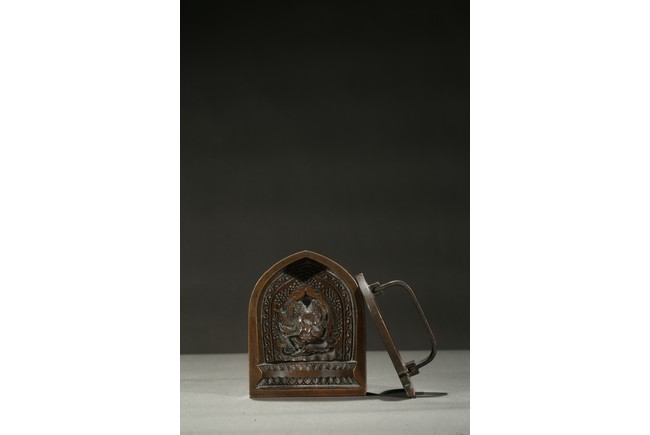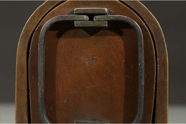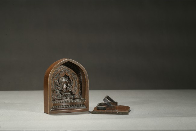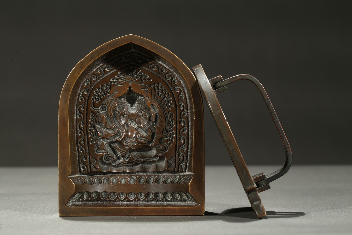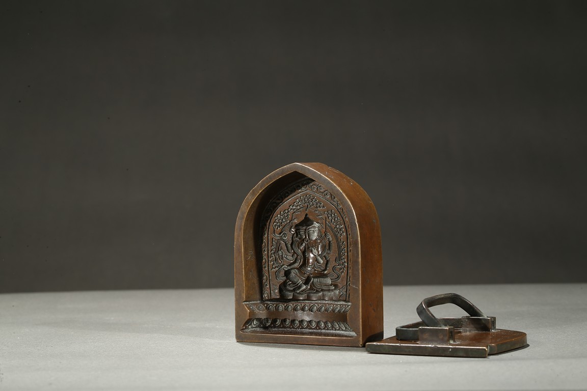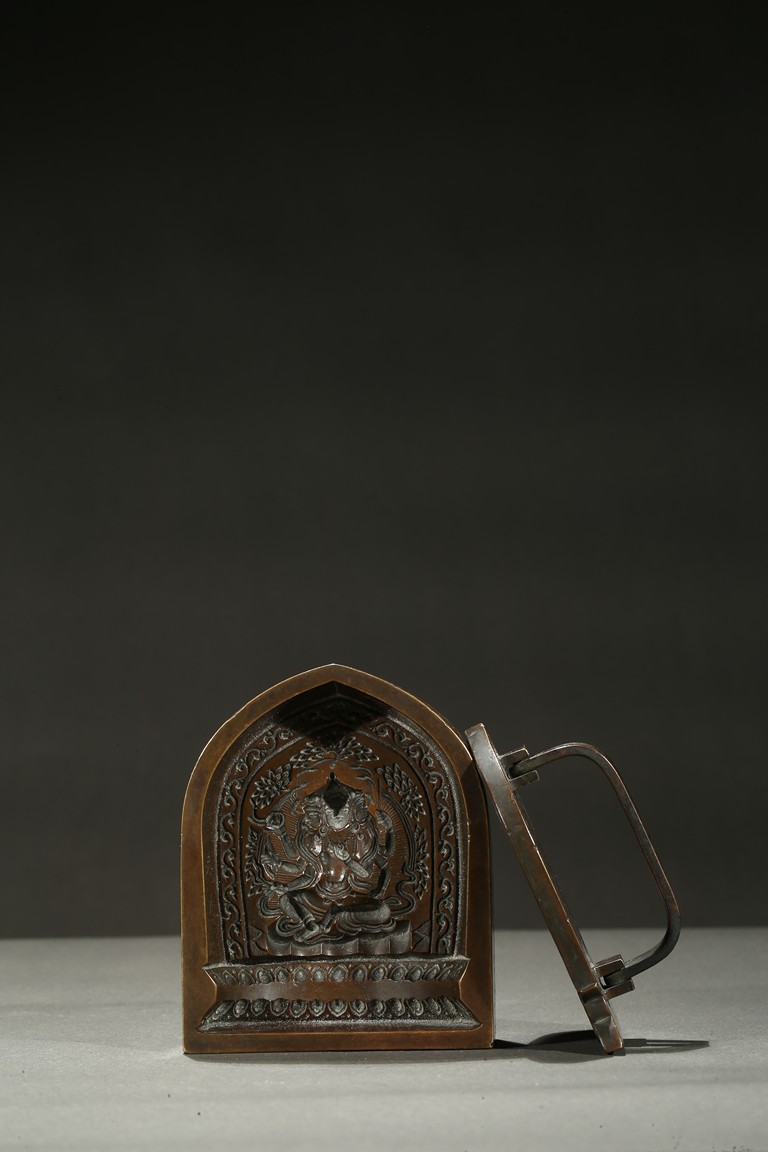 The removable front panel is carved with two characters zhou yi and is cast to the interior side with the characters pi lu buddha beside an inscription in Manchu and Lanca characters above a six-character Qianlong mark. The interior of the mould is cast with the Guardian of the West, vairocana seated on a double lotus base within a scroll border. Qing Dynasty period.