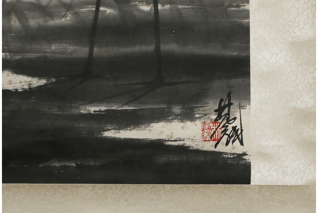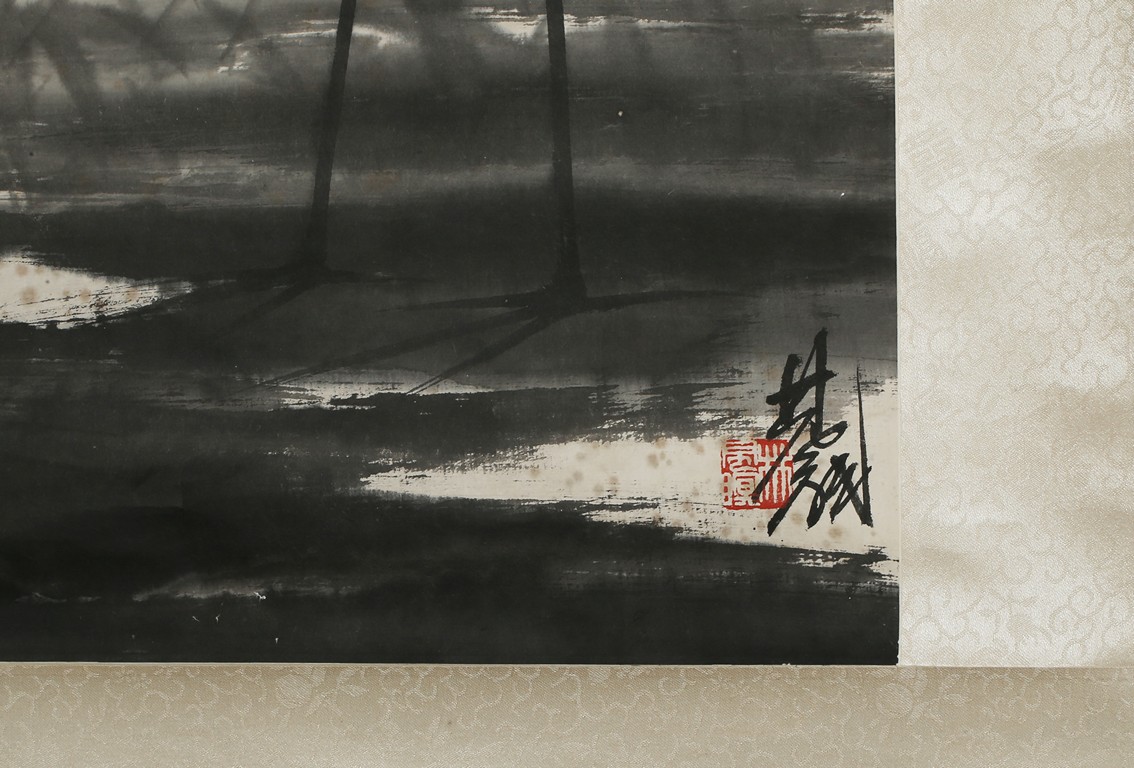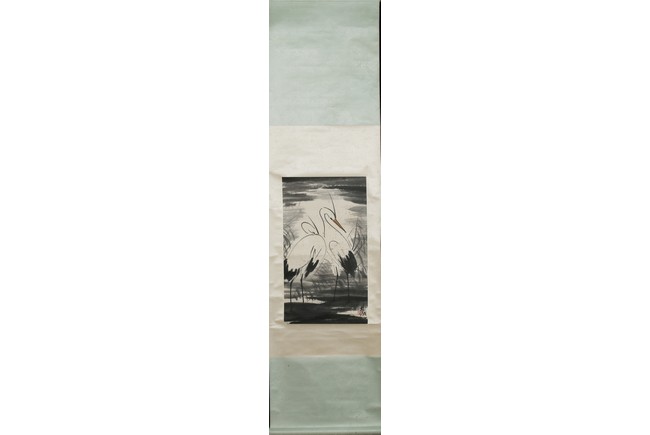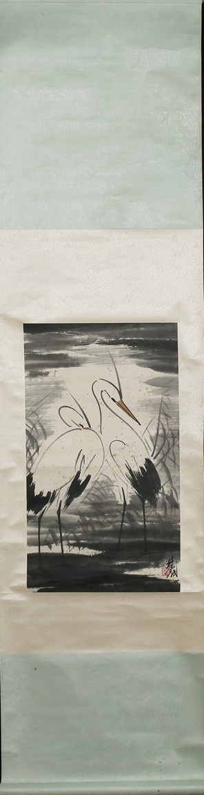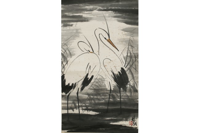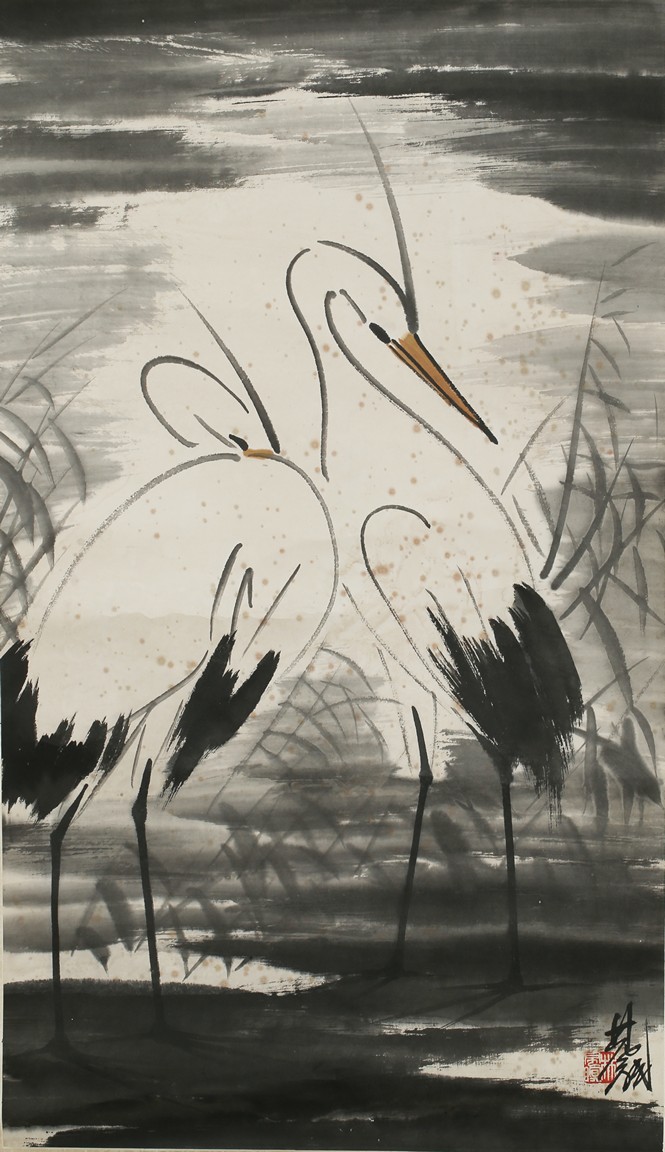 Color and ink on paper. Cranes. Hanging scroll. Signed Lin Fengmian and with one seal of the artist's.