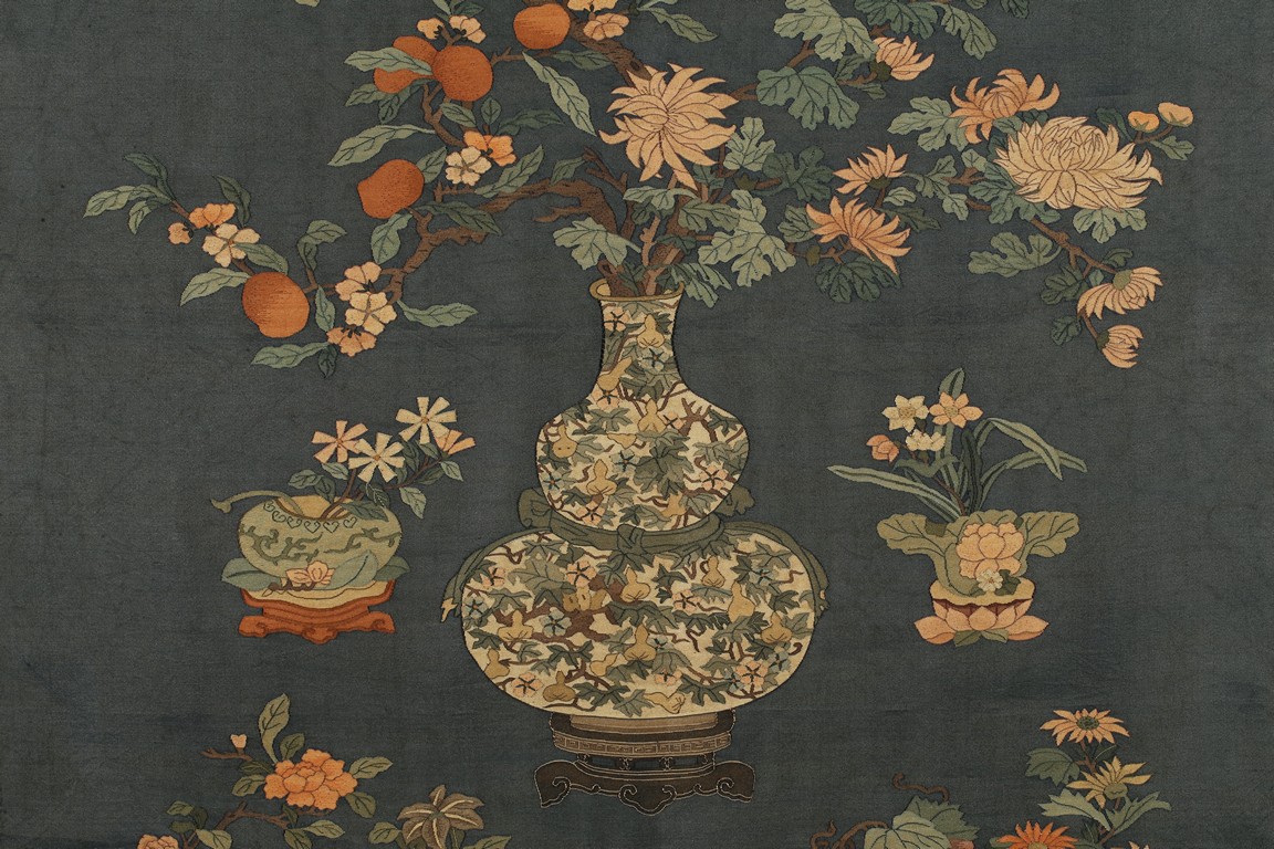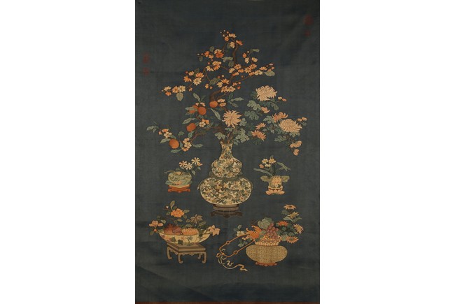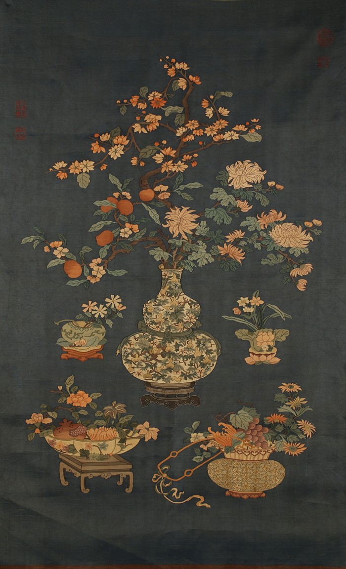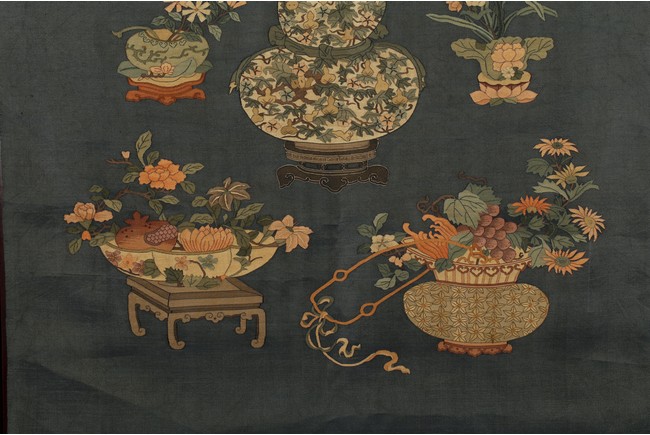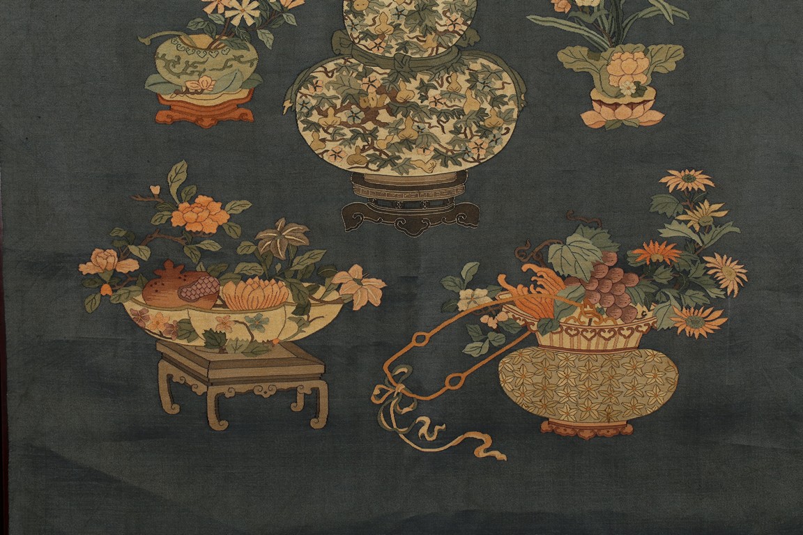 Richly embroidered in bright colors to depict bogu scene, including a double gourd vase containing various flowers, a quatrefoil jardiniére upon a wood stand, a waterpot, a lotus bowl, and a lobed vase, all against dark blue background, with two seal marks on top left.