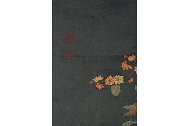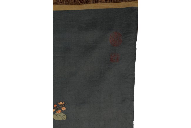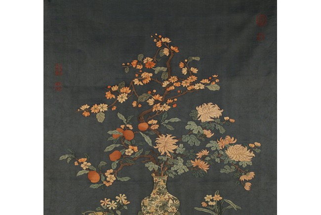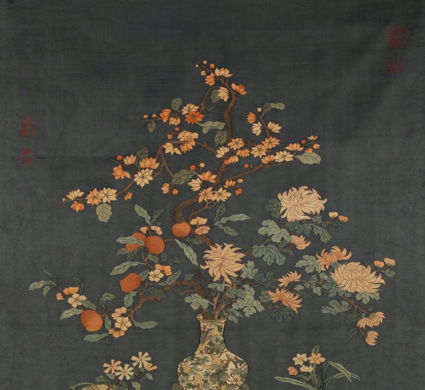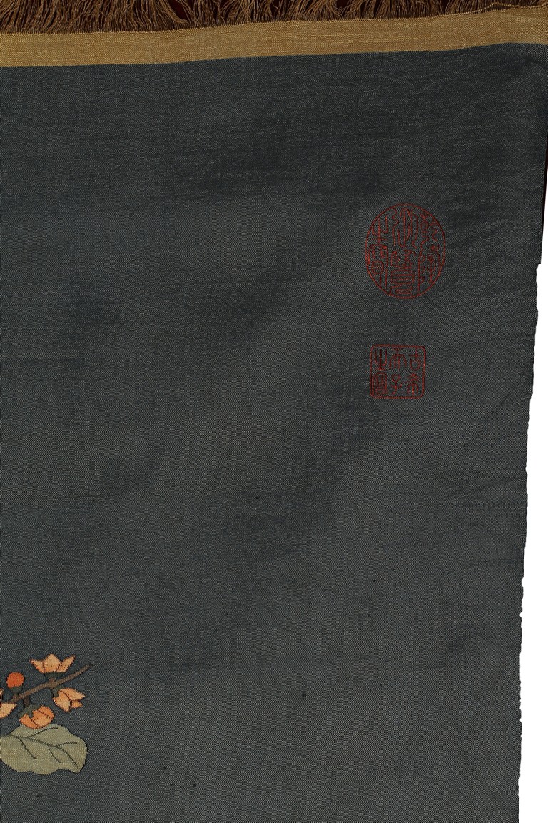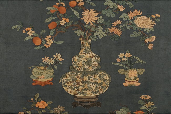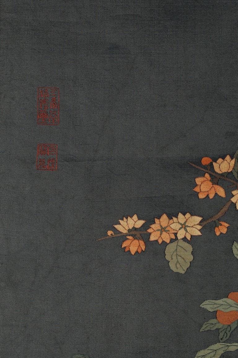 Richly embroidered in bright colors to depict bogu scene, including a double gourd vase containing various flowers, a quatrefoil jardiniére upon a wood stand, a waterpot, a lotus bowl, and a lobed vase, all against dark blue background, with two seal marks on top left.