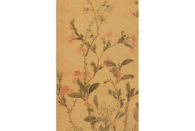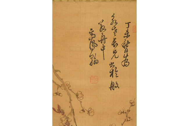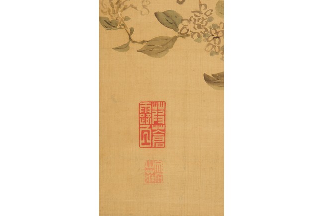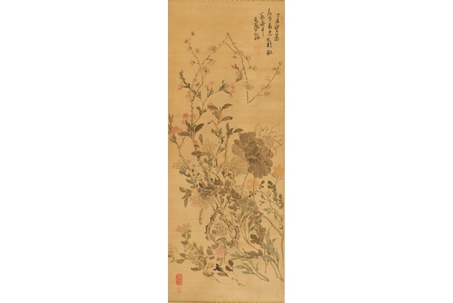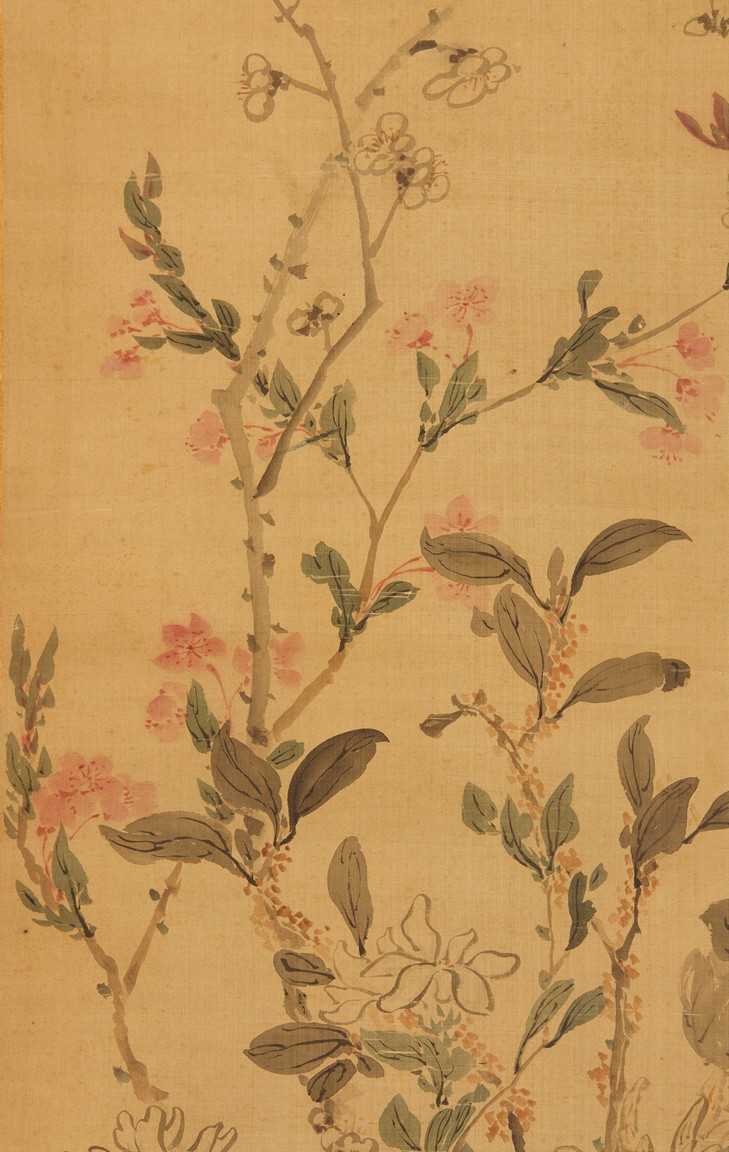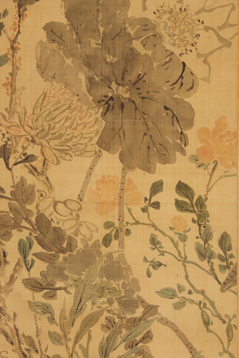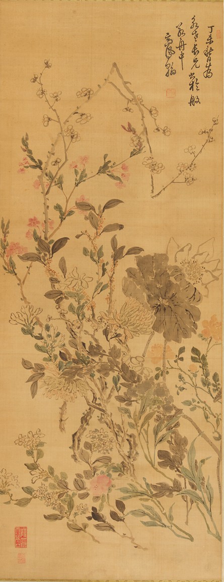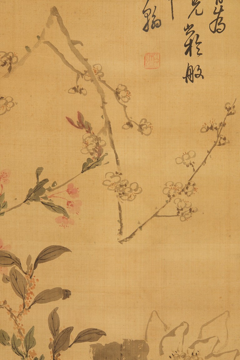 Color and ink on silk. Flowers. Hanging scroll. Inscribed and signed Gao Fenghan, with four seals of the artist's.