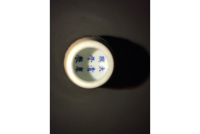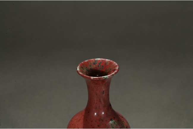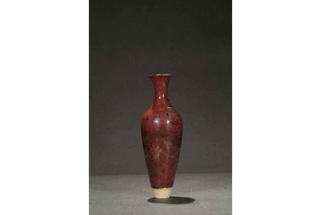 Elegantly potted with a slender tapering body rising to high shoulders and a tall slender neck and everted mouth, covered overall with a peachbloom glaze with mushroom-coloured mottling, the glaze neatly stopping above the foot, inscribed on the base with a six-character reign mark in underglaze-blue. Qing Dynasty period.