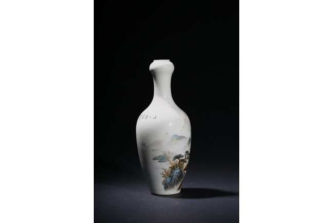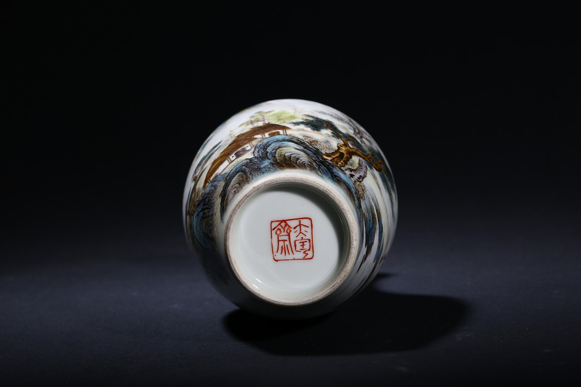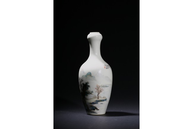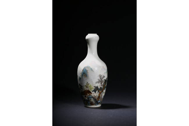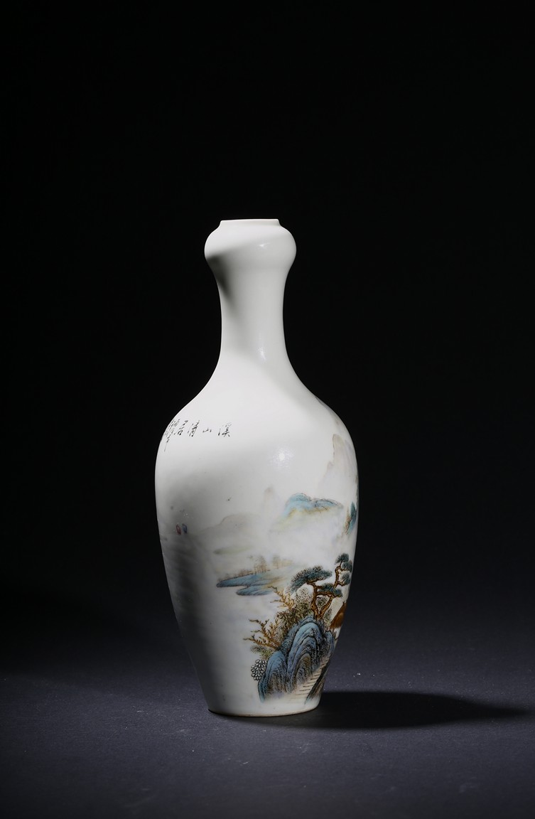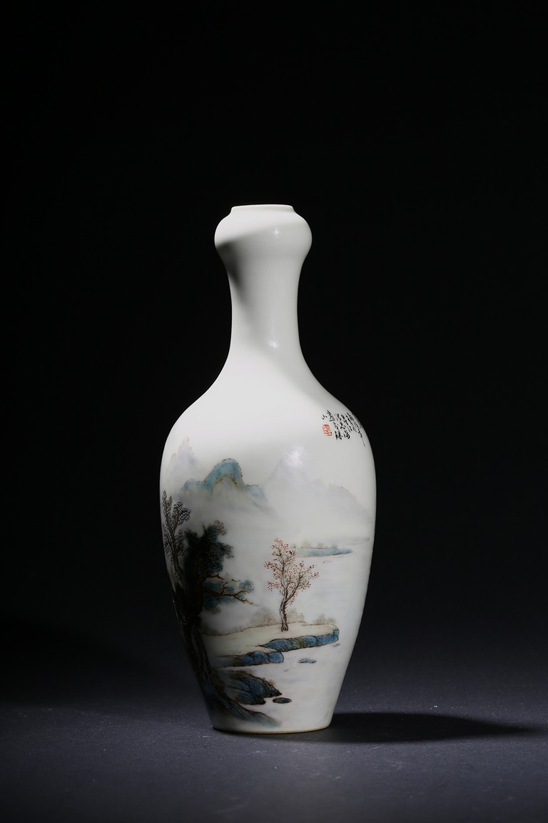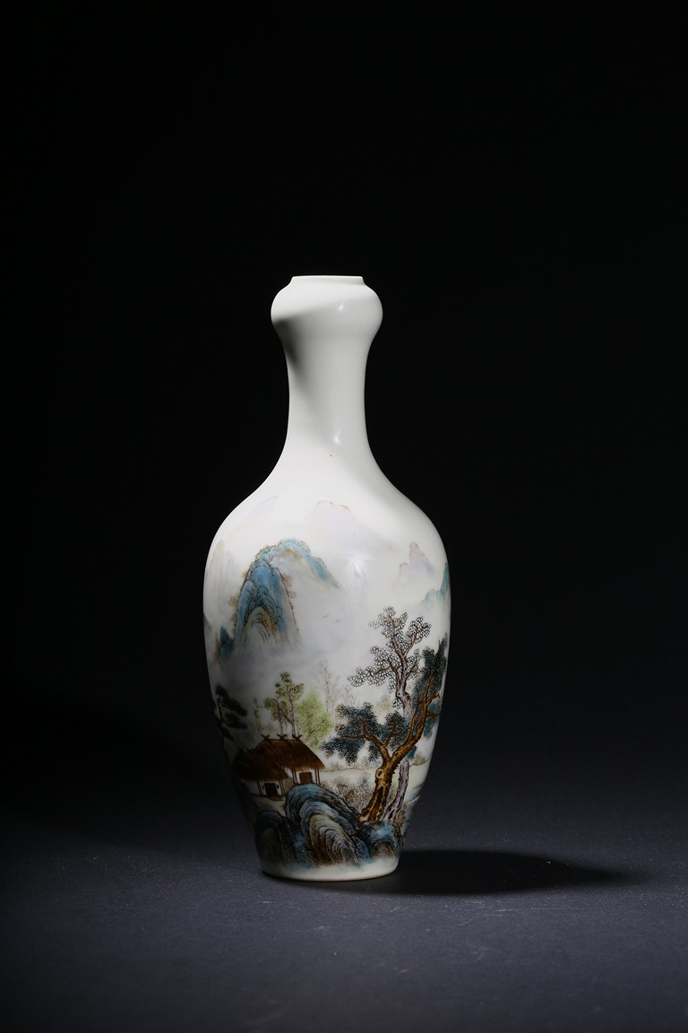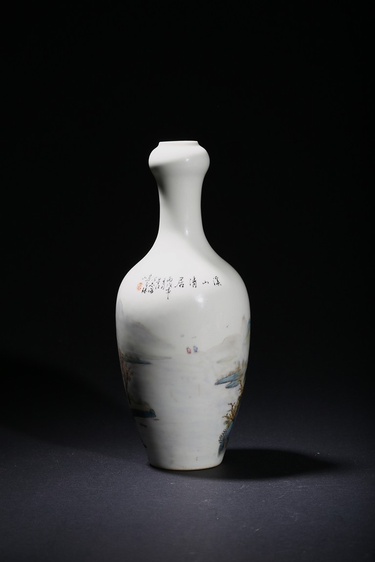 The pear-shaped body rising to a tall waisted neck with a garlic-head mouth and straight lip, the body finely enamelled with a riverside village landscape scene, with inscription and signed Zhi Tang and dated to 1946, with seal mark, the base with a two character mark.