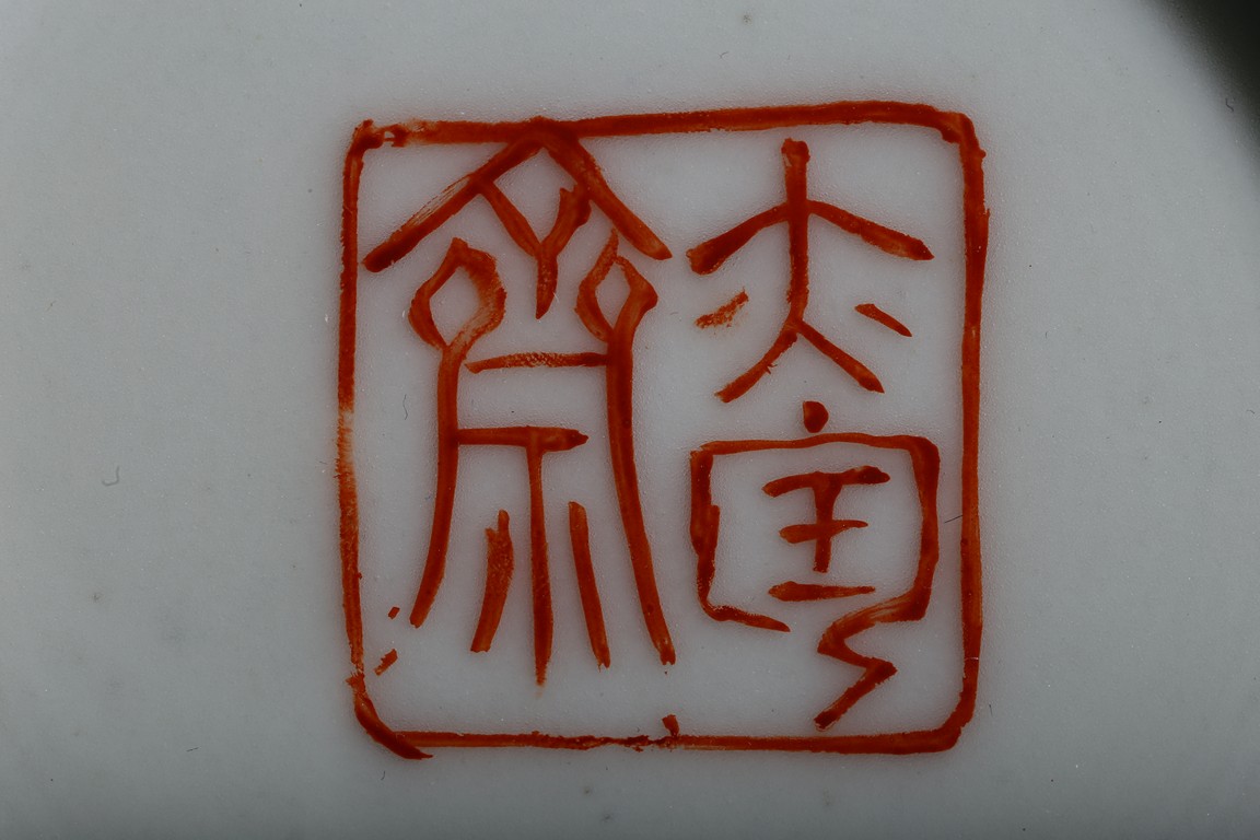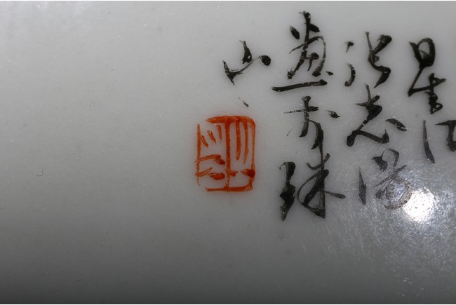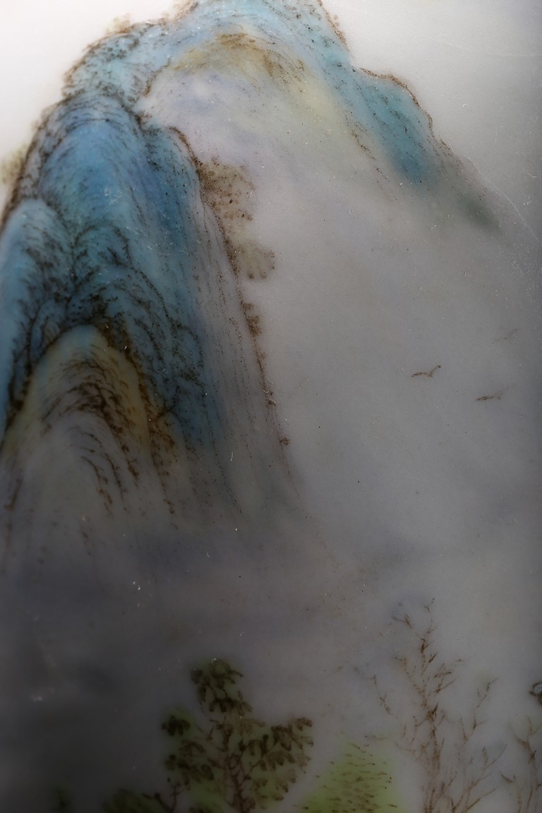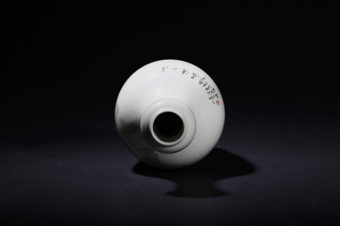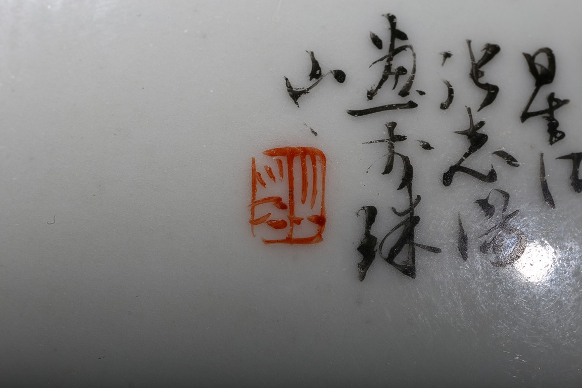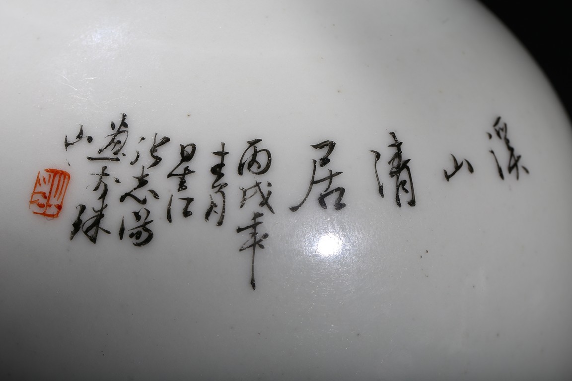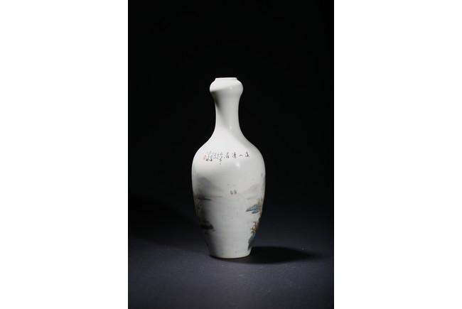 The pear-shaped body rising to a tall waisted neck with a garlic-head mouth and straight lip, the body finely enamelled with a riverside village landscape scene, with inscription and signed Zhi Tang and dated to 1946, with seal mark, the base with a two character mark.