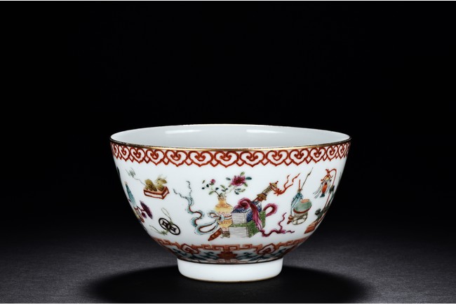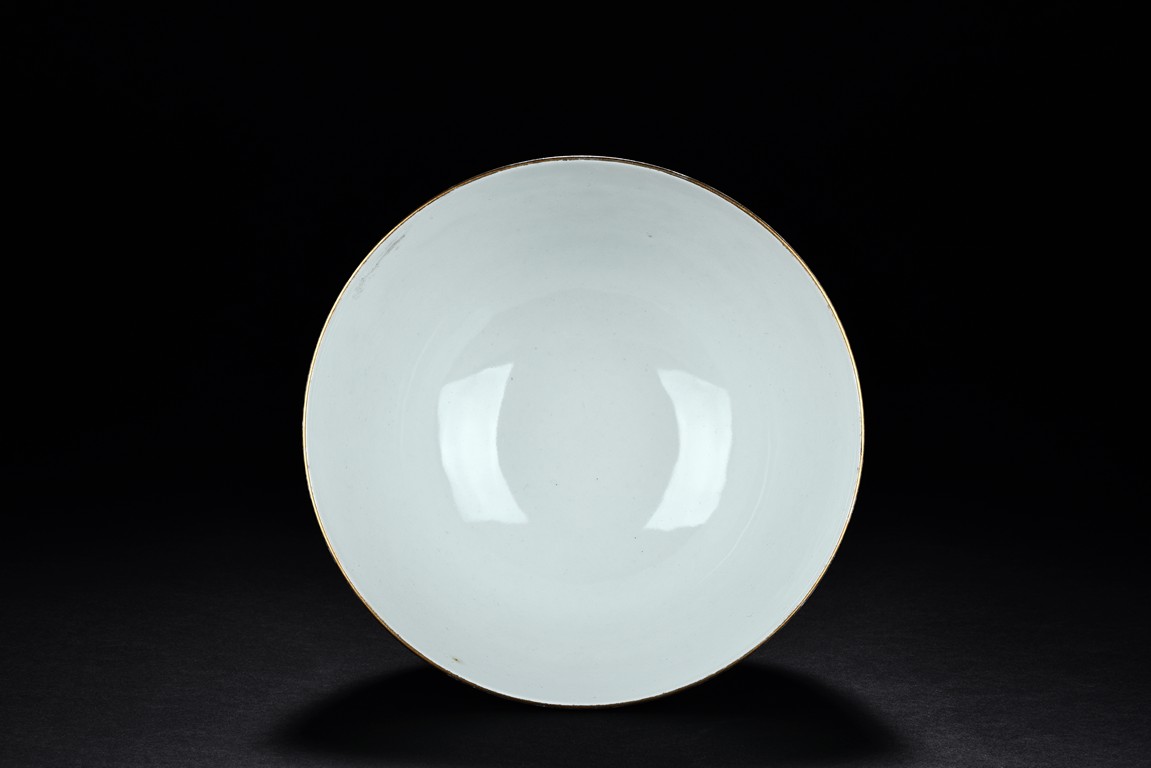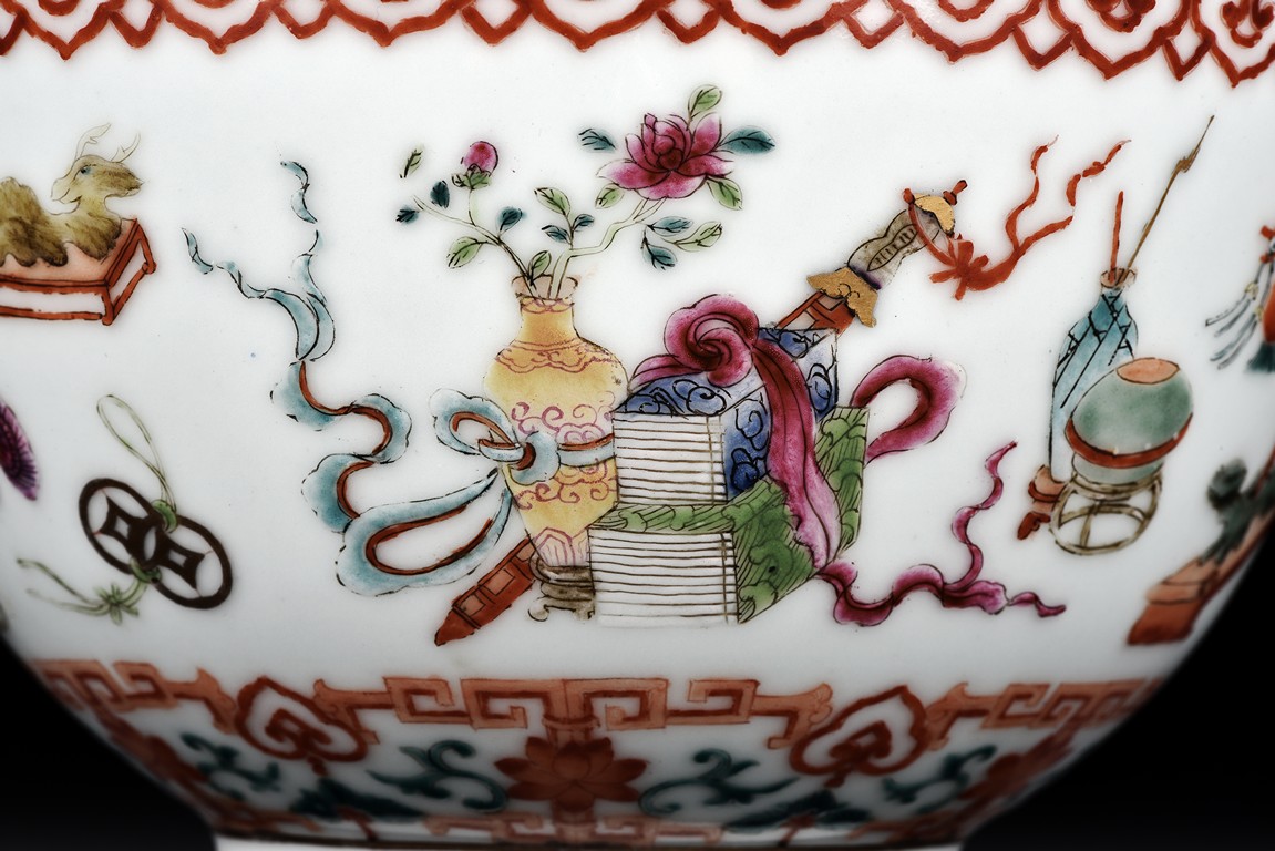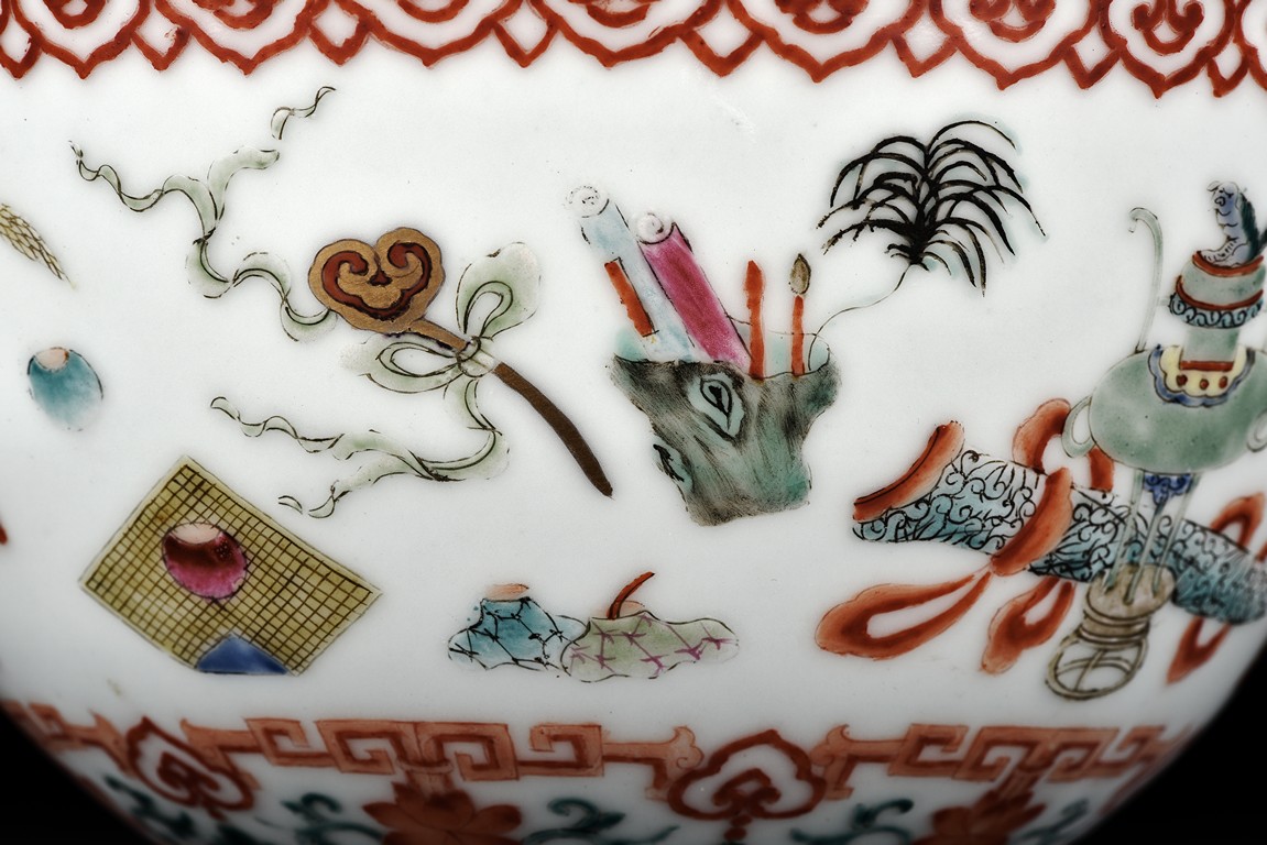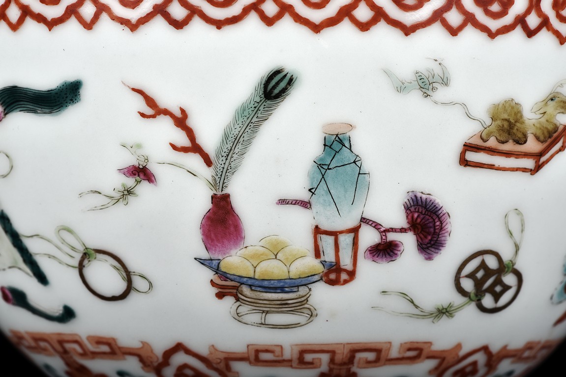 Supported on circular straight foot ring and rising with deep sides, the exterior finely decorated with eight emblems flanked by ruyi-bands, the base with Guangxu mark. Qing Dynasty period.