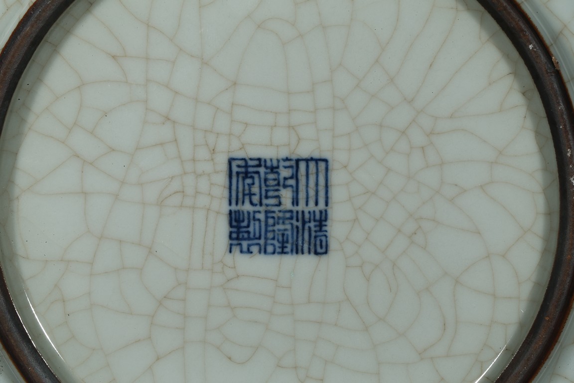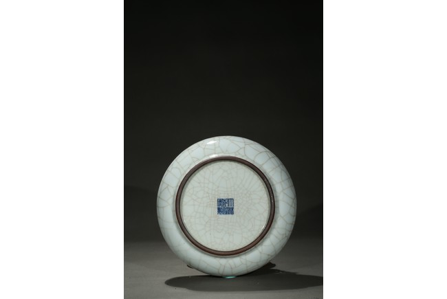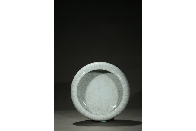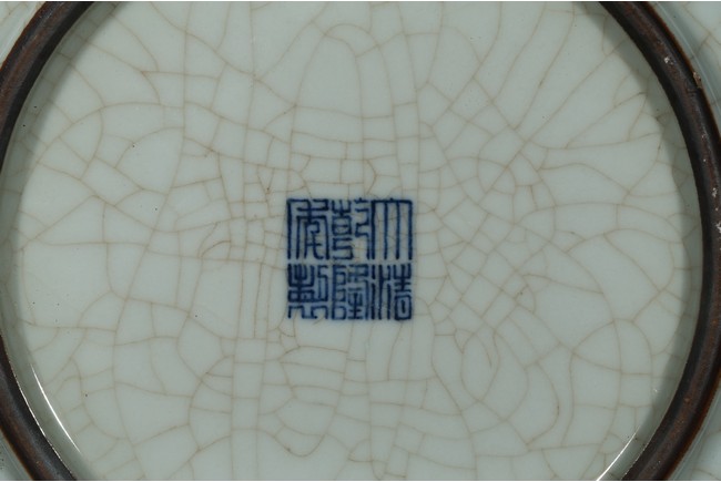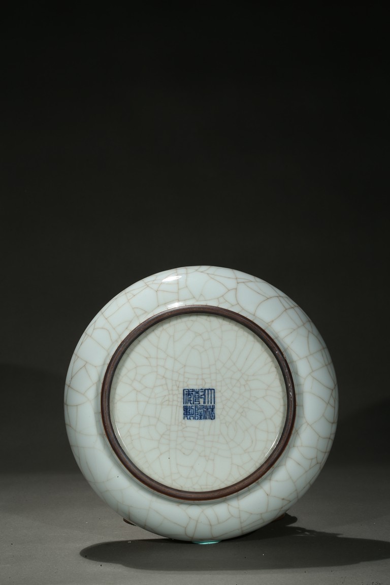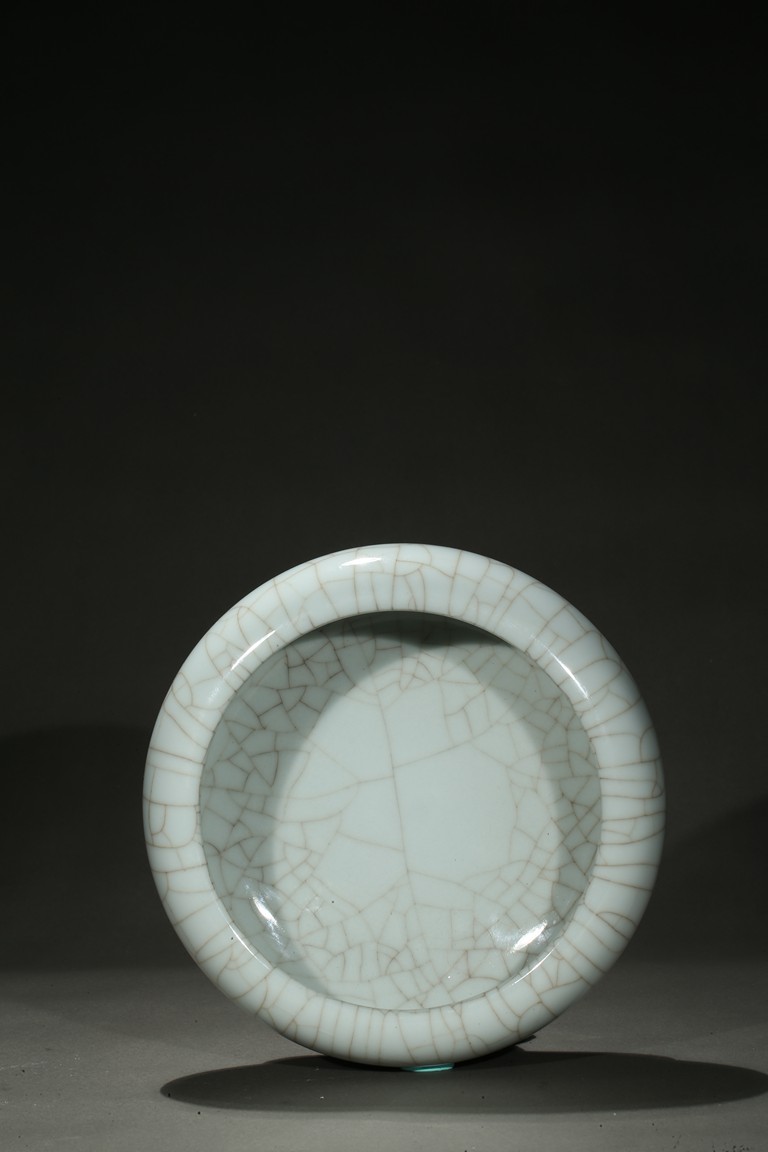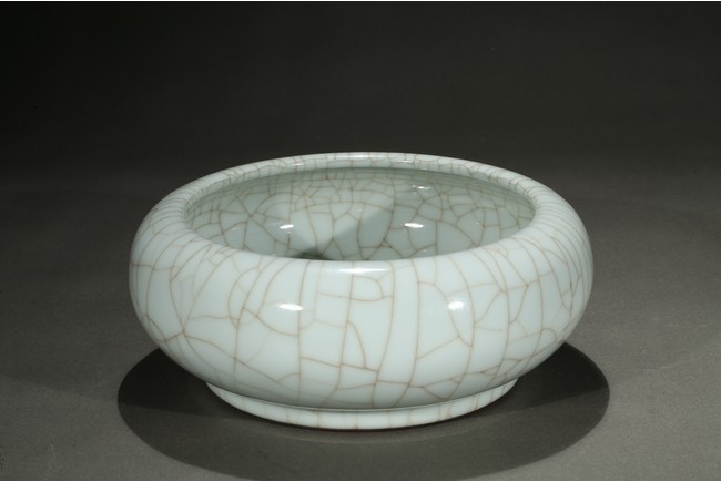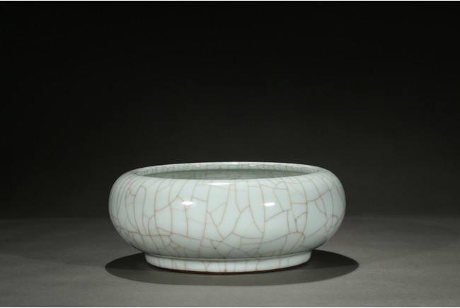 Of compressed globular form, the Ge-type washer with crackle patterns on the outside and inside over smooth white glaze, the base with apocryphal seal mark. Qing Dynasty period