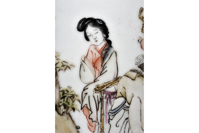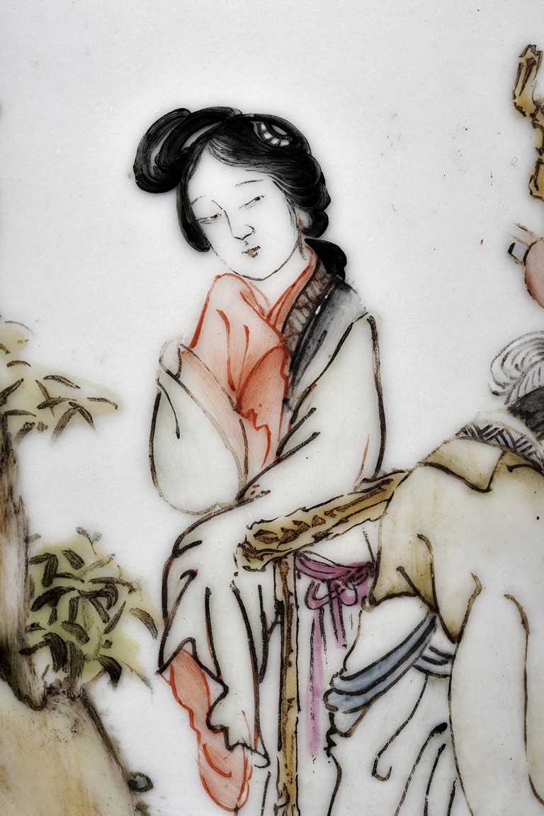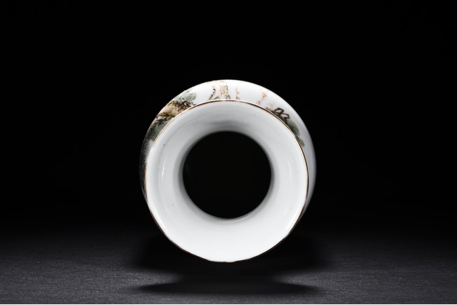 Potted with tapering form and waisted neck, rising to flaring rim, the body decorated with story scene of figures in a garden setting under pine tree, with inscription and seal of the artist's. The bottom with four character 'Guan Yao Nei Zao'. Late Qing Dynasty period.