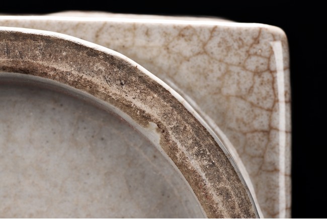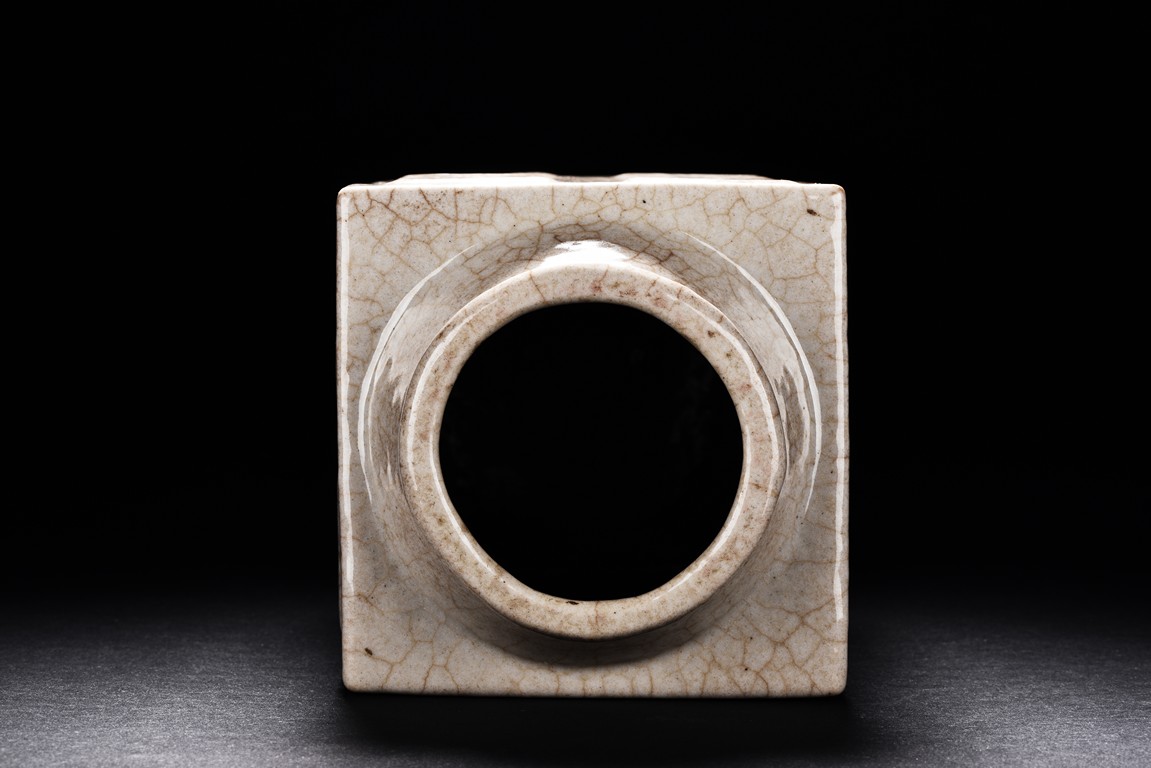 Of rectangular cong form, each side moulded in relief with bagua pattern, with fine crackles on the surface.