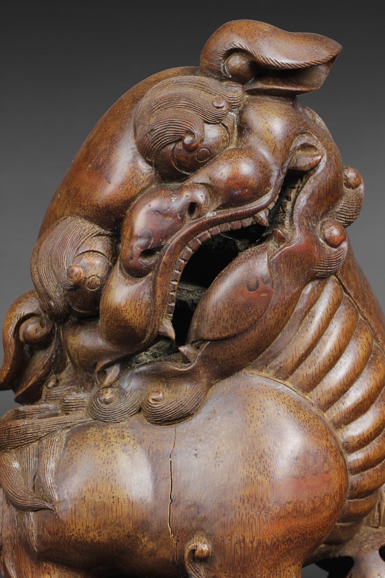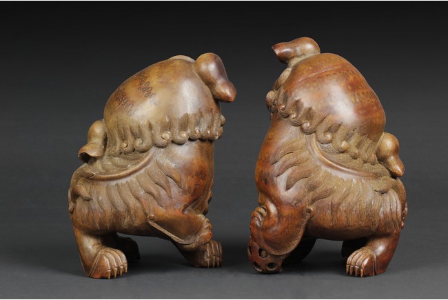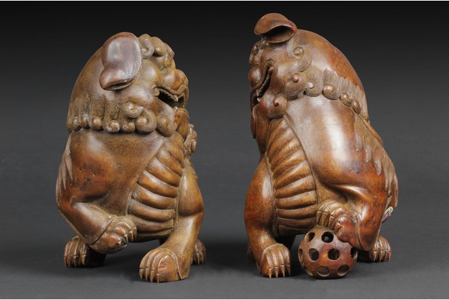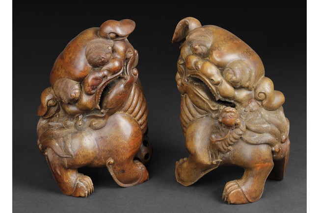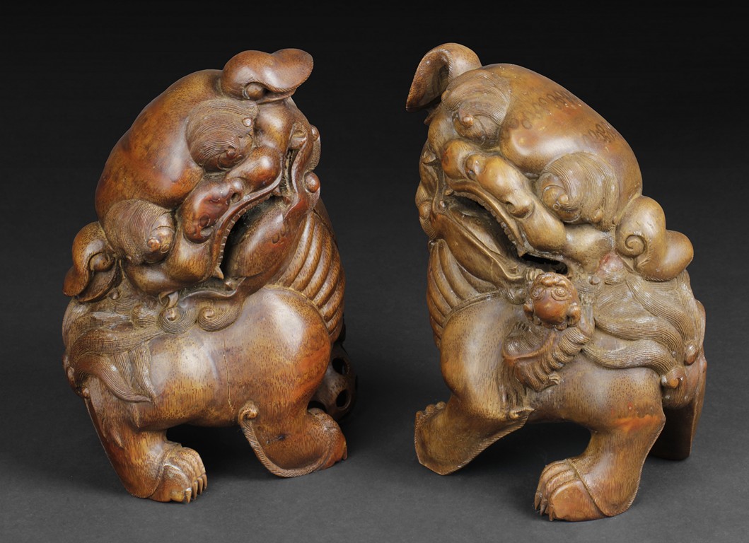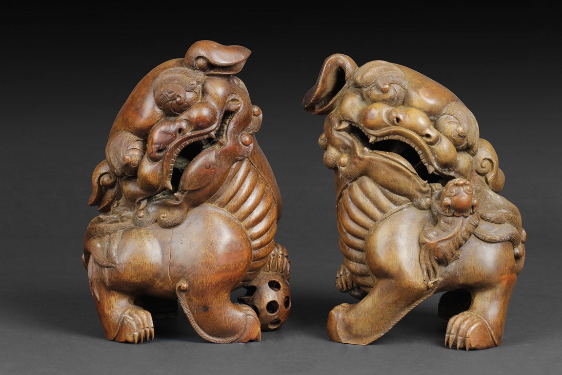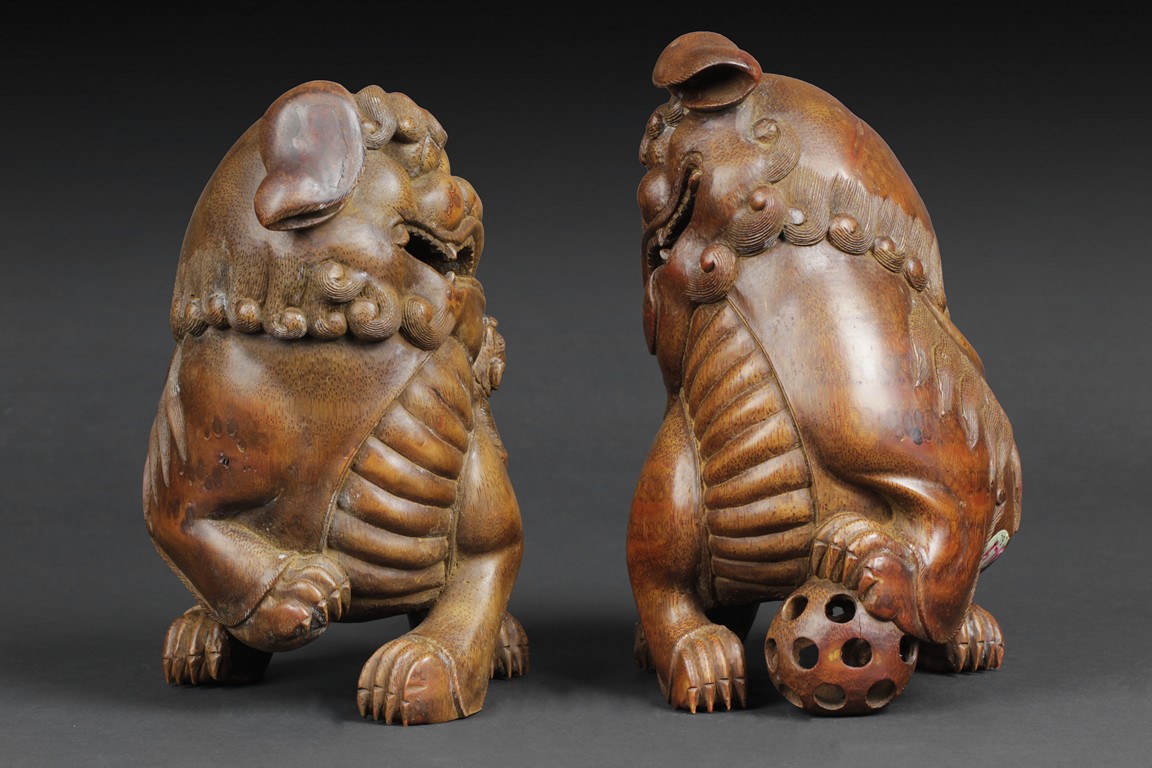 Both guardian lions depicted with head turning sideways and with a playful expression; the male lion holds a ball under his left paw, while the female lion has a small cub on her side. Qing Dynasty period.