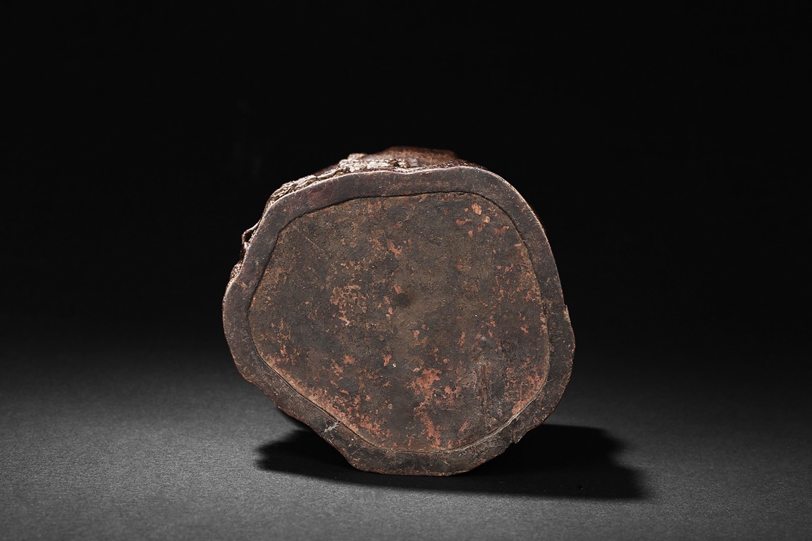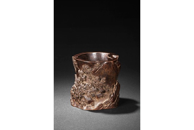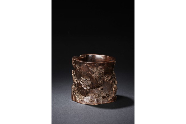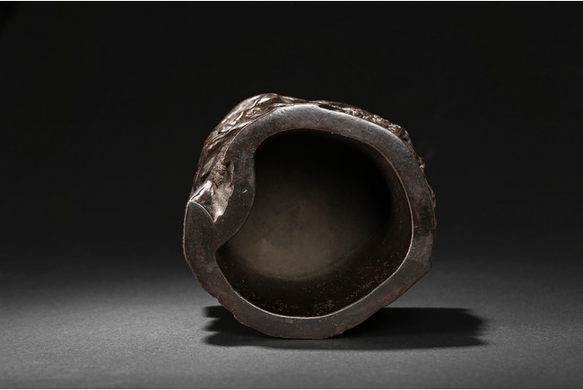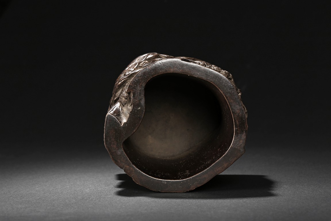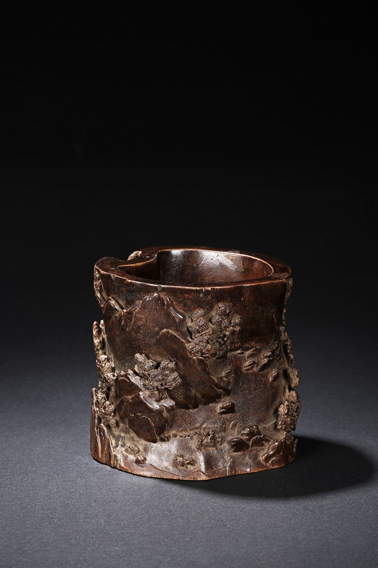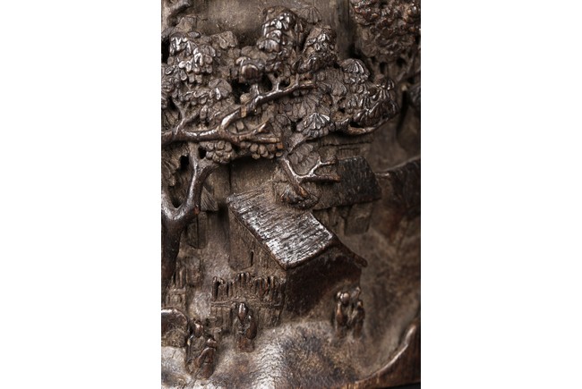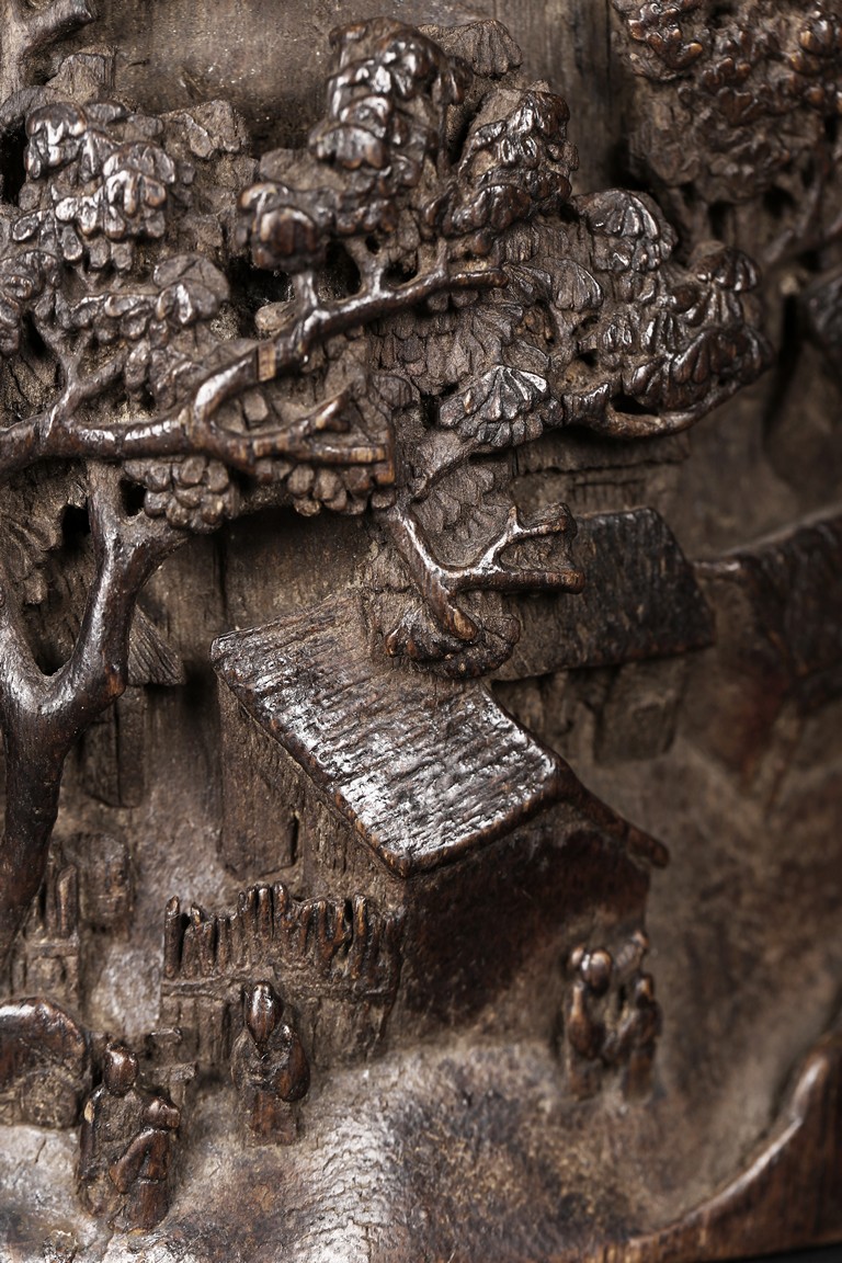 Of irregular form, the exterior delicately carved in relief with a riverside village scene in high relief, the wood is of dark brown tone with aroma.