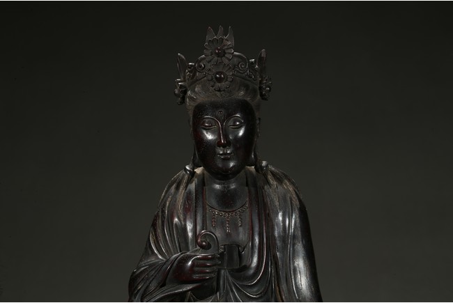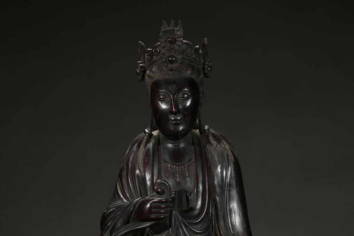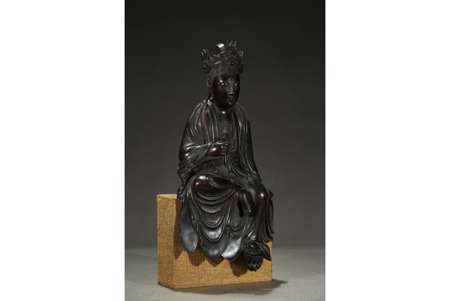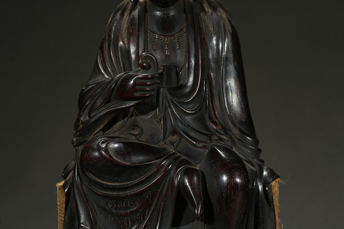 The Guanyin is shown seated in royal posture, one hand holding an attribute, wearing voluminous robe falling in elegant folds, face with serene expression, wearing a bejewelled crown. Late Qing Dynasty period.