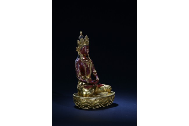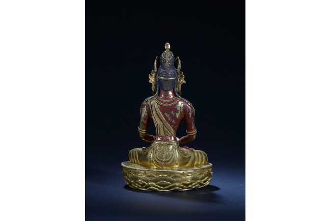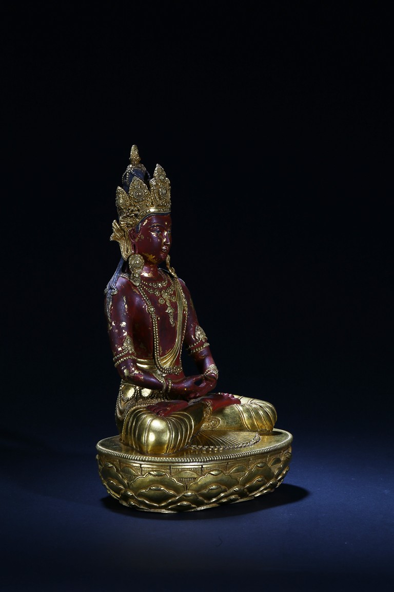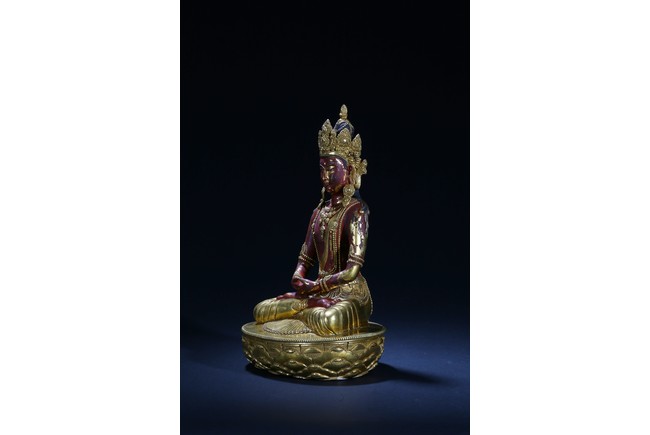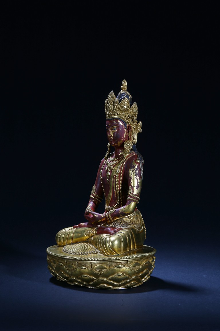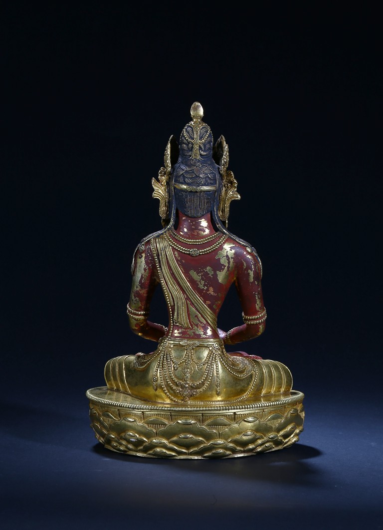 The bodhisattva is shown seated upon a lotus throne in dhyanasana, with hands held together ,dressed in loose-fitting robes decorated and adorned with jewelry. The hair is pulled up into a topknot behind a five-point foliate crown. The base is unsealed. Qing Dynasty period.
