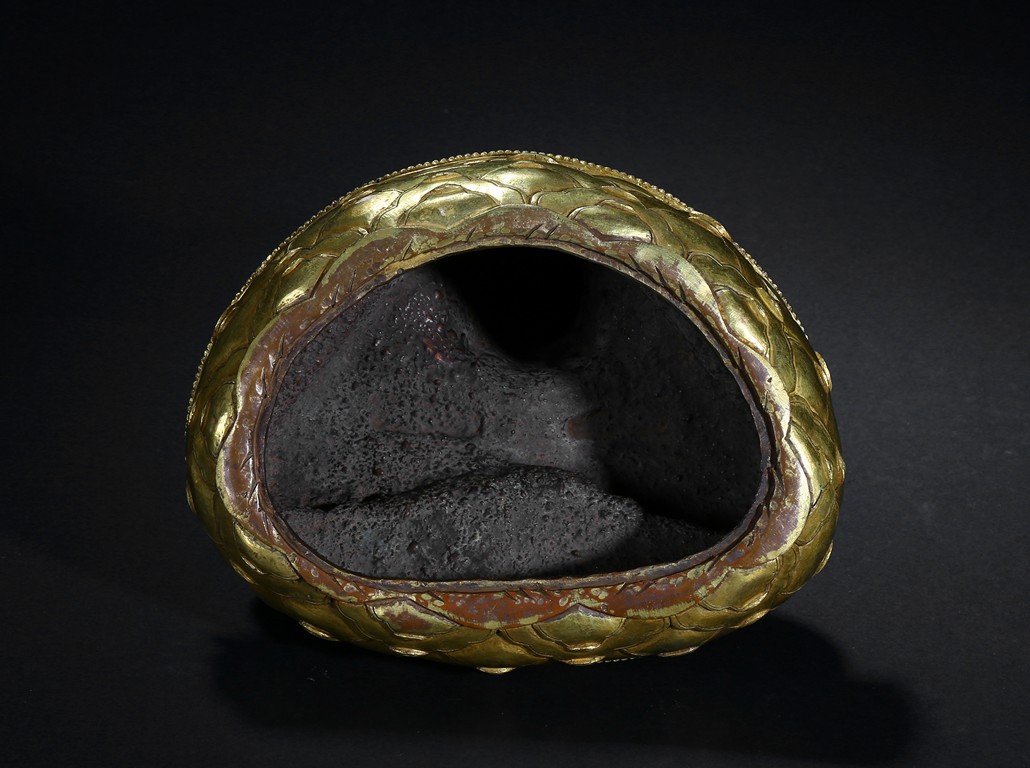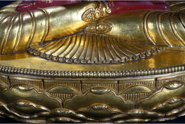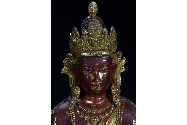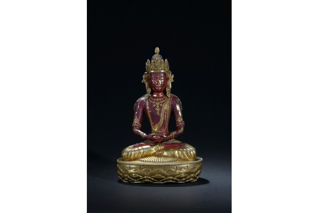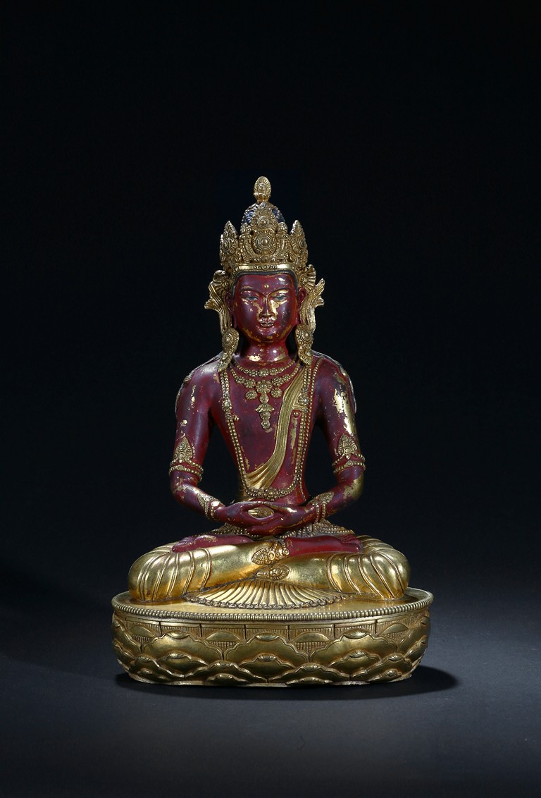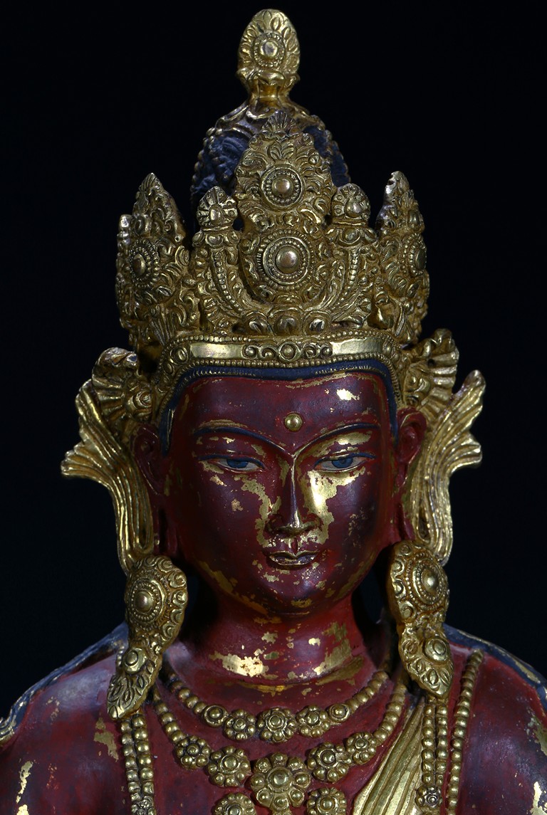 The bodhisattva is shown seated upon a lotus throne in dhyanasana, with hands held together ,dressed in loose-fitting robes decorated and adorned with jewelry. The hair is pulled up into a topknot behind a five-point foliate crown. The base is unsealed. Qing Dynasty period.