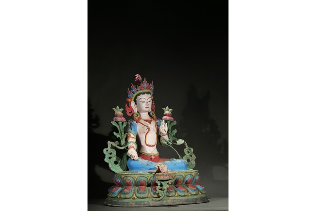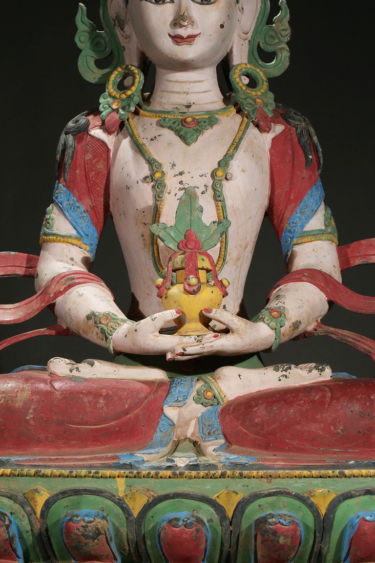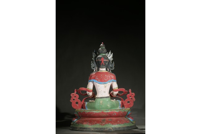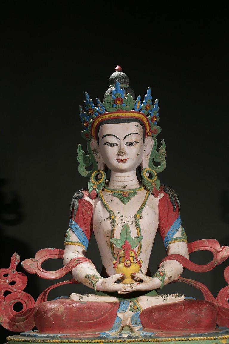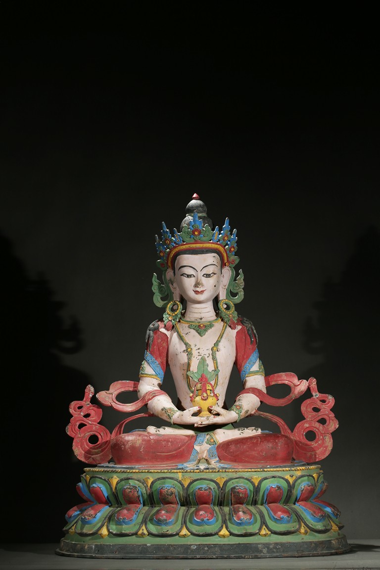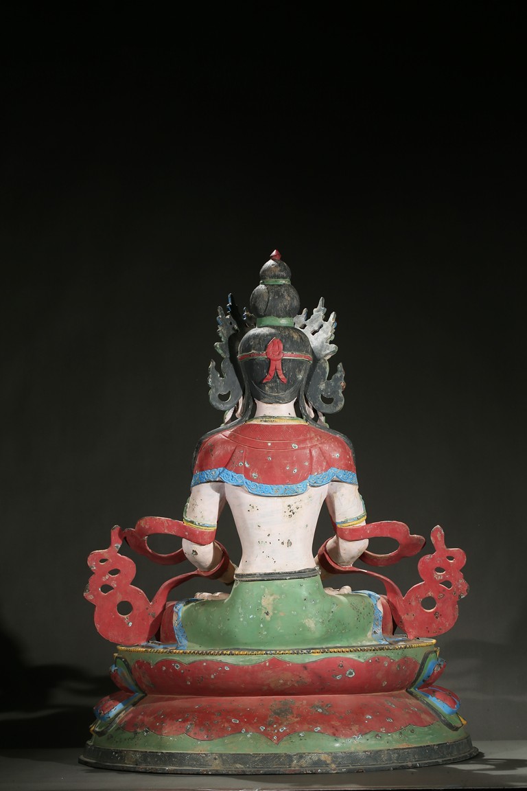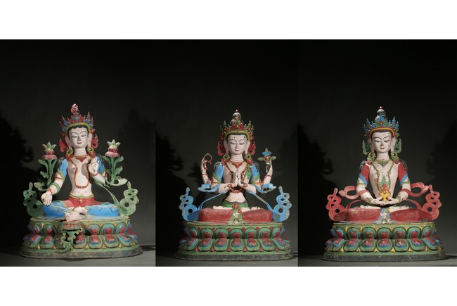 Consisting of three large painted bronze bodhisattva, each shown seated upon double lotus throne, the face with benevolent expression, all wearing pointed crown, overall painted with red, blue, yellow, and green pigments.