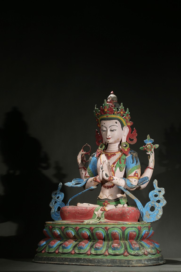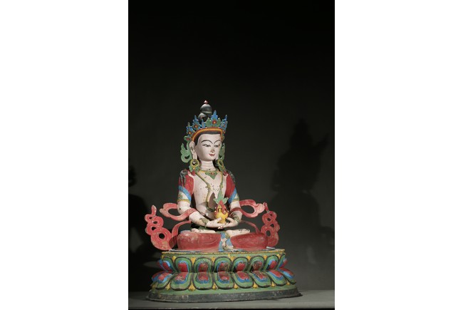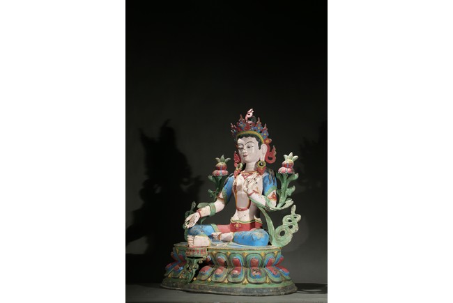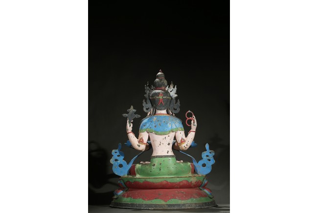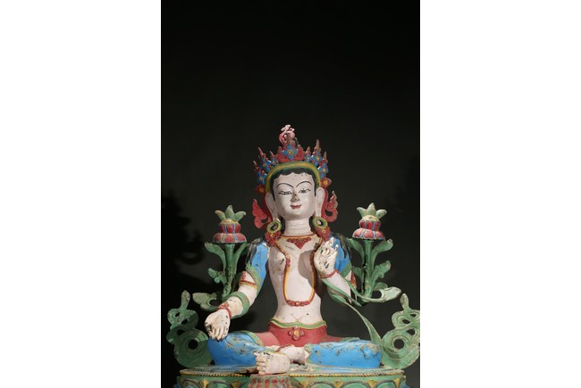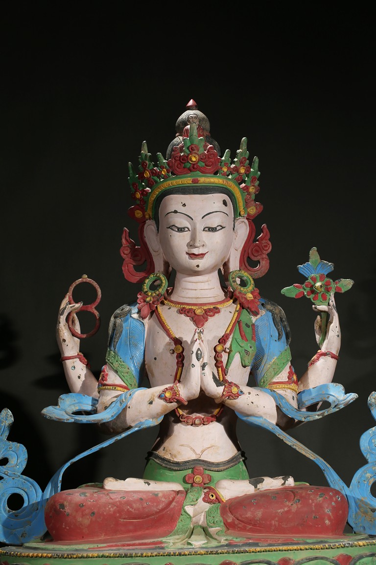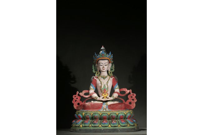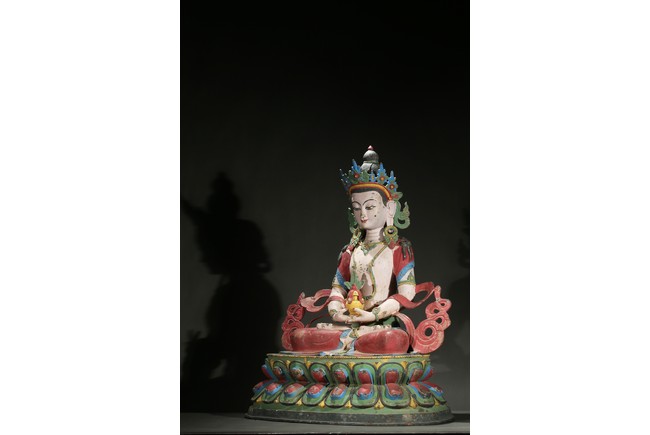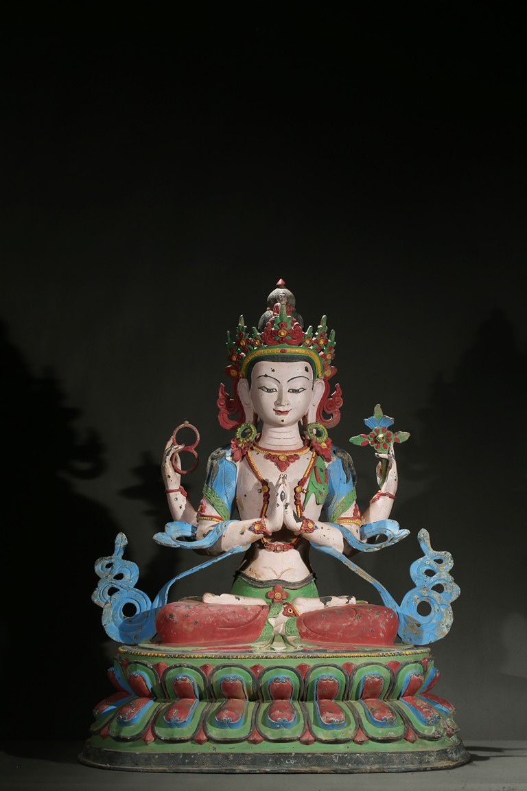 Consisting of three large painted bronze bodhisattva, each shown seated upon double lotus throne, the face with benevolent expression, all wearing pointed crown, overall painted with red, blue, yellow, and green pigments.