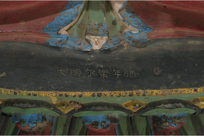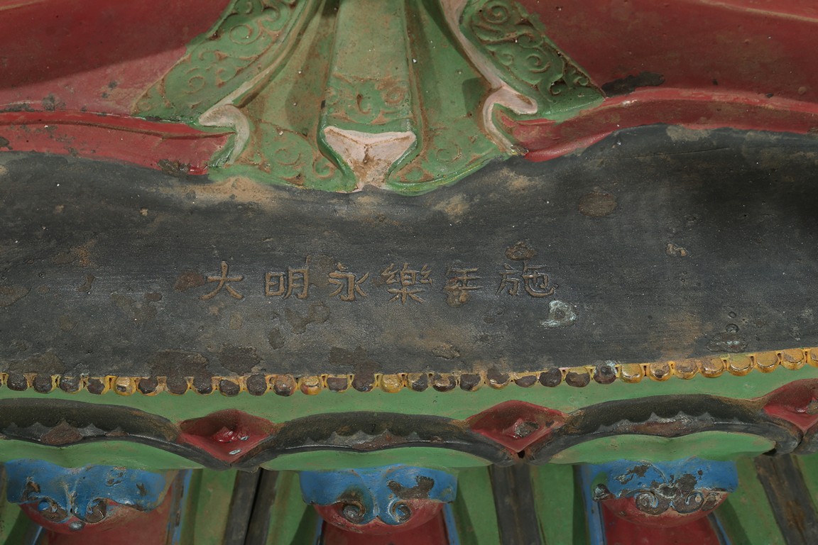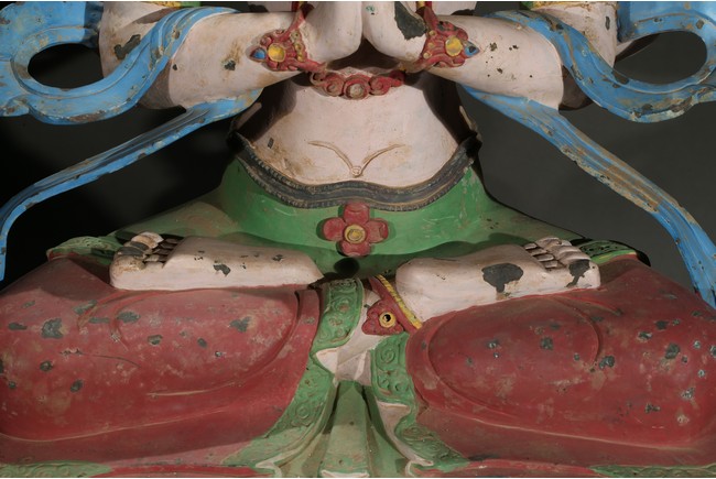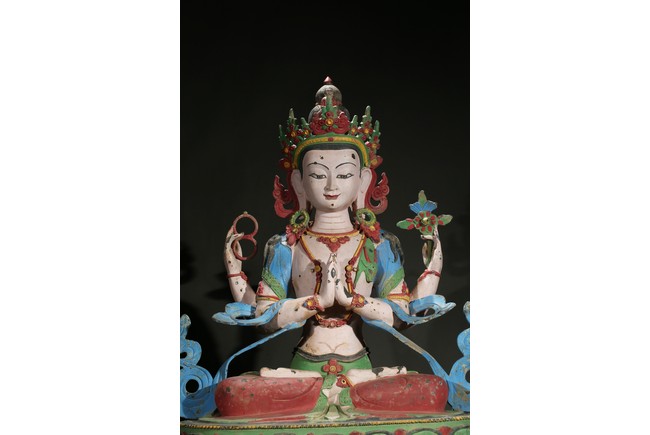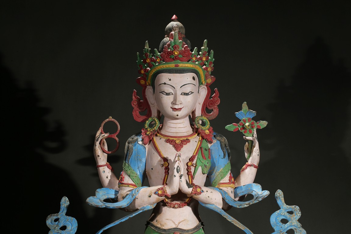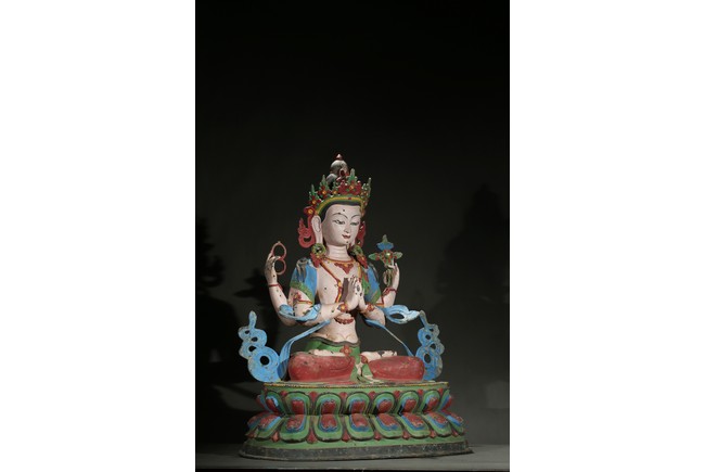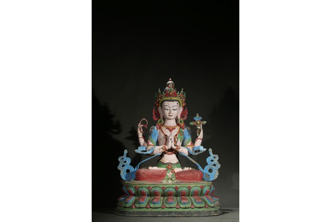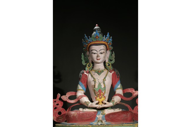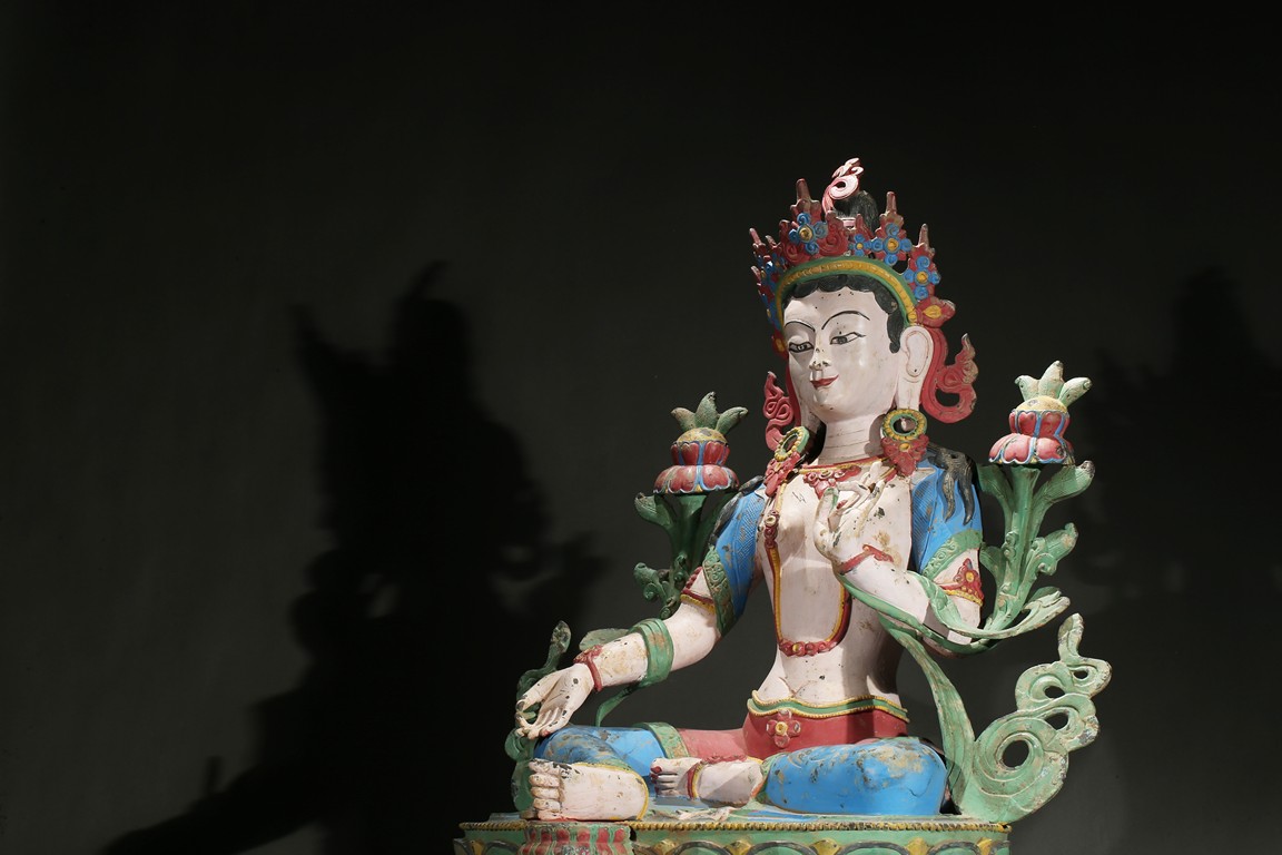 Consisting of three large painted bronze bodhisattva, each shown seated upon double lotus throne, the face with benevolent expression, all wearing pointed crown, overall painted with red, blue, yellow, and green pigments.