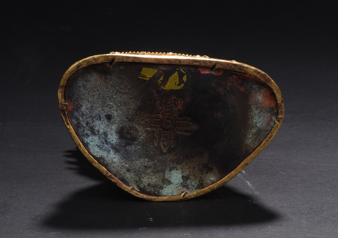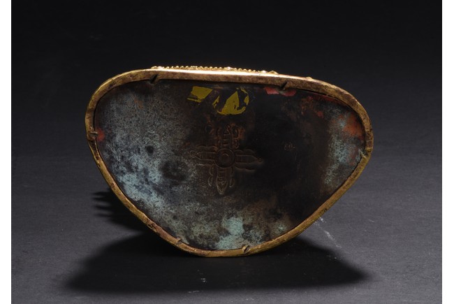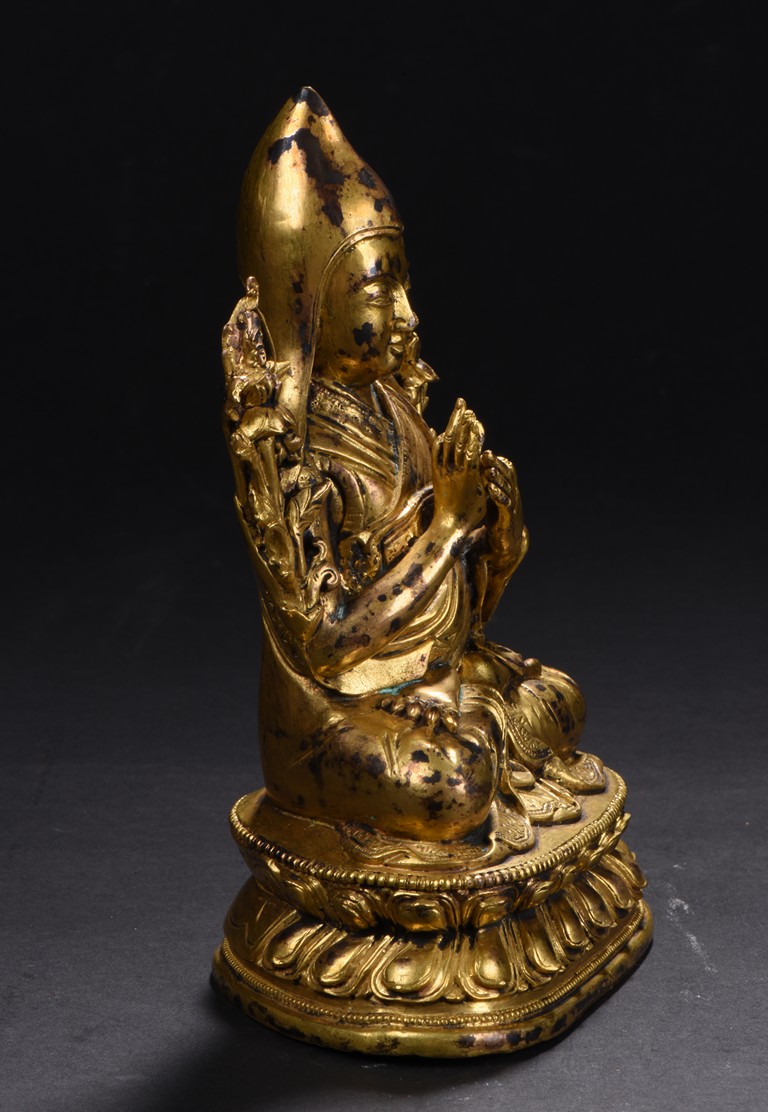 Seated in dhyanasana on an raised lotus base with his hands held in dharmachakra mudra, holding lotus stalks, wearing voluminous robes incised with floral scroll borders, his face with an benign expression and richly gilt overall. Qing Dynasty period.