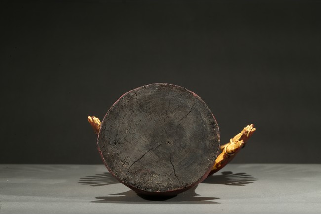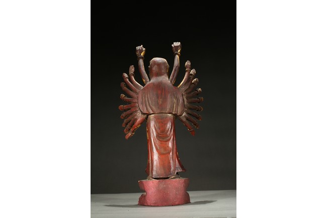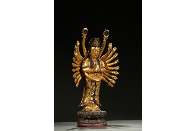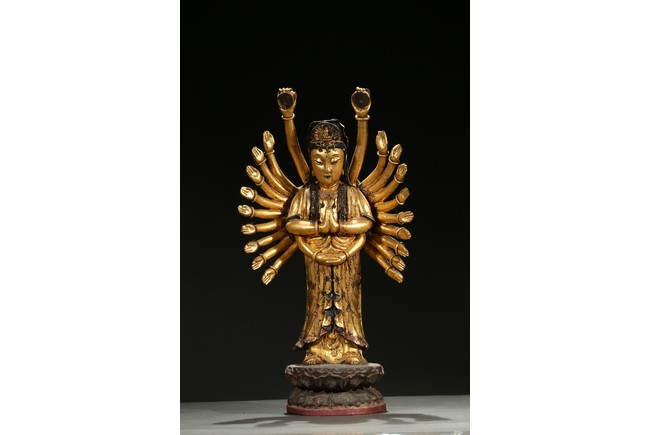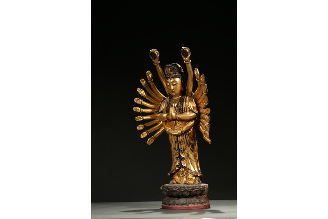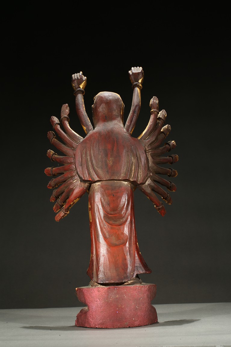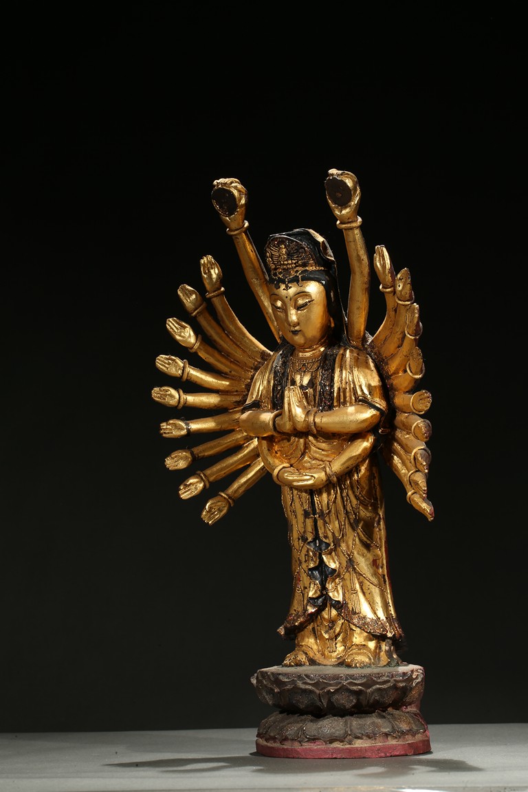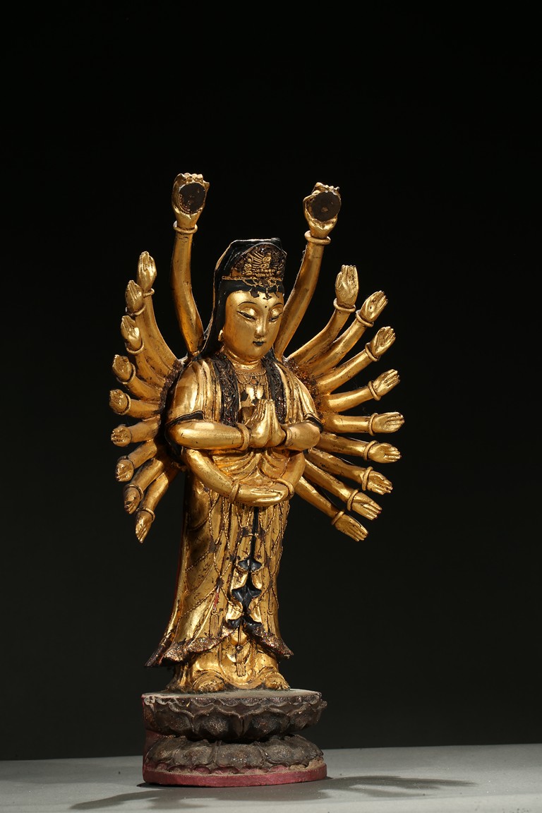 The multi-armed bodhisattva is shown standing on a double lotus throne with the primary hands held in the respectful gesture of salutation, anjali mudra, and the others radiating at the sides of the body, his face in benevolent expression with hair under veil. Qing Dynasty period.
