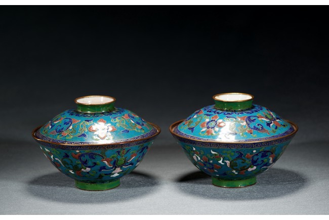 Each supported on short straight foot, the exterior of the body finely enamelled with scrolling lotus flanked by key-fret and lappet borders on both rims, all against turquoise ground, the domed cover enamelled in green, with four character mark inside. Late Qing Dynasty period.