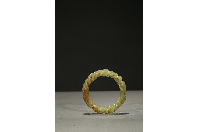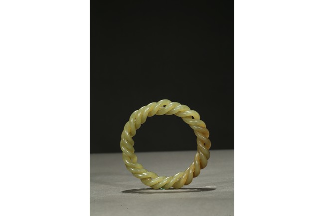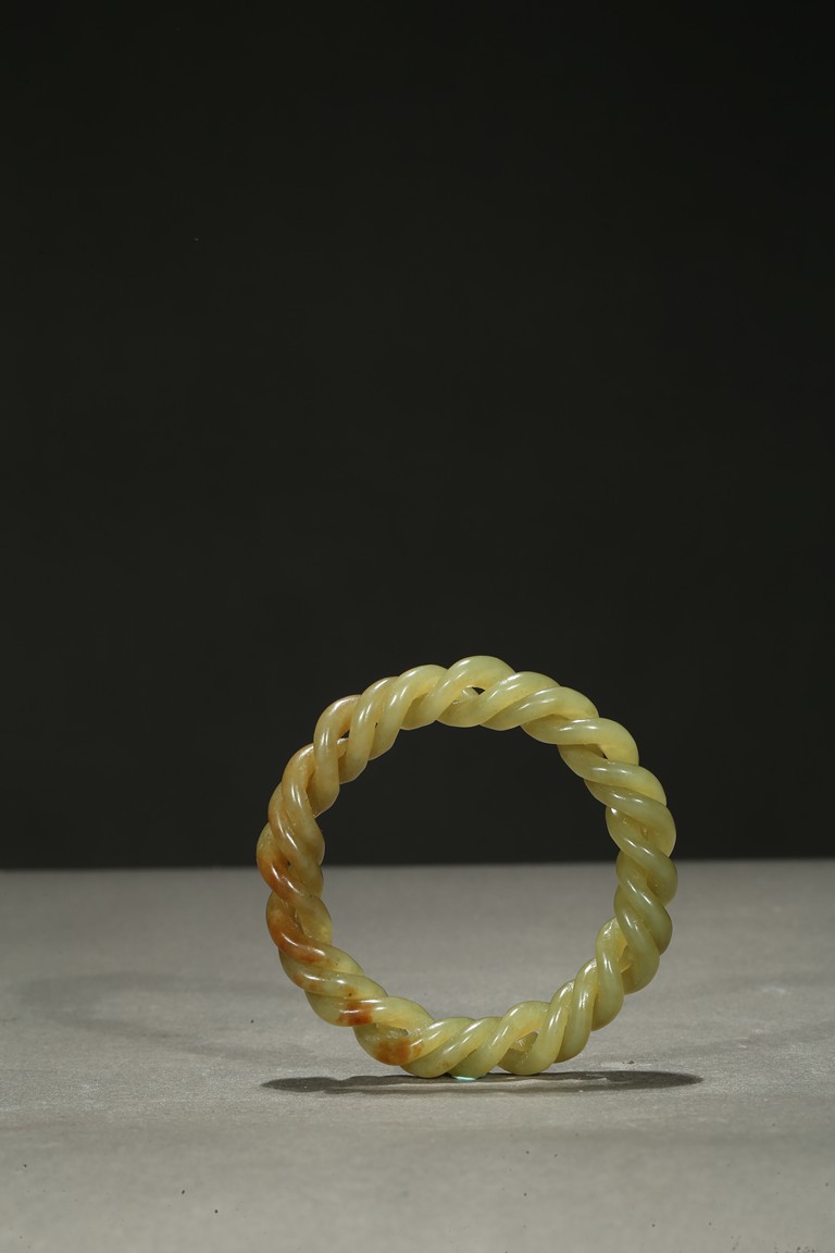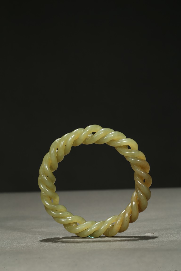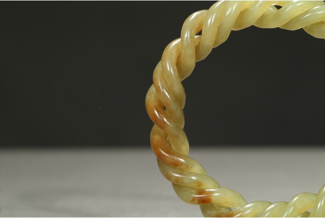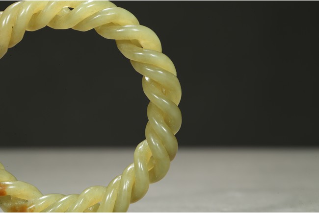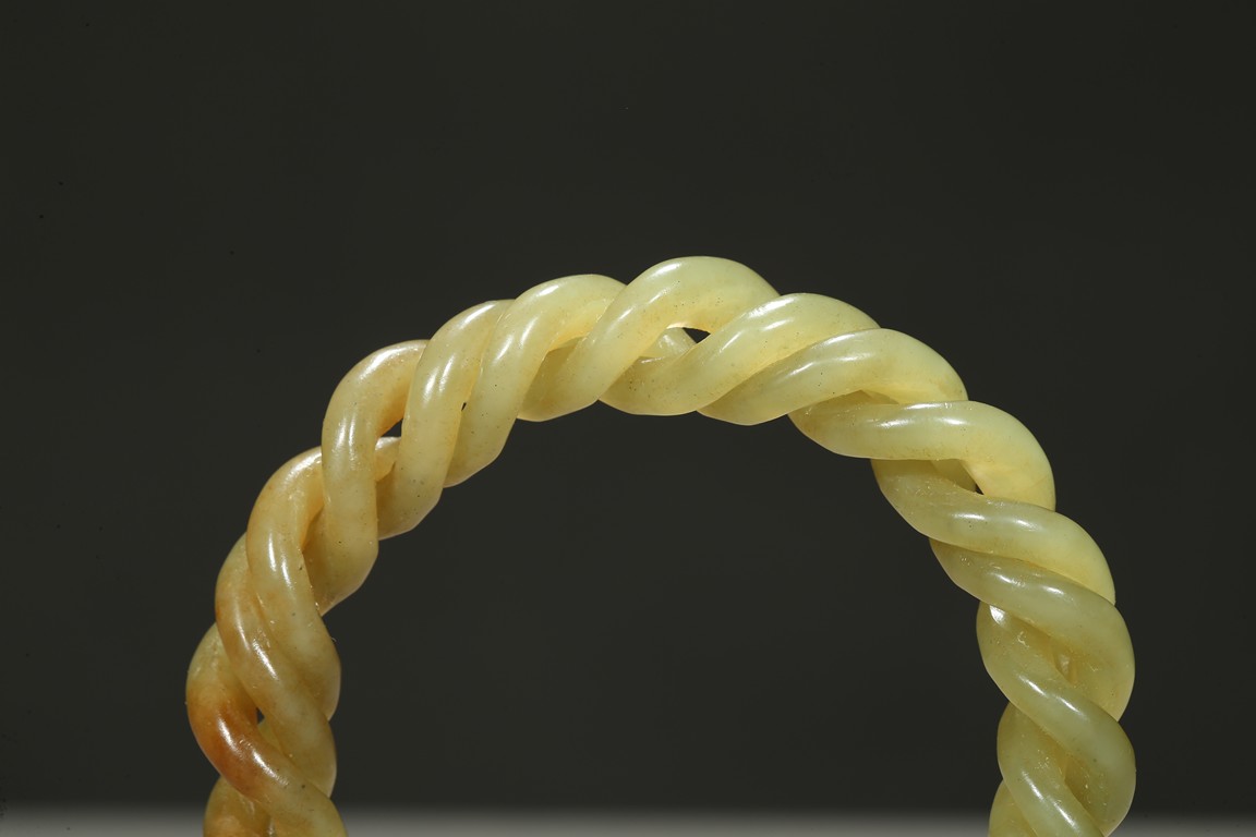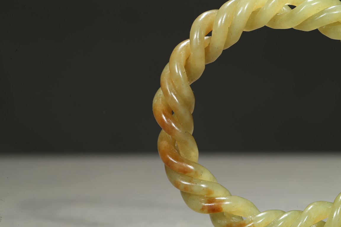 The bangle is carved in the style of twisted rope. The stone is of evenly yellow tone with slight russet markings. Qing Dynasty period.