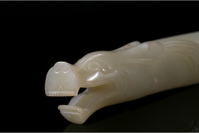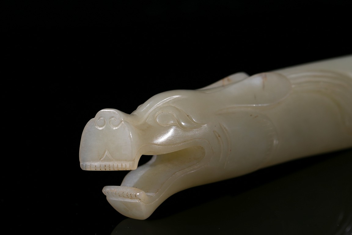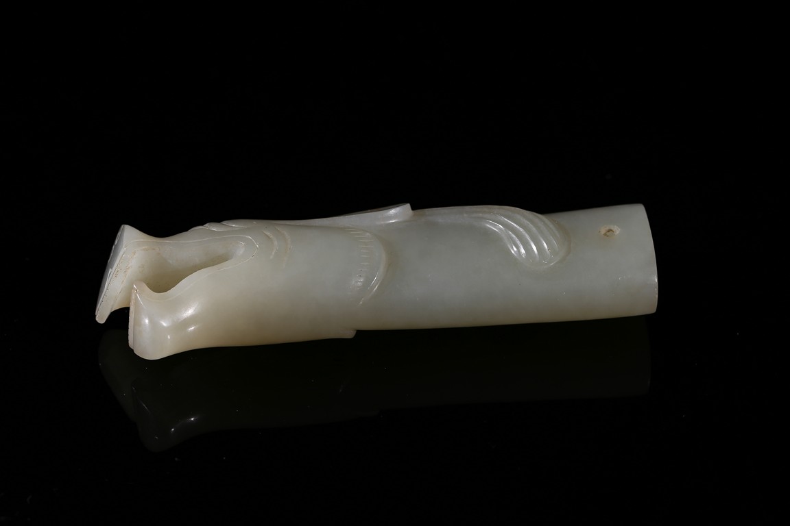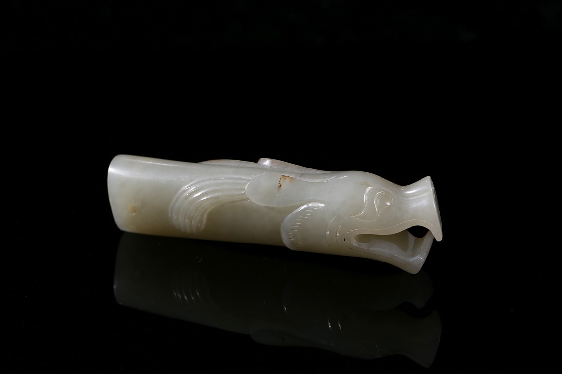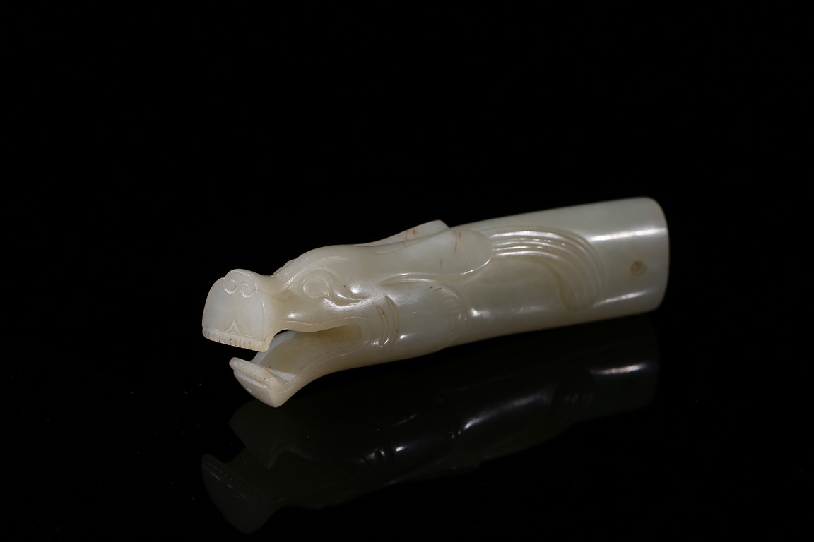 Modelled in the form of dragon head with mouth agape revealing tooth, its eyes and mane finely incised, with holes drilled toward the other end, the stone is of even white tone. Song Dynasty period.