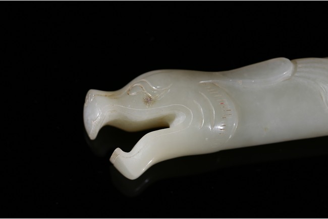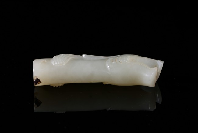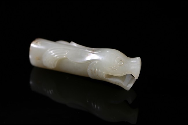 Modelled in the form of dragon head with mouth agape revealing tooth, its eyes and mane finely incised, with holes drilled toward the other end, the stone is of even white tone. Song Dynasty period.