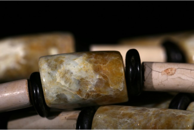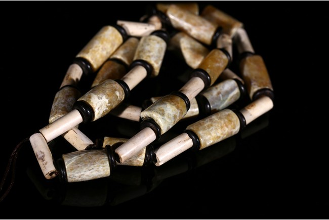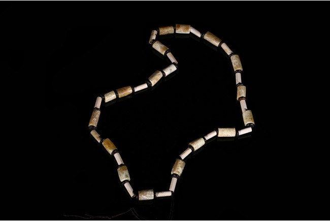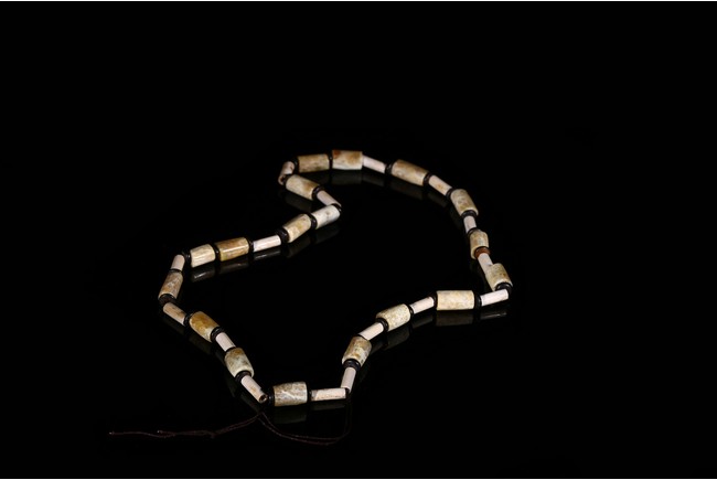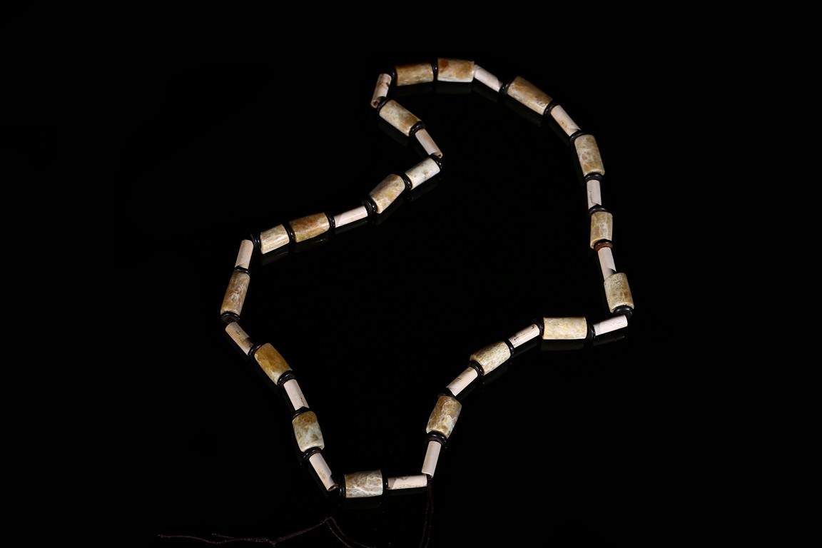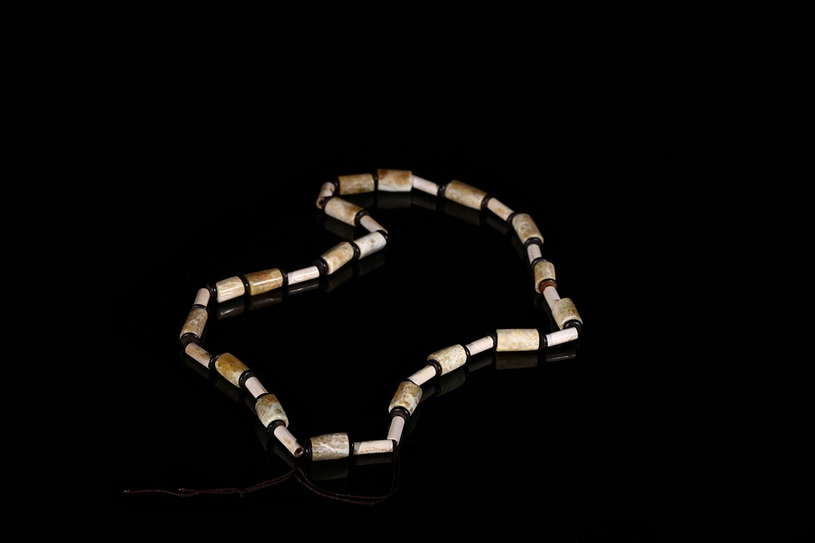 Consisting of thirty-four cylindrical archaic jade tubes of two types chained as necklace, one of larger size of celadon tone with russet and white veinings and inclusion, the other with smaller size overall white opaque tone. Liangzhu Culture.