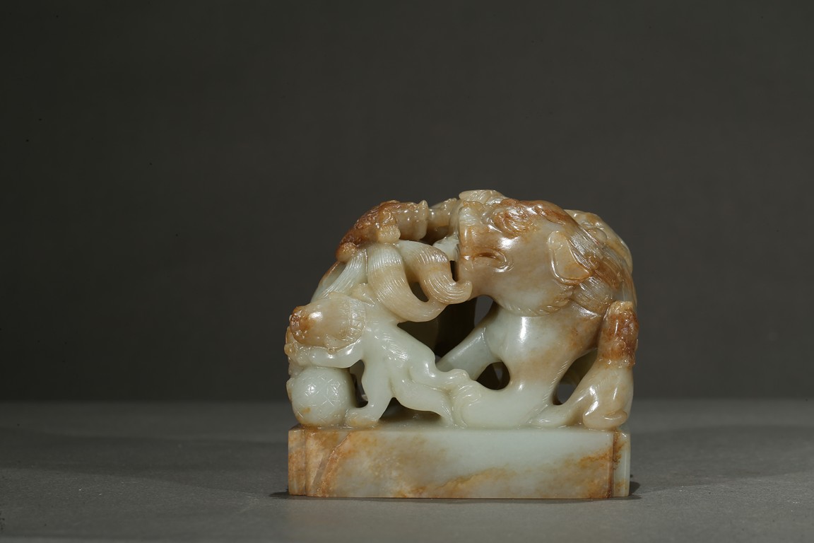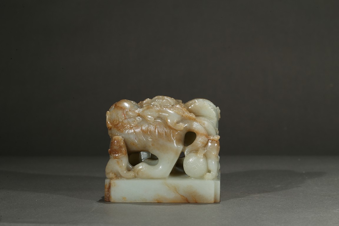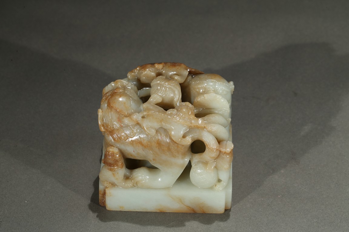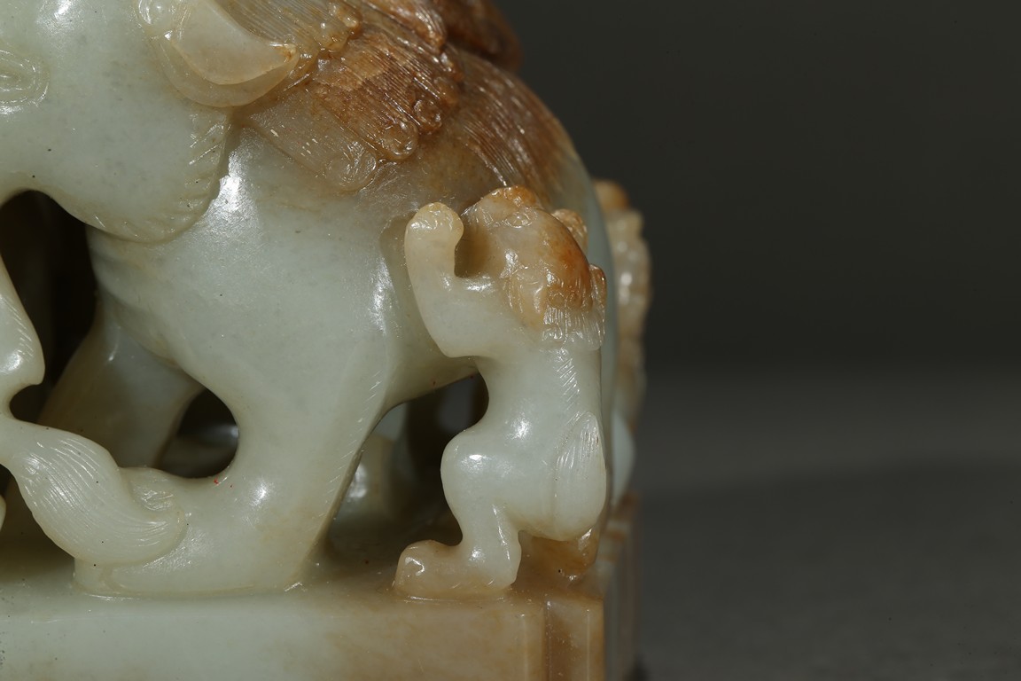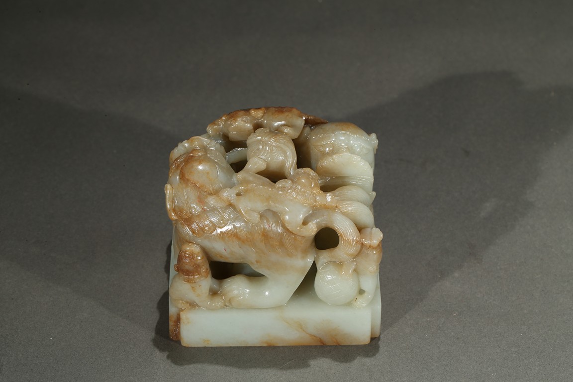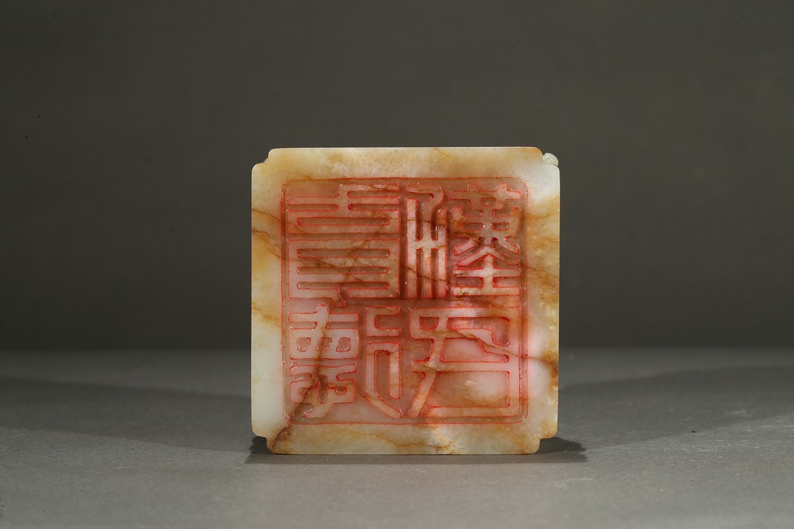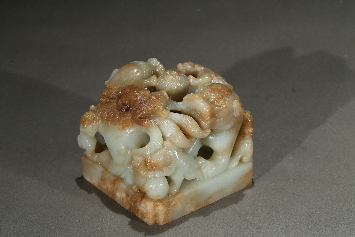Of square section, the top carved with nine buddhist lions around a brocade ball, the base with four character inscription, the stone is of white tone with extensive russet inclusions.