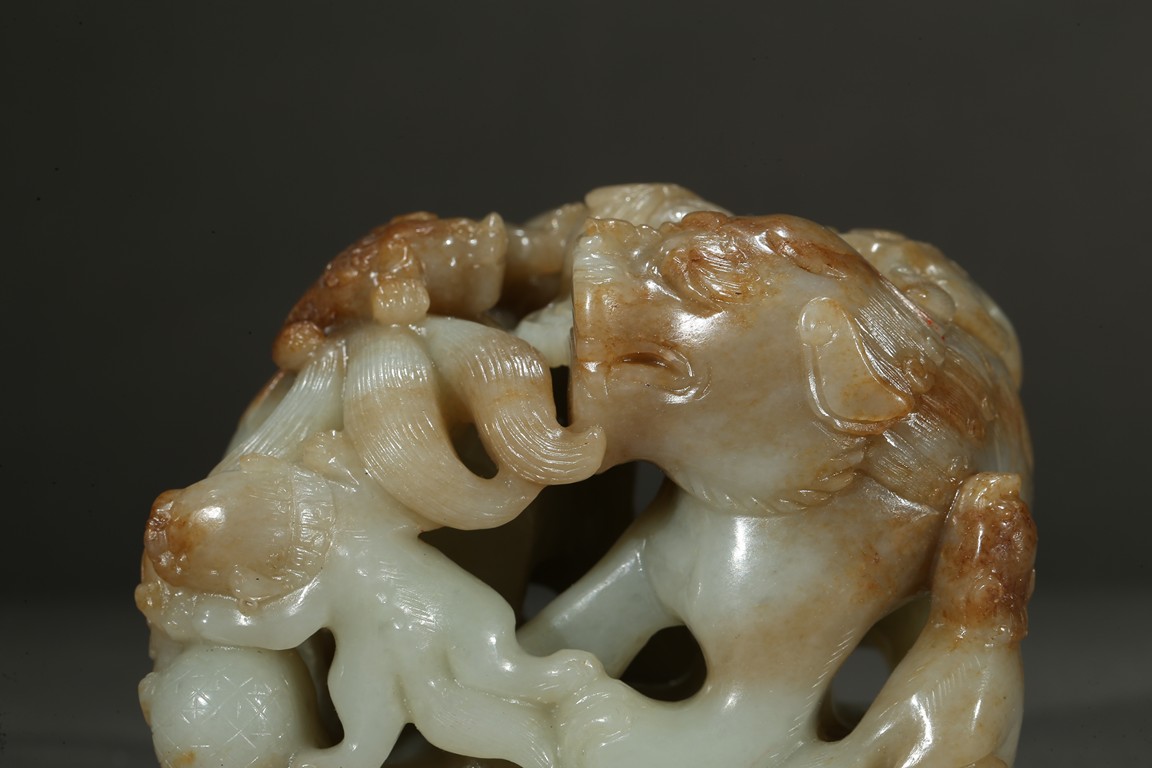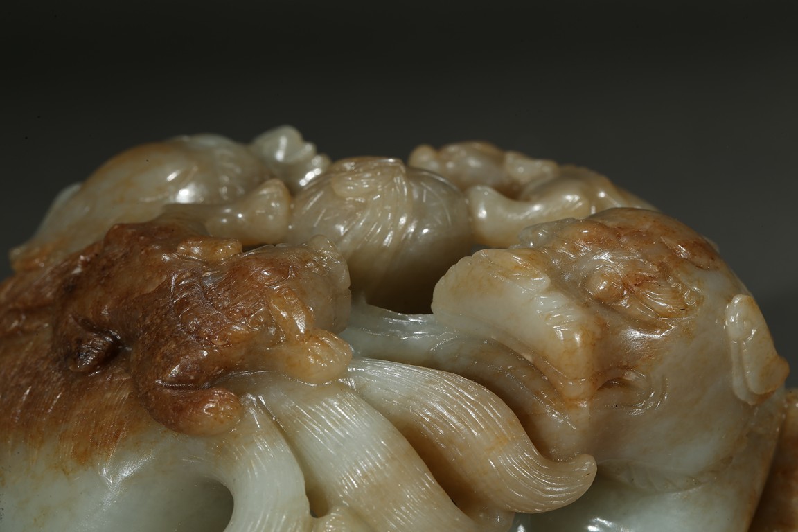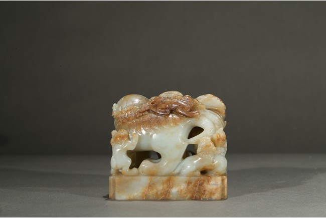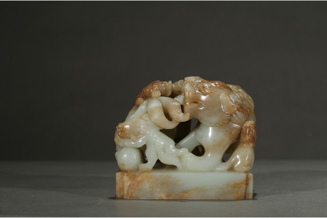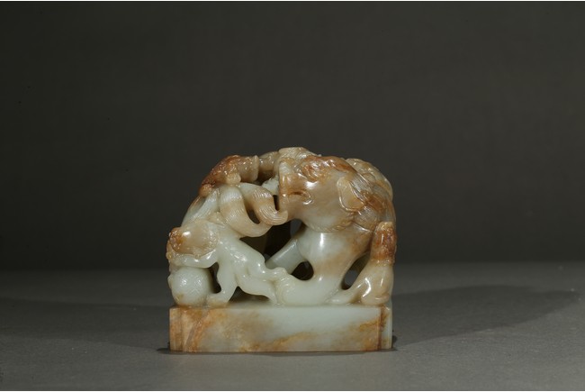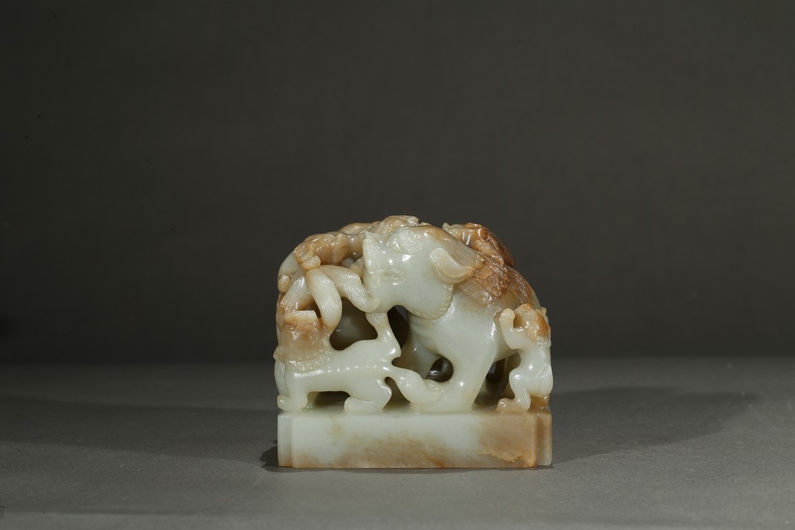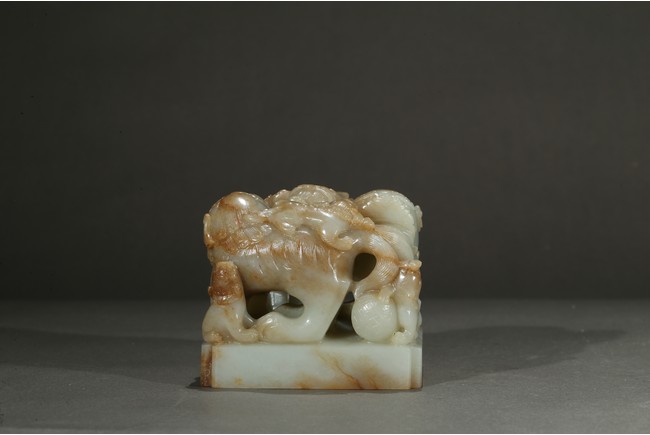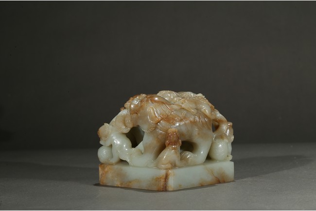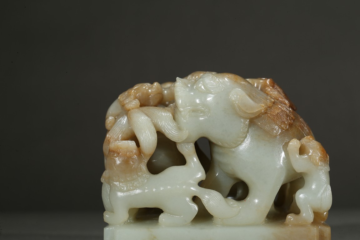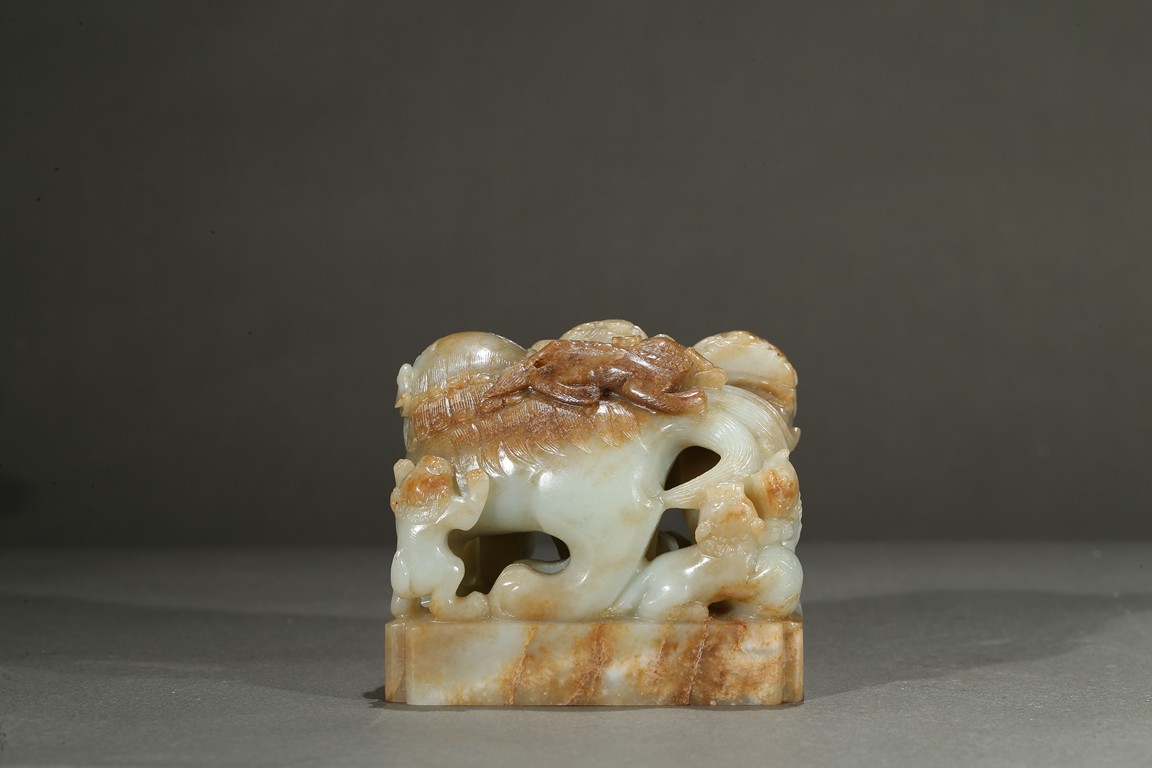 Of square section, the top carved with nine buddhist lions around a brocade ball, the base with four character inscription, the stone is of white tone with extensive russet inclusions.